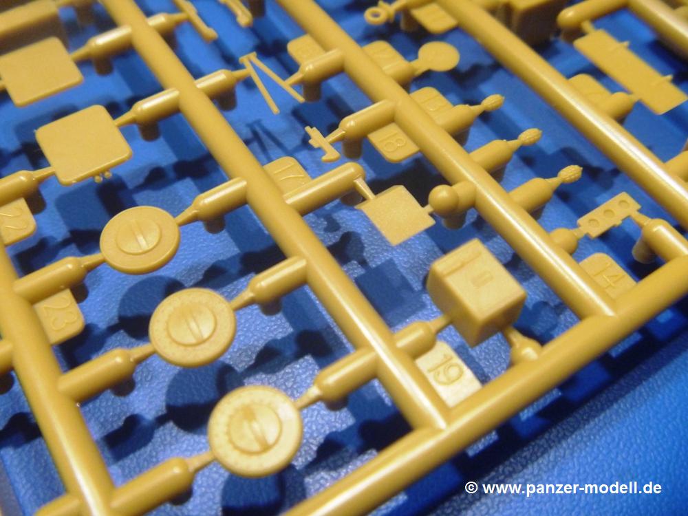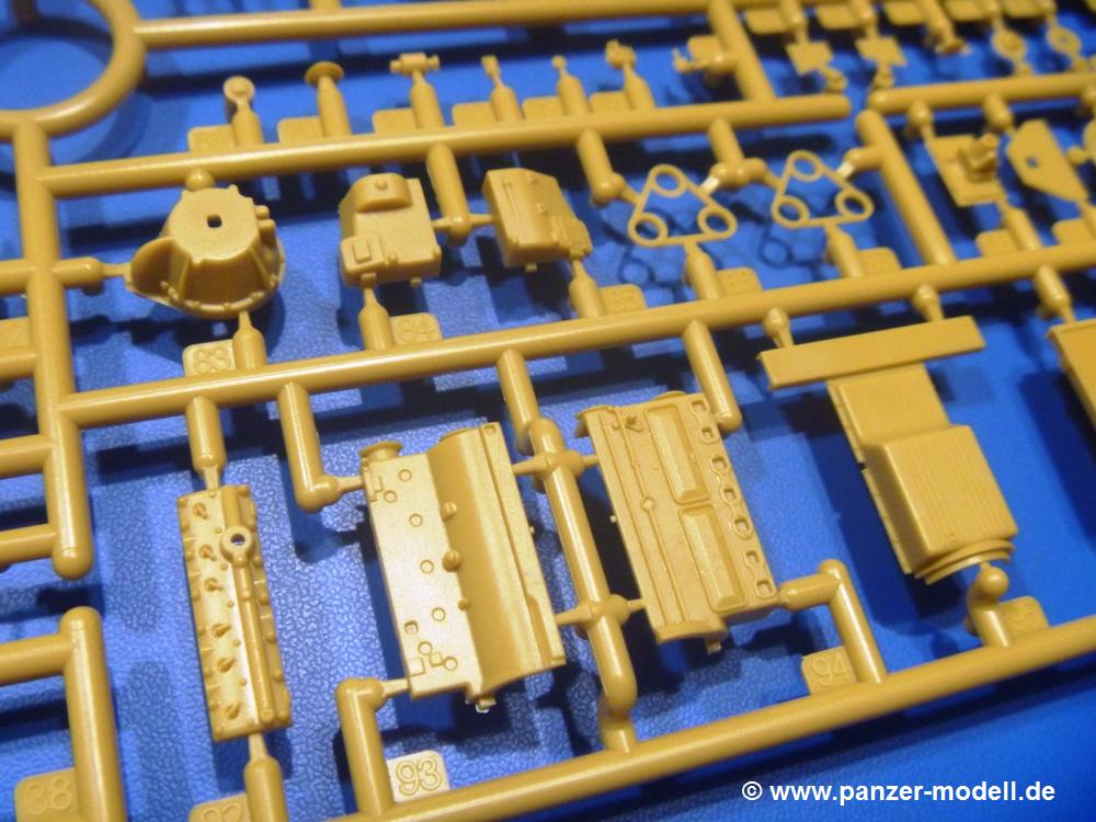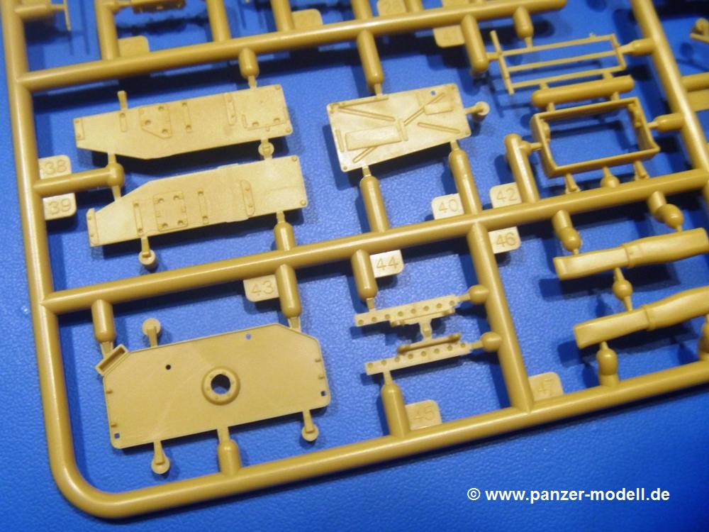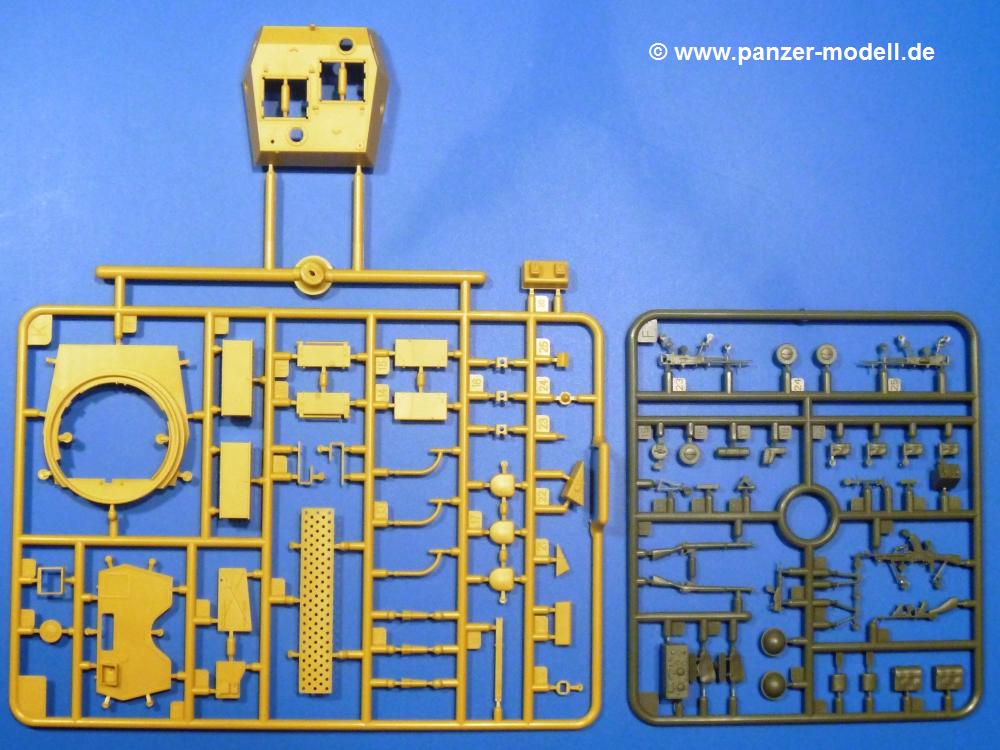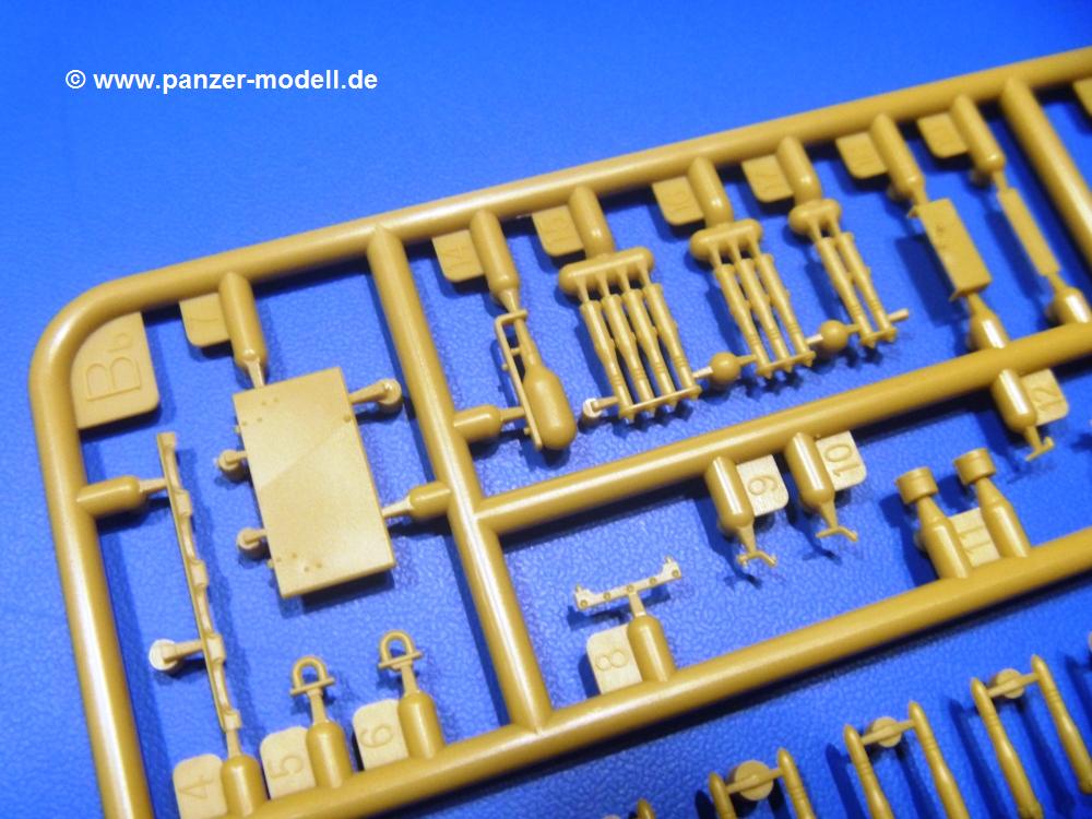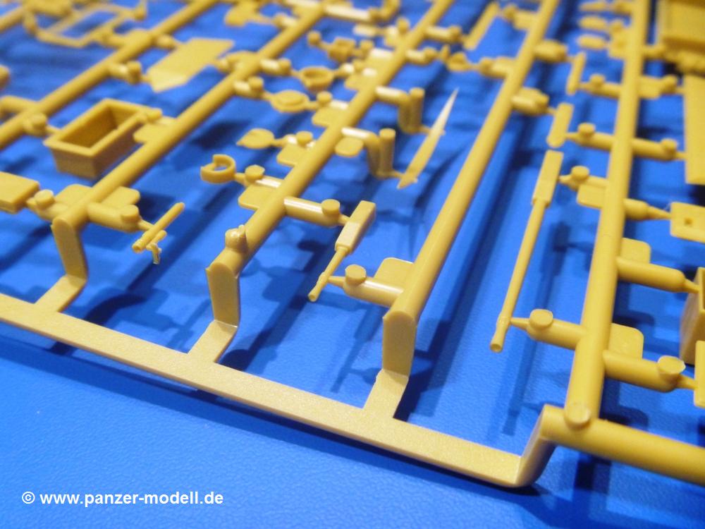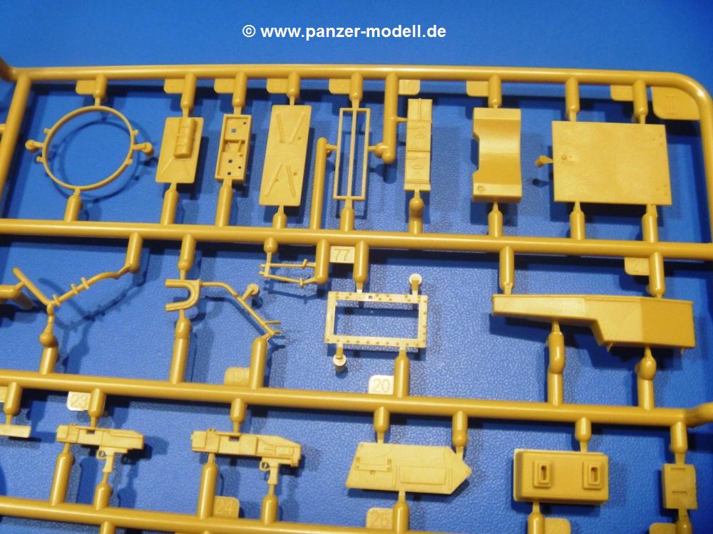 So, wie beschreibt man nun einen Bausatz der Superlative, ohne zu viel oder zu wenig zusagen? Beginnen wir beim Motor. Motorblock und Ölwanne sind selbstverständlich. Der Zylinderkopf ist mit feinen Verschraubungen versehen, Zündkerzenstecker sind angedeutet. Zuluft- und Auspuffkrümmer, Öleinfüllstutzen, Zündspule, Lichtmaschine (Generator), Doppelkeilriemen, -scheiben, Kühlventilator - alles da als separat anzubringende Teile. Allein die Lichtmaschine wird aus 6 Teilen zusammengesetzt und dazu gibt es auch den Keilriemenspanner. Der 6-teilige Kühler glänzt mit feinen Kühlrippen. Bronco hat die Schlauchverbindungen zum Motor nicht vergessen. Vergaser und Luftfilter bilden eine Einheit. Der Luftansaugschlauch führt zum Kampfraum, von wo der Motor sich seine Luft holt. An den Auspuffkrümmer schließt sich das Abgasrohr an, das in einem Schalldämpfer endet. Eigentlich fehlt nur die Verkabelung! An den Motor wird das Kupplungsgehäuse mit dem nachfolgenden Schaltgetriebe angeflanscht, das die Kraft über zwischengeschaltete Fliehkraftkupplungen an das Verteilergetriebe abgibt. Die Gimmicks hierbei sind, dass z.B. vom Allradschalthebel bis zum Verteilergetriebe das komplette Gestänge vorhanden ist. Man kann also am Modell die Verbindungen verfolgen. Vom Verteilergetriebe führen Kardanwellen zu den Achsen, deren Differentialgehäuse auch mit feinen Verschraubungen und Stützrippen ausgestattet sind. An der Hinterachse finden wir ein Bremsgestänge und einen extra Kontroll-/Einfüllstutzen für das Getriebeöl. Die Achsen ruhen auf Blattfederpaketen, die in ihre Lager ohne Klebstoff nur eingeschnappt werden, um die Beweglichkeit zu erhalten. Je Blattfederpaket gibt es noch einen Stoßdämpfer. Während die hinteren Stoßdämpfer sich an Lagern in Motorraum abstützen, bekommen die vorderen separate, außen an der Karosserie anliegende. Die großen Räder sind mehrteilig ausgeführt. Jedes Vorderrad besteht aus 9, jedes Hinterrad aus 6 Teilen! Zum einen dient dies der besseren Detaillierung, zum anderen um die Dreh- und Lenkbarkeit zu erreichen. Das komplette Lenkgestänge ist vorhanden und kann gemäß Anleitung funktionsfähig gebaut werden. Das "Rückgrat" des Fahrzeugs ist der Rahmen, der sich aus Längs-, Stütz- und Querträgern zusammensetzt. Für das Verteilergetriebe gibt noch mal einen mehrteiligen Hilfsrahmen, der in den eigentlichen Rahmen eingepasst wird. Auf dem Rahmen sitzt dann der Fahrzeugboden. Der Kampfraum wird vom Motor durch ein Brandschott getrennt. In dem Schott befindet sich eine Klappe, die geschlossen oder offen gebaut werden kann. Der Trick an der Klappe ist, dass die Besatzung durch sie hindurch greifen konnte, um den Ver-/Entriegelungsmechanismus der großen Motorklappe zu bedienen. Natürlich ist dieser Mechanismus vorhanden und kann aus 8 Teilen in geöffneter oder geschlossener Version gebaut werden. Lässt man die Motorklappe offen, wird man auch später noch sehen können, dass sich neben 2 Tanks auch noch Batteriekasten, Ölnachfüll- und andere Behälter im Motorraum befinden. Auch im Fahrerraum kann man sich austoben, dabei ist der Sitz noch das größte Teil. Schalt-, Feststellbrems- und Allradschalthebel sind vorhanden. Dies gilt auch für mehrteilige Pedalerie. Lenkrad, -stange, -getriebe inkl. Verbindungen zum Lenkgestänge sind da. Die Armaturentafel zeigt Details wie Lichtschalter und Instrumente (Laut Bauschritt 7 liegen Decals für die Instrumente bei. Dem ist aber nicht so!) plus eine Kartenleuchte. Der restliche Innenraum ist mit Feuerlöscher, Munitionskasten, -halterungen, Feldflasche, Leuchtpistole und einigem mehr ausgestattet. Die Seitensichtklappen sind einteilig, aber sehr schön detailliert, die Fahrersichtklappe dafür 14-teilig. Sie kann offen oder geschlossen gebaut werden. Die beiden Seitentüren können geöffnet oder geschlossen gebaut werden. Die rechte kann aber nur bei Option 1 mit dem Ersatzrad auf dem Bug geöffnet werden. Auch der Turm geht als eigenes Modell durch. Natürlich sind Waffen komplett und mit Munitionskästen und Hülsenfangsäcken, -kasten ausgestattet. 3 Sitze der Turmbesatzung, Turmseitenschwenkwerk, Handgranatenhalter aus PE Teilen mit separaten Handgranaten, Abfeuerungsmechanismus der 2 Nebelwurfrohre in der Blende, Seitensichtluken mit Öffnerhebel, Aufbewahrungskästen, Trommelmagazinhalterungen, Turmbelüftung und ein sehr schönes Funkgerät mit Schutzgitter und Verkabelung sind weitere Innendetails. Die Dachwinkelspiegel sind aus Klarsichtmaterial, werden aus mehreren Teilen zusammengesetzt und können gedreht eingebaut werden. Für die faltbaren Turmluken gibt es die Optionen offen oder geschlossen. Für den Suchscheinwerfer an der Turmfront gibt es eine Klarsichtscheibe. Die MG-Rohre sind bereits aufgebohrt, die Blende kann höhenbeweglich gebaut werden, bleibt aber beweglich, nur wenn man im Inneren die Hülsenfangsäcke weglässt oder durch flexibles Material (nicht im Bausatz enthalten) ersetzt. Weitere Details außen am Turm sind die durchbohrten Nebelwurfrohre, die Abdeckung des Turmlüfters, MG-Halterung samt MG und die Antennen. Außen am Fahrzeug finden sich Werkzeuge wie Schaufel, Brechstange, Hackenstiel und Wagenheber, Feuerlöscher, Außenspiegel, Hupe, Begrenzungsleuchten, Fahrscheinwerfer, Hebe- und Zurrösen, eine Halterung für ein Sandblech und dasselbige, verschiedene Stau-, Munitions- und Kraftstoffbehälter und das Ersatzrad. Die Anbringung der letzteren hängt von der Optionswahl ab. Das Abschleppseil aus dem beiliegenden Bindfaden wird mittels 2 Haken in die seitlichen Haltegriffe eingehängt. Der Decalbogen liefert die Außenmarkierungen für vier Fahrzeuge. Es fehlen die Instrumentenanzeigen und die Plaketten für Kästen und Feuerlöscher, die in die Bauschritten zwar angegeben sind, aber nicht auf dem Bogen erscheinen. Varianten: