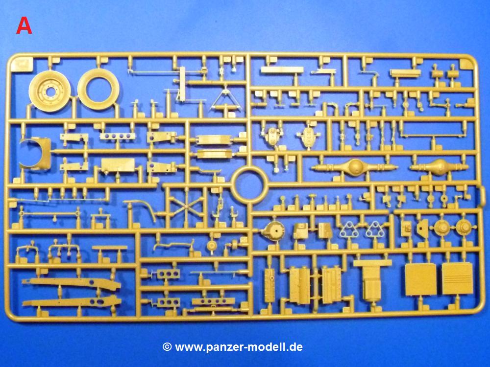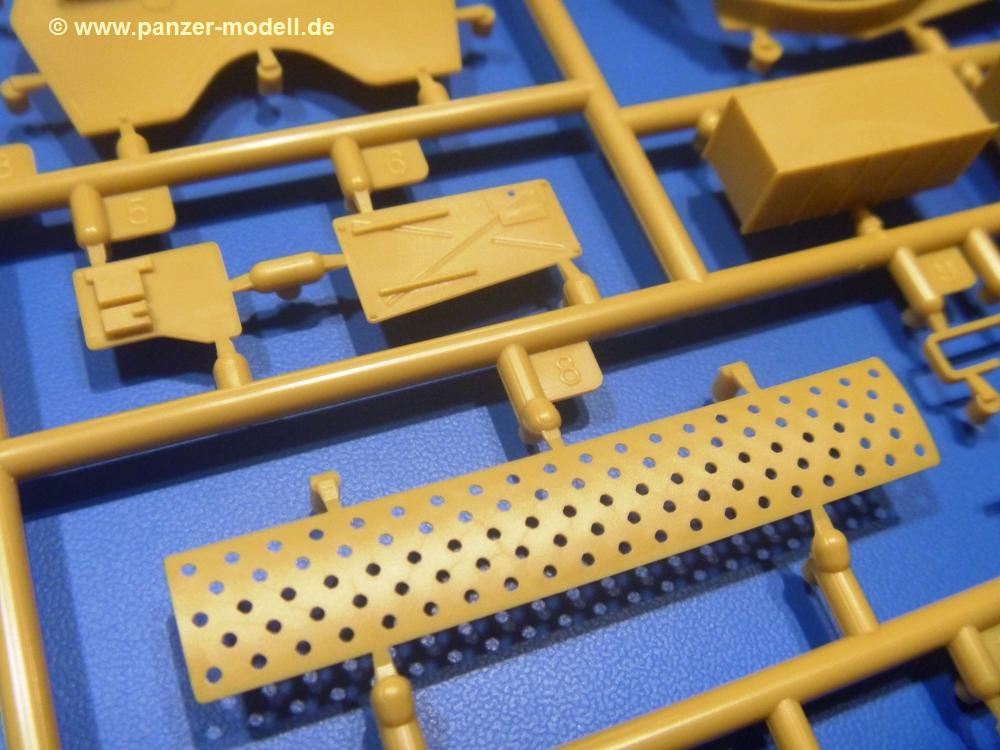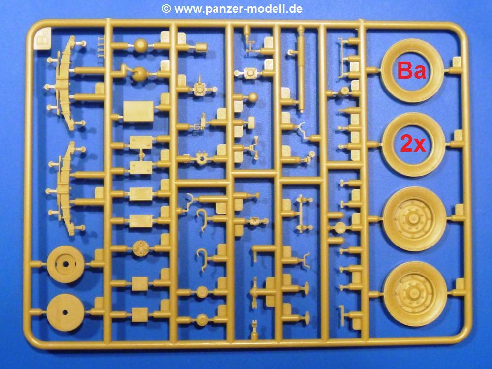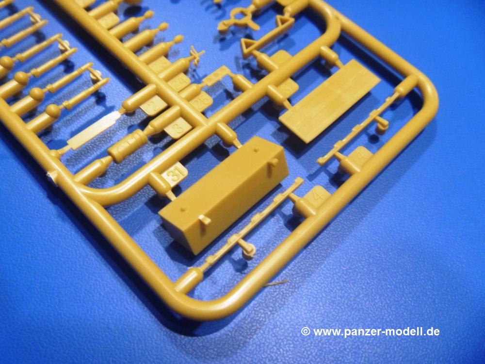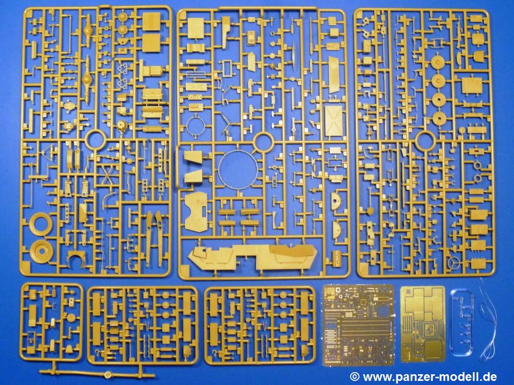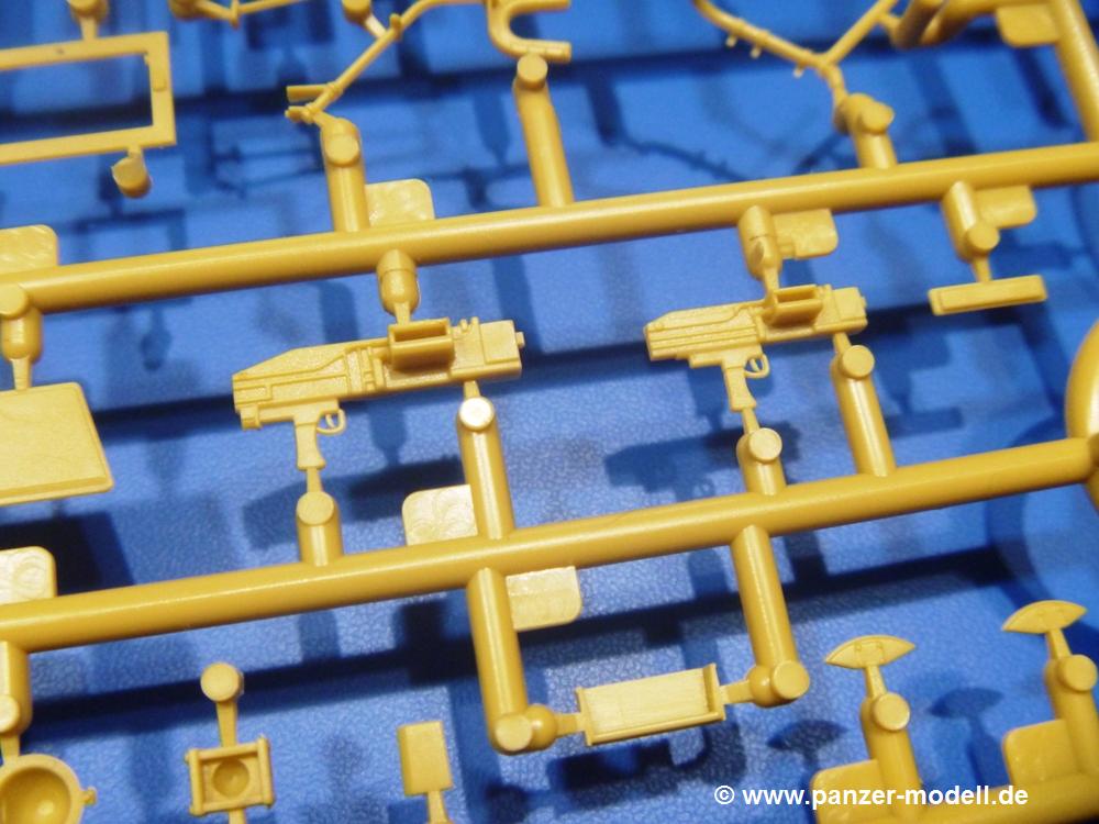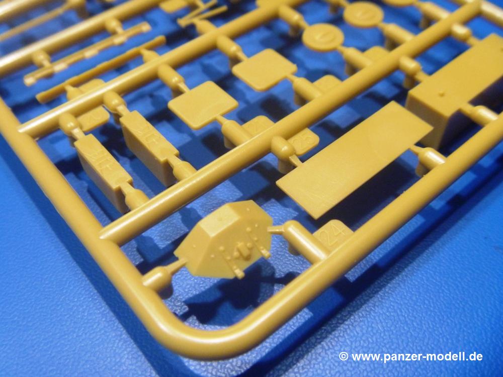 So, wie beschreibt man nun einen Bausatz der Superlative, ohne zu viel oder zu wenig zusagen? Beginnen wir beim Motor. Motorblock und Ölwanne sind selbstverständlich. Der Zylinderkopf ist mit feinen Verschraubungen versehen, Zündkerzenstecker sind angedeutet. Zuluft- und Auspuffkrümmer, Öleinfüllstutzen, Zündspule, Lichtmaschine (Generator), Doppelkeilriemen, -scheiben, Kühlventilator - alles da als separat anzubringende Teile. Allein die Lichtmaschine wird aus 6 Teilen zusammengesetzt und dazu gibt es auch den Keilriemenspanner. Der 6-teilige Kühler glänzt mit feinen Kühlrippen. Bronco hat die Schlauchverbindungen zum Motor nicht vergessen. Vergaser und Luftfilter bilden eine Einheit. Der Luftansaugschlauch führt zum Kampfraum, von wo der Motor sich seine Luft holt. An den Auspuffkrümmer schließt sich das Abgasrohr an, das in einem Schalldämpfer endet. Eigentlich fehlt nur die Verkabelung! An den Motor wird das Kupplungsgehäuse mit dem nachfolgenden Schaltgetriebe angeflanscht, das die Kraft über zwischengeschaltete Fliehkraftkupplungen an das Verteilergetriebe abgibt. Die Gimmicks hierbei sind, dass z.B. vom Allradschalthebel bis zum Verteilergetriebe das komplette Gestänge vorhanden ist. Man kann also am Modell die Verbindungen verfolgen. Vom Verteilergetriebe führen Kardanwellen zu den Achsen, deren Differentialgehäuse auch mit feinen Verschraubungen und Stützrippen ausgestattet sind. An der Hinterachse finden wir ein Bremsgestänge und einen extra Kontroll-/Einfüllstutzen für das Getriebeöl. Die Achsen ruhen auf Blattfederpaketen, die in ihre Lager ohne Klebstoff nur eingeschnappt werden, um die Beweglichkeit zu erhalten. Je Blattfederpaket gibt es noch einen Stoßdämpfer. Während die hinteren Stoßdämpfer sich an Lagern in Motorraum abstützen, bekommen die vorderen separate, außen an der Karosserie anliegende. Die großen Räder sind mehrteilig ausgeführt. Jedes Vorderrad besteht aus 9, jedes Hinterrad aus 6 Teilen! Zum einen dient dies der besseren Detaillierung, zum anderen um die Dreh- und Lenkbarkeit zu erreichen. Das komplette Lenkgestänge ist vorhanden und kann gemäß Anleitung funktionsfähig gebaut werden. Das "Rückgrat" des Fahrzeugs ist der Rahmen, der sich aus Längs-, Stütz- und Querträgern zusammensetzt. Für das Verteilergetriebe gibt noch mal einen mehrteiligen Hilfsrahmen, der in den eigentlichen Rahmen eingepasst wird. Auf dem Rahmen sitzt dann der Fahrzeugboden. Der Kampfraum wird vom Motor durch ein Brandschott getrennt. In dem Schott befindet sich eine Klappe, die geschlossen oder offen gebaut werden kann. Der Trick an der Klappe ist, dass die Besatzung durch sie hindurch greifen konnte, um den Ver-/Entriegelungsmechanismus der großen Motorklappe zu bedienen. Natürlich ist dieser Mechanismus vorhanden und kann aus 8 Teilen in geöffneter oder geschlossener Version gebaut werden. Lässt man die Motorklappe offen, wird man auch später noch sehen können, dass sich neben 2 Tanks auch noch Batteriekasten, Ölnachfüll- und andere Behälter im Motorraum befinden. Auch im Fahrerraum kann man sich austoben, dabei ist der Sitz noch das größte Teil. Schalt-, Feststellbrems- und Allradschalthebel sind vorhanden. Dies gilt auch für mehrteilige Pedalerie. Lenkrad, -stange, -getriebe inkl. Verbindungen zum Lenkgestänge sind da. Die Armaturentafel zeigt Details wie Lichtschalter und Instrumente (Laut Bauschritt 7 liegen Decals für die Instrumente bei. Dem ist aber nicht so!) plus eine Kartenleuchte. Der restliche Innenraum ist mit Feuerlöscher, Munitionskasten, -halterungen, Feldflasche, Leuchtpistole und einigem mehr ausgestattet. Die Seitensichtklappen sind einteilig, aber sehr schön detailliert, die Fahrersichtklappe dafür 14-teilig. Sie kann offen oder geschlossen gebaut werden. Die beiden Seitentüren können geöffnet oder geschlossen gebaut werden. Die rechte kann aber nur bei Option 1 mit dem Ersatzrad auf dem Bug geöffnet werden. Auch der Turm geht als eigenes Modell durch. Natürlich sind Waffen komplett und mit Munitionskästen und Hülsenfangsäcken, -kasten ausgestattet. 3 Sitze der Turmbesatzung, Turmseitenschwenkwerk, Handgranatenhalter aus PE Teilen mit separaten Handgranaten, Abfeuerungsmechanismus der 2 Nebelwurfrohre in der Blende, Seitensichtluken mit Öffnerhebel, Aufbewahrungskästen, Trommelmagazinhalterungen, Turmbelüftung und ein sehr schönes Funkgerät mit Schutzgitter und Verkabelung sind weitere Innendetails. Die Dachwinkelspiegel sind aus Klarsichtmaterial, werden aus mehreren Teilen zusammengesetzt und können gedreht eingebaut werden. Für die faltbaren Turmluken gibt es die Optionen offen oder geschlossen. Für den Suchscheinwerfer an der Turmfront gibt es eine Klarsichtscheibe. Die MG-Rohre sind bereits aufgebohrt, die Blende kann höhenbeweglich gebaut werden, bleibt aber beweglich, nur wenn man im Inneren die Hülsenfangsäcke weglässt oder durch flexibles Material (nicht im Bausatz enthalten) ersetzt. Weitere Details außen am Turm sind die durchbohrten Nebelwurfrohre, die Abdeckung des Turmlüfters, MG-Halterung samt MG und die Antennen. Außen am Fahrzeug finden sich Werkzeuge wie Schaufel, Brechstange, Hackenstiel und Wagenheber, Feuerlöscher, Außenspiegel, Hupe, Begrenzungsleuchten, Fahrscheinwerfer, Hebe- und Zurrösen, eine Halterung für ein Sandblech und dasselbige, verschiedene Stau-, Munitions- und Kraftstoffbehälter und das Ersatzrad. Die Anbringung der letzteren hängt von der Optionswahl ab. Das Abschleppseil aus dem beiliegenden Bindfaden wird mittels 2 Haken in die seitlichen Haltegriffe eingehängt. Der Decalbogen liefert die Außenmarkierungen für vier Fahrzeuge. Es fehlen die Instrumentenanzeigen und die Plaketten für Kästen und Feuerlöscher, die in die Bauschritten zwar angegeben sind, aber nicht auf dem Bogen erscheinen. Varianten: