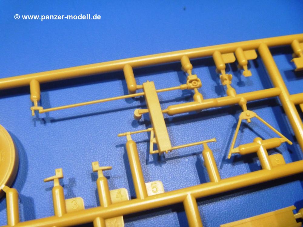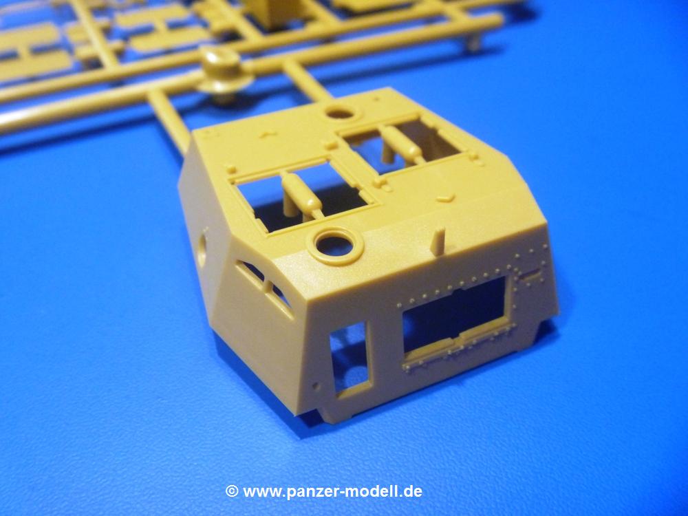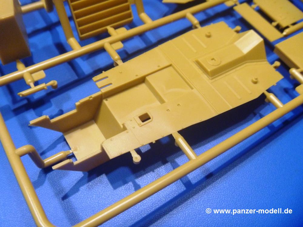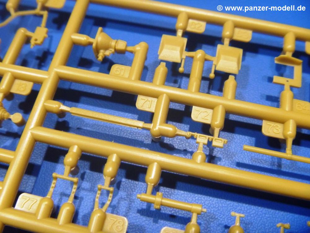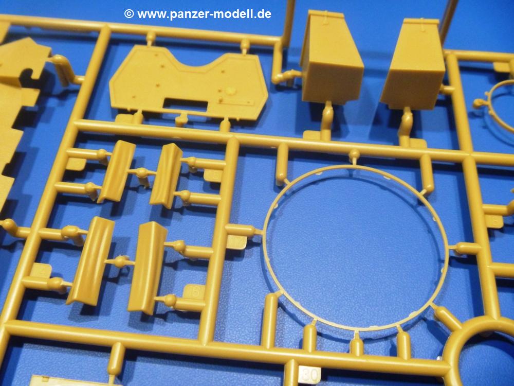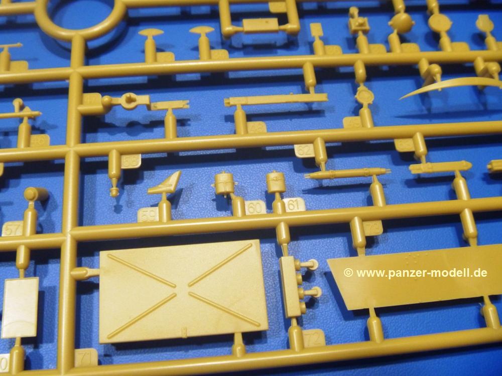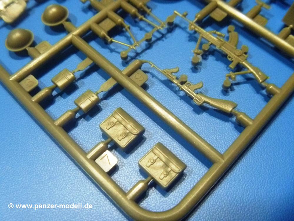 So, wie beschreibt man nun einen Bausatz der Superlative, ohne zu viel oder zu wenig zusagen? Beginnen wir beim Motor. Motorblock und Ölwanne sind selbstverständlich. Der Zylinderkopf ist mit feinen Verschraubungen versehen, Zündkerzenstecker sind angedeutet. Zuluft- und Auspuffkrümmer, Öleinfüllstutzen, Zündspule, Lichtmaschine (Generator), Doppelkeilriemen, -scheiben, Kühlventilator - alles da als separat anzubringende Teile. Allein die Lichtmaschine wird aus 6 Teilen zusammengesetzt und dazu gibt es auch den Keilriemenspanner. Der 6-teilige Kühler glänzt mit feinen Kühlrippen. Bronco hat die Schlauchverbindungen zum Motor nicht vergessen. Vergaser und Luftfilter bilden eine Einheit. Der Luftansaugschlauch führt zum Kampfraum, von wo der Motor sich seine Luft holt. An den Auspuffkrümmer schließt sich das Abgasrohr an, das in einem Schalldämpfer endet. Eigentlich fehlt nur die Verkabelung! An den Motor wird das Kupplungsgehäuse mit dem nachfolgenden Schaltgetriebe angeflanscht, das die Kraft über zwischengeschaltete Fliehkraftkupplungen an das Verteilergetriebe abgibt. Die Gimmicks hierbei sind, dass z.B. vom Allradschalthebel bis zum Verteilergetriebe das komplette Gestänge vorhanden ist. Man kann also am Modell die Verbindungen verfolgen. Vom Verteilergetriebe führen Kardanwellen zu den Achsen, deren Differentialgehäuse auch mit feinen Verschraubungen und Stützrippen ausgestattet sind. An der Hinterachse finden wir ein Bremsgestänge und einen extra Kontroll-/Einfüllstutzen für das Getriebeöl. Die Achsen ruhen auf Blattfederpaketen, die in ihre Lager ohne Klebstoff nur eingeschnappt werden, um die Beweglichkeit zu erhalten. Je Blattfederpaket gibt es noch einen Stoßdämpfer. Während die hinteren Stoßdämpfer sich an Lagern in Motorraum abstützen, bekommen die vorderen separate, außen an der Karosserie anliegende. Die großen Räder sind mehrteilig ausgeführt. Jedes Vorderrad besteht aus 9, jedes Hinterrad aus 6 Teilen! Zum einen dient dies der besseren Detaillierung, zum anderen um die Dreh- und Lenkbarkeit zu erreichen. Das komplette Lenkgestänge ist vorhanden und kann gemäß Anleitung funktionsfähig gebaut werden. Das "Rückgrat" des Fahrzeugs ist der Rahmen, der sich aus Längs-, Stütz- und Querträgern zusammensetzt. Für das Verteilergetriebe gibt noch mal einen mehrteiligen Hilfsrahmen, der in den eigentlichen Rahmen eingepasst wird. Auf dem Rahmen sitzt dann der Fahrzeugboden. Der Kampfraum wird vom Motor durch ein Brandschott getrennt. In dem Schott befindet sich eine Klappe, die geschlossen oder offen gebaut werden kann. Der Trick an der Klappe ist, dass die Besatzung durch sie hindurch greifen konnte, um den Ver-/Entriegelungsmechanismus der großen Motorklappe zu bedienen. Natürlich ist dieser Mechanismus vorhanden und kann aus 8 Teilen in geöffneter oder geschlossener Version gebaut werden. Lässt man die Motorklappe offen, wird man auch später noch sehen können, dass sich neben 2 Tanks auch noch Batteriekasten, Ölnachfüll- und andere Behälter im Motorraum befinden. Auch im Fahrerraum kann man sich austoben, dabei ist der Sitz noch das größte Teil. Schalt-, Feststellbrems- und Allradschalthebel sind vorhanden. Dies gilt auch für mehrteilige Pedalerie. Lenkrad, -stange, -getriebe inkl. Verbindungen zum Lenkgestänge sind da. Die Armaturentafel zeigt Details wie Lichtschalter und Instrumente (Laut Bauschritt 7 liegen Decals für die Instrumente bei. Dem ist aber nicht so!) plus eine Kartenleuchte. Der restliche Innenraum ist mit Feuerlöscher, Munitionskasten, -halterungen, Feldflasche, Leuchtpistole und einigem mehr ausgestattet. Die Seitensichtklappen sind einteilig, aber sehr schön detailliert, die Fahrersichtklappe dafür 14-teilig. Sie kann offen oder geschlossen gebaut werden. Die beiden Seitentüren können geöffnet oder geschlossen gebaut werden. Die rechte kann aber nur bei Option 1 mit dem Ersatzrad auf dem Bug geöffnet werden. Auch der Turm geht als eigenes Modell durch. Natürlich sind Waffen komplett und mit Munitionskästen und Hülsenfangsäcken, -kasten ausgestattet. 3 Sitze der Turmbesatzung, Turmseitenschwenkwerk, Handgranatenhalter aus PE Teilen mit separaten Handgranaten, Abfeuerungsmechanismus der 2 Nebelwurfrohre in der Blende, Seitensichtluken mit Öffnerhebel, Aufbewahrungskästen, Trommelmagazinhalterungen, Turmbelüftung und ein sehr schönes Funkgerät mit Schutzgitter und Verkabelung sind weitere Innendetails. Die Dachwinkelspiegel sind aus Klarsichtmaterial, werden aus mehreren Teilen zusammengesetzt und können gedreht eingebaut werden. Für die faltbaren Turmluken gibt es die Optionen offen oder geschlossen. Für den Suchscheinwerfer an der Turmfront gibt es eine Klarsichtscheibe. Die MG-Rohre sind bereits aufgebohrt, die Blende kann höhenbeweglich gebaut werden, bleibt aber beweglich, nur wenn man im Inneren die Hülsenfangsäcke weglässt oder durch flexibles Material (nicht im Bausatz enthalten) ersetzt. Weitere Details außen am Turm sind die durchbohrten Nebelwurfrohre, die Abdeckung des Turmlüfters, MG-Halterung samt MG und die Antennen. Außen am Fahrzeug finden sich Werkzeuge wie Schaufel, Brechstange, Hackenstiel und Wagenheber, Feuerlöscher, Außenspiegel, Hupe, Begrenzungsleuchten, Fahrscheinwerfer, Hebe- und Zurrösen, eine Halterung für ein Sandblech und dasselbige, verschiedene Stau-, Munitions- und Kraftstoffbehälter und das Ersatzrad. Die Anbringung der letzteren hängt von der Optionswahl ab. Das Abschleppseil aus dem beiliegenden Bindfaden wird mittels 2 Haken in die seitlichen Haltegriffe eingehängt. Der Decalbogen liefert die Außenmarkierungen für vier Fahrzeuge. Es fehlen die Instrumentenanzeigen und die Plaketten für Kästen und Feuerlöscher, die in die Bauschritten zwar angegeben sind, aber nicht auf dem Bogen erscheinen. Varianten: