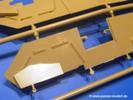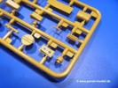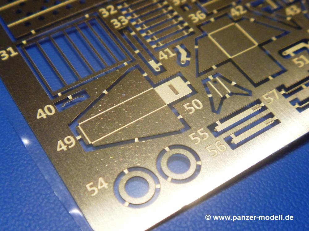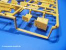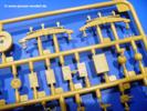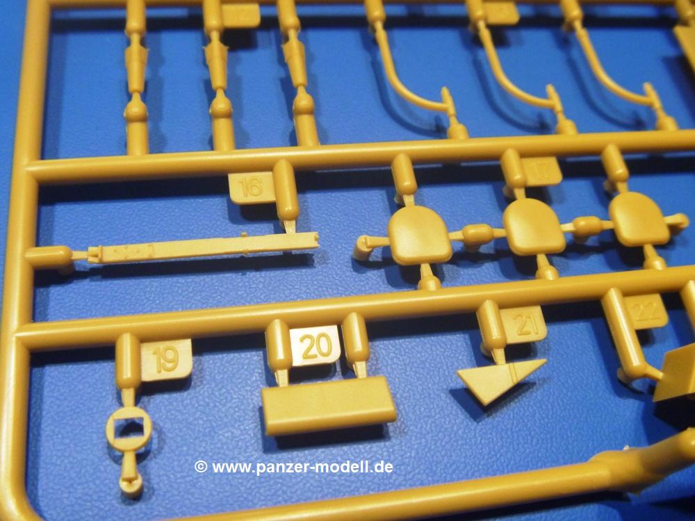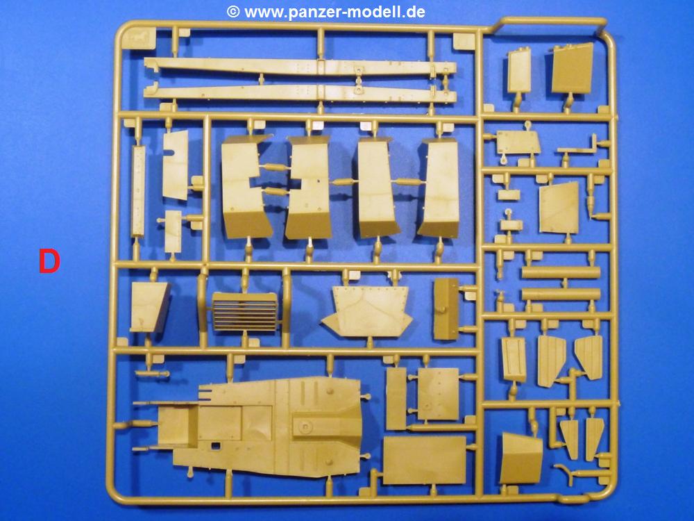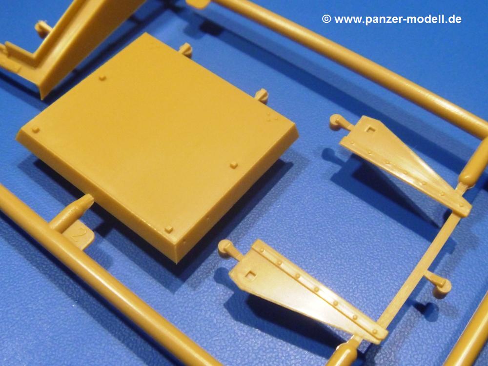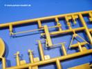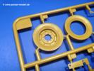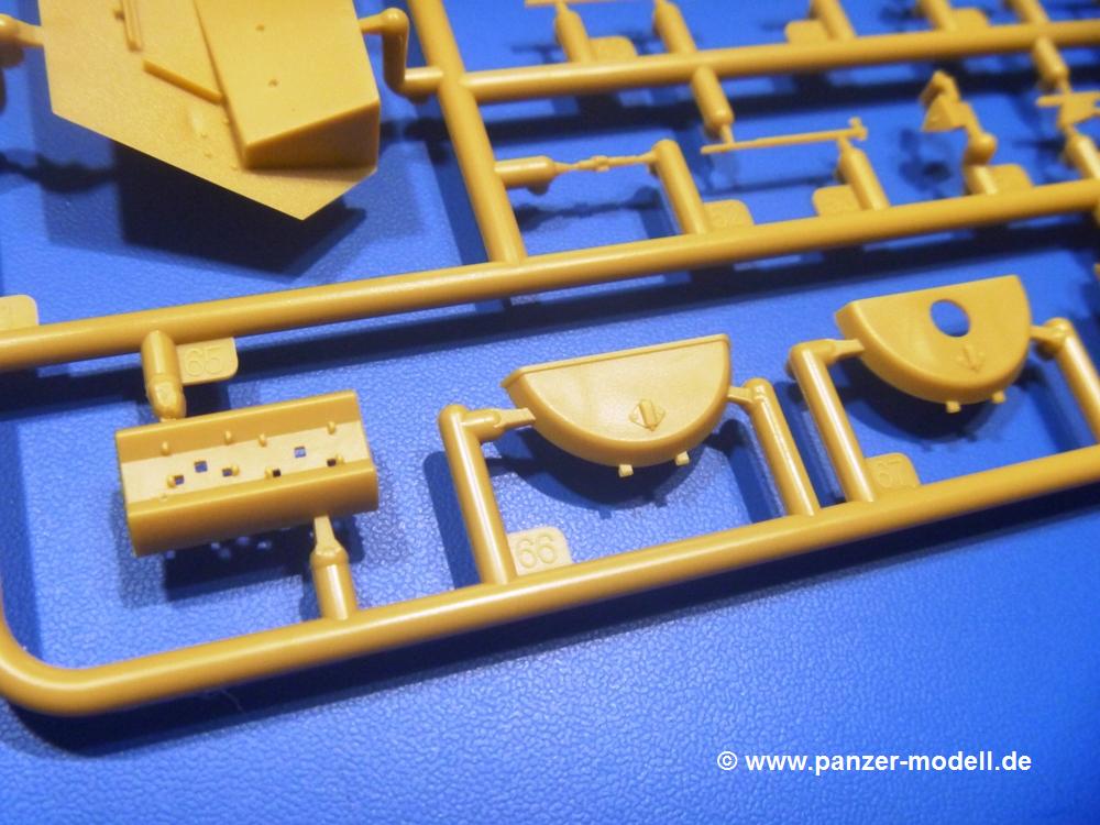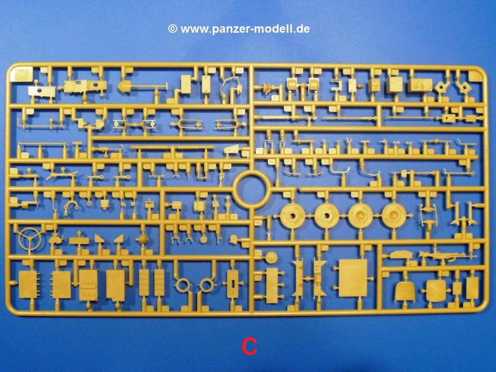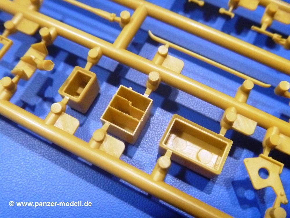 So, wie beschreibt man nun einen Bausatz der Superlative, ohne zu viel oder zu wenig zusagen? Beginnen wir beim Motor. Motorblock und Ölwanne sind selbstverständlich. Der Zylinderkopf ist mit feinen Verschraubungen versehen, Zündkerzenstecker sind angedeutet. Zuluft- und Auspuffkrümmer, Öleinfüllstutzen, Zündspule, Lichtmaschine (Generator), Doppelkeilriemen, -scheiben, Kühlventilator - alles da als separat anzubringende Teile. Allein die Lichtmaschine wird aus 6 Teilen zusammengesetzt und dazu gibt es auch den Keilriemenspanner. Der 6-teilige Kühler glänzt mit feinen Kühlrippen. Bronco hat die Schlauchverbindungen zum Motor nicht vergessen. Vergaser und Luftfilter bilden eine Einheit. Der Luftansaugschlauch führt zum Kampfraum, von wo der Motor sich seine Luft holt. An den Auspuffkrümmer schließt sich das Abgasrohr an, das in einem Schalldämpfer endet. Eigentlich fehlt nur die Verkabelung! An den Motor wird das Kupplungsgehäuse mit dem nachfolgenden Schaltgetriebe angeflanscht, das die Kraft über zwischengeschaltete Fliehkraftkupplungen an das Verteilergetriebe abgibt. Die Gimmicks hierbei sind, dass z.B. vom Allradschalthebel bis zum Verteilergetriebe das komplette Gestänge vorhanden ist. Man kann also am Modell die Verbindungen verfolgen. Vom Verteilergetriebe führen Kardanwellen zu den Achsen, deren Differentialgehäuse auch mit feinen Verschraubungen und Stützrippen ausgestattet sind. An der Hinterachse finden wir ein Bremsgestänge und einen extra Kontroll-/Einfüllstutzen für das Getriebeöl. Die Achsen ruhen auf Blattfederpaketen, die in ihre Lager ohne Klebstoff nur eingeschnappt werden, um die Beweglichkeit zu erhalten. Je Blattfederpaket gibt es noch einen Stoßdämpfer. Während die hinteren Stoßdämpfer sich an Lagern in Motorraum abstützen, bekommen die vorderen separate, außen an der Karosserie anliegende. Die großen Räder sind mehrteilig ausgeführt. Jedes Vorderrad besteht aus 9, jedes Hinterrad aus 6 Teilen! Zum einen dient dies der besseren Detaillierung, zum anderen um die Dreh- und Lenkbarkeit zu erreichen. Das komplette Lenkgestänge ist vorhanden und kann gemäß Anleitung funktionsfähig gebaut werden. Das "Rückgrat" des Fahrzeugs ist der Rahmen, der sich aus Längs-, Stütz- und Querträgern zusammensetzt. Für das Verteilergetriebe gibt noch mal einen mehrteiligen Hilfsrahmen, der in den eigentlichen Rahmen eingepasst wird. Auf dem Rahmen sitzt dann der Fahrzeugboden. Der Kampfraum wird vom Motor durch ein Brandschott getrennt. In dem Schott befindet sich eine Klappe, die geschlossen oder offen gebaut werden kann. Der Trick an der Klappe ist, dass die Besatzung durch sie hindurch greifen konnte, um den Ver-/Entriegelungsmechanismus der großen Motorklappe zu bedienen. Natürlich ist dieser Mechanismus vorhanden und kann aus 8 Teilen in geöffneter oder geschlossener Version gebaut werden. Lässt man die Motorklappe offen, wird man auch später noch sehen können, dass sich neben 2 Tanks auch noch Batteriekasten, Ölnachfüll- und andere Behälter im Motorraum befinden. Auch im Fahrerraum kann man sich austoben, dabei ist der Sitz noch das größte Teil. Schalt-, Feststellbrems- und Allradschalthebel sind vorhanden. Dies gilt auch für mehrteilige Pedalerie. Lenkrad, -stange, -getriebe inkl. Verbindungen zum Lenkgestänge sind da. Die Armaturentafel zeigt Details wie Lichtschalter und Instrumente (Laut Bauschritt 7 liegen Decals für die Instrumente bei. Dem ist aber nicht so!) plus eine Kartenleuchte. Der restliche Innenraum ist mit Feuerlöscher, Munitionskasten, -halterungen, Feldflasche, Leuchtpistole und einigem mehr ausgestattet. Die Seitensichtklappen sind einteilig, aber sehr schön detailliert, die Fahrersichtklappe dafür 14-teilig. Sie kann offen oder geschlossen gebaut werden. Die beiden Seitentüren können geöffnet oder geschlossen gebaut werden. Die rechte kann aber nur bei Option 1 mit dem Ersatzrad auf dem Bug geöffnet werden. Auch der Turm geht als eigenes Modell durch. Natürlich sind Waffen komplett und mit Munitionskästen und Hülsenfangsäcken, -kasten ausgestattet. 3 Sitze der Turmbesatzung, Turmseitenschwenkwerk, Handgranatenhalter aus PE Teilen mit separaten Handgranaten, Abfeuerungsmechanismus der 2 Nebelwurfrohre in der Blende, Seitensichtluken mit Öffnerhebel, Aufbewahrungskästen, Trommelmagazinhalterungen, Turmbelüftung und ein sehr schönes Funkgerät mit Schutzgitter und Verkabelung sind weitere Innendetails. Die Dachwinkelspiegel sind aus Klarsichtmaterial, werden aus mehreren Teilen zusammengesetzt und können gedreht eingebaut werden. Für die faltbaren Turmluken gibt es die Optionen offen oder geschlossen. Für den Suchscheinwerfer an der Turmfront gibt es eine Klarsichtscheibe. Die MG-Rohre sind bereits aufgebohrt, die Blende kann höhenbeweglich gebaut werden, bleibt aber beweglich, nur wenn man im Inneren die Hülsenfangsäcke weglässt oder durch flexibles Material (nicht im Bausatz enthalten) ersetzt. Weitere Details außen am Turm sind die durchbohrten Nebelwurfrohre, die Abdeckung des Turmlüfters, MG-Halterung samt MG und die Antennen. Außen am Fahrzeug finden sich Werkzeuge wie Schaufel, Brechstange, Hackenstiel und Wagenheber, Feuerlöscher, Außenspiegel, Hupe, Begrenzungsleuchten, Fahrscheinwerfer, Hebe- und Zurrösen, eine Halterung für ein Sandblech und dasselbige, verschiedene Stau-, Munitions- und Kraftstoffbehälter und das Ersatzrad. Die Anbringung der letzteren hängt von der Optionswahl ab. Das Abschleppseil aus dem beiliegenden Bindfaden wird mittels 2 Haken in die seitlichen Haltegriffe eingehängt. Der Decalbogen liefert die Außenmarkierungen für vier Fahrzeuge. Es fehlen die Instrumentenanzeigen und die Plaketten für Kästen und Feuerlöscher, die in die Bauschritten zwar angegeben sind, aber nicht auf dem Bogen erscheinen. Varianten: