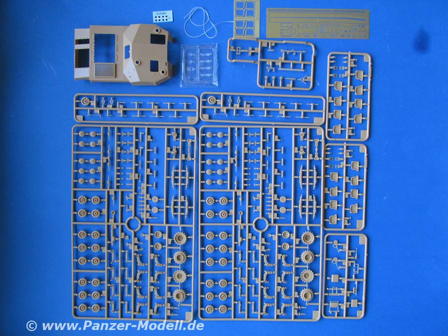 Im Karton finden sich 12 Spritzlinge, Klarsichtteile, die Unterwanne, Aufbau, Einzelkettenglieder, PE Teile und ein Decalbogen.