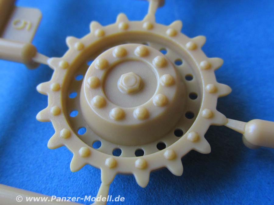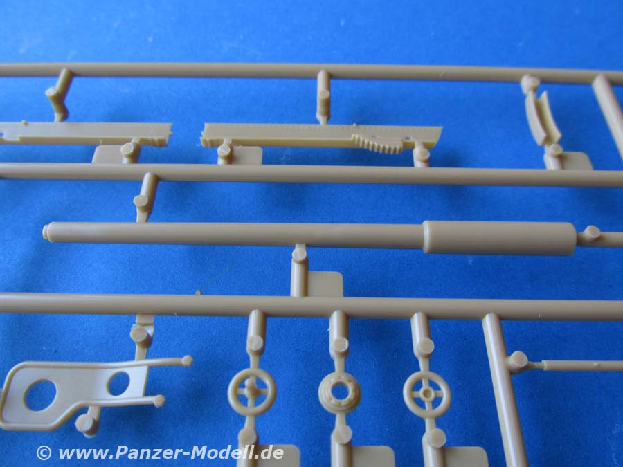Auch dieser Bausatz erfreut mit seiner umfangreichen Ausstattung und Detaillierung. Der Guss der Teile ist wirklich hervorragend fein und sauber. Allein die unzähligen verschieden großen Nietenreihen an allen Bereichen des Panzers sind eine echte Augenweide.