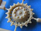 Die Unterwanne beherbergt zum einen einen Innenraum für den Fahrer und ein recht umfangreiches Laufwerk mit zwei großen Blattfederpaketen mit je 4 kleinen Doppellaufrollen. Das ganze sieht dehr fein und detailliert aus. Die Kette ist such hier eine bewegliche Einzelgliedkette. Diese ist sehr fein und vor allem ohne Auswerferstellen. Die einzelnen Kettenglieder sind an je drei Angusspunkten in einer Reihe und nicht in einem starren Spritzlingsrahmen untergebracht.