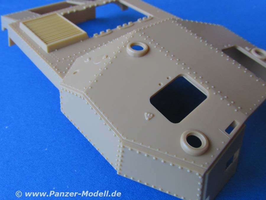 Die Oberwanne ist mit unzähligen Nieten versehen, die hervorragend aussehen. Alle Luken sind offen darstellbar - leider ist im Kampf- und Motorraum keinerlei Innenraum vorhanden.