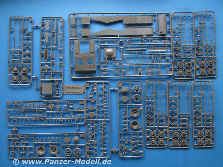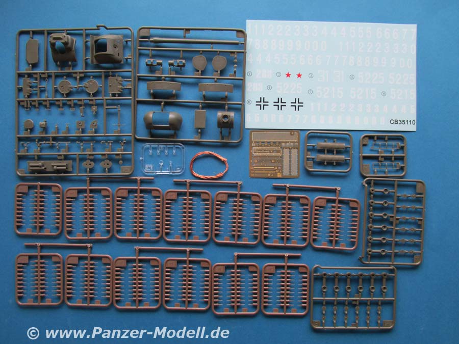 Der Bausatzkarton beherbergt 19 olivgrüne Spritzlinge (teils sehr klein, teils zwei zu einem verbunden), 6 Doppel und ein Einzelspritzling in braun, ein Spritzling klares Plastik, die Unterwanne, jeweils 10 Stränge Kettenglieder mit und ohne Führungszahn, eine Platine PE Teile, 2 Kupferseile und ein großer Decalbogen.