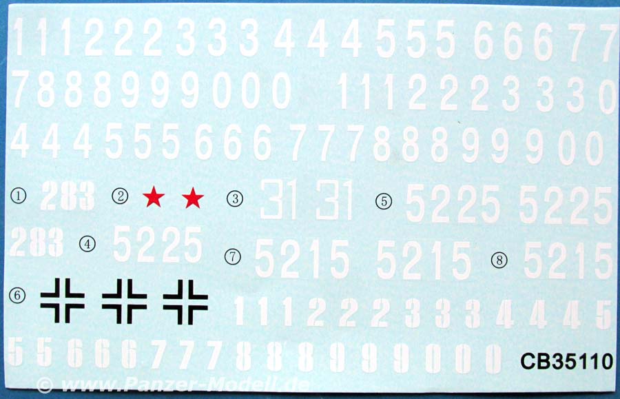 Interessanterweise bietet der Decalbogen viel mehr Möglichkeiten zur Markierung mit jeweils 2 verschiedenen Sets an weißen Zalen von 0-9 zum selberzusammenstellen sowie vier evrschiedene Turmnummern in fester Anordnung. Dazu gibt es drei Balkenkreuze in schwarz, um ein deutsches Beutefahrzeug darzustellen.
