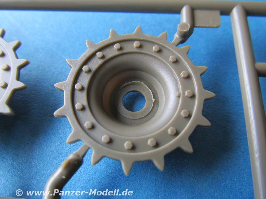 Die Laufrollen sind sehr detailreich mit all den Rippen und Löchern. Diese sind schön sauber und detailiert dargestellt. Bei vorsichtigem Einsatz von Kleber bleiben diese auch drehbar, was späteres bemalen vereinfacht.