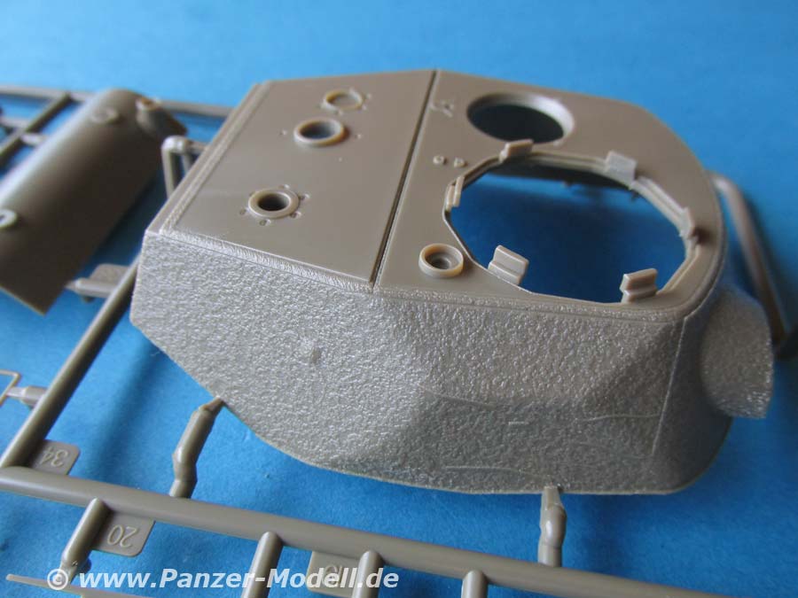 Der Turm weist eine recht markante, wenn auch für meinen geschmack zu gleichmäßige Gussstruktur auf, die auch an der Blende und der Blendenaufnahme fortgeführt sind. Die Zahl der Anbauteile ist erfreulich übersichtlich, die Kommandantenkuppel schön wiedergegeben und mit klaren Plastikteilen für die Winkelspiegel versehen. Die Luken sind wahlweise ffen oder geschlossen baubar.