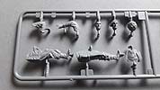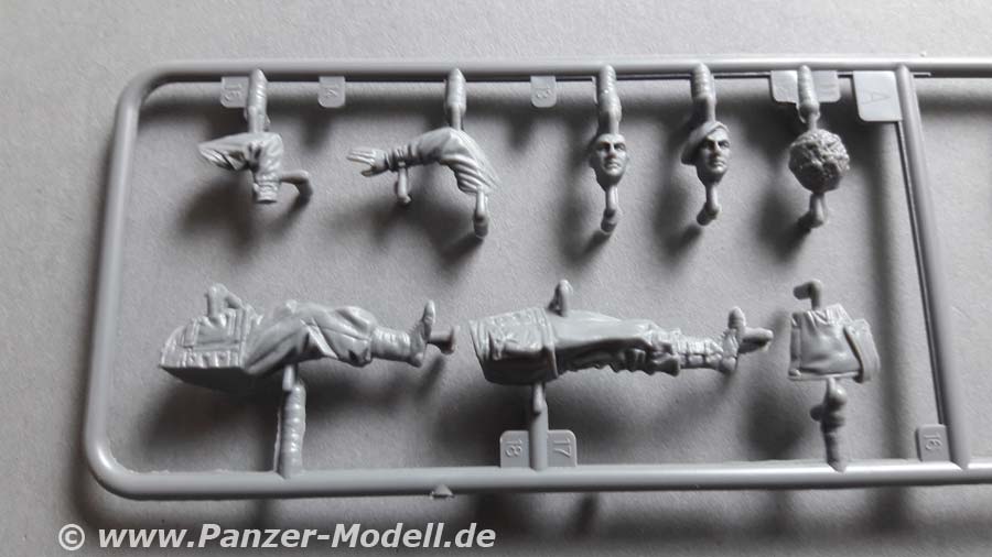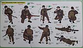 WWII British Paratroops in Combat Set B Als Ergänzung zu Set 35110 bietet Bronco hier den zweiten Teil seiner britischen Fallschirmjäger an. Auch hier ist es ein Set mit 5 Figuren in Kampfposen, jedoch mit etwas anderen Optionen. Auch hier befinden sich alle 5 Figuren an einem eigenen Spritzling. Ebenso liegen jeder Figur 2 Köpfe bei, jeweils einer mit Barett und einer mit dem Airborne Stahlhelm. Auch hier sind die Kinnriemen separat. 2 Figuren liegen Rucksäcke bei, teilweise auch separate Stiefelsohlen. Alle Figuren haben Munitionstaschen, das Entrenching Tool und Trinkflaschen. Der Faltenwurf ist gut wiedergegeben, die Unterseiten der Smocks sind als Einzelteile dargestellt und erlauben eine Darstellung mit Tiefenwirkung. Die einzelnen Gesichter sind individuell gestaltet und geben die Anspannung eines Kampfes gut wieder. Als Bewaffnung liegen diesmal 2 Spritzlinge bei, welche 1 Bren MG, 1 Sten MP, Revolver mit und ohne Holster, 1 Lee Enfield Gewehr und eine PIAT Anti Tank Waffe enthalten. Zudem ist ein Spritzling mit einem britischen Funkgerät und 1 kleinen Ätzteilplatine für eben dieses enthalten. Auch liegt wieder ein Decalbogen mit Dienstgradabzeichen und Airborne Patches bei. Fazit: Ein weiterer sehr schöner Figurensatz zur Darstellung britischer Fallschirmjäger. Absolut Empfehlenswert