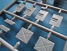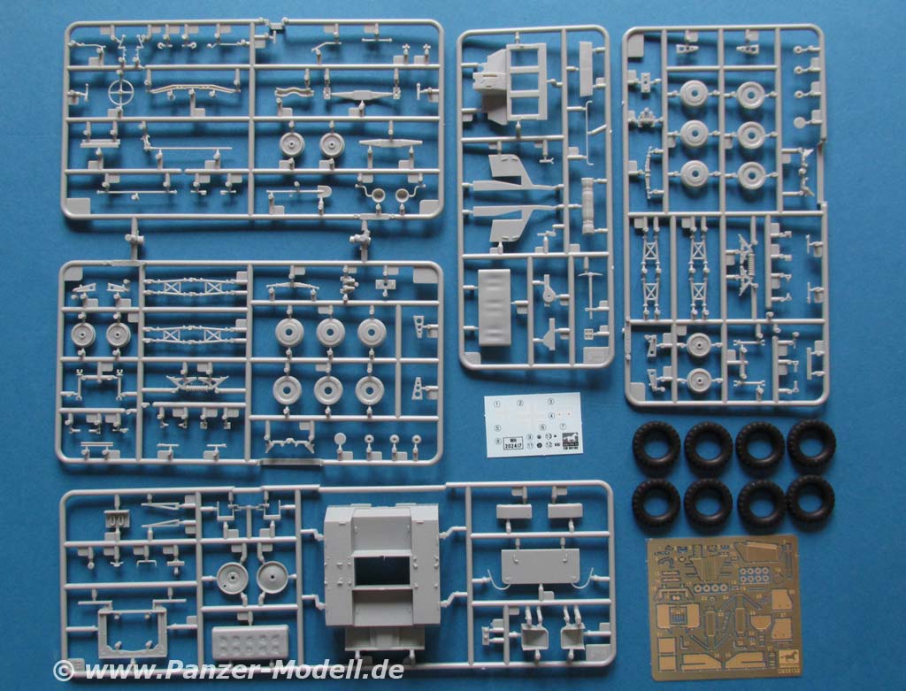 10 graue Spritzlinge, 8 schwarze Vinylreifen, eine PE Platine und ein Decalbogen.