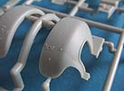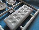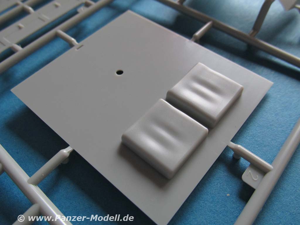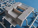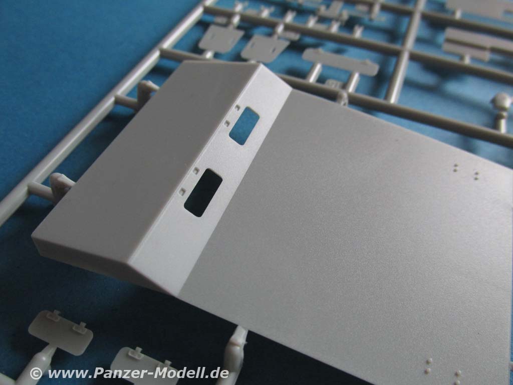 Die zusätzlichen Panzerplatten an der Front, die der Protze so einen besonderen Anblick verleihen, bestehen aus recht dünnen Plastikteilen von denen das Oberstück mit Fahrererker in einem Teil gemacht ist. Die beiden Frontsichtklappen und untere Wartungsklappe lassen sich offen oder geschlossen bauen.