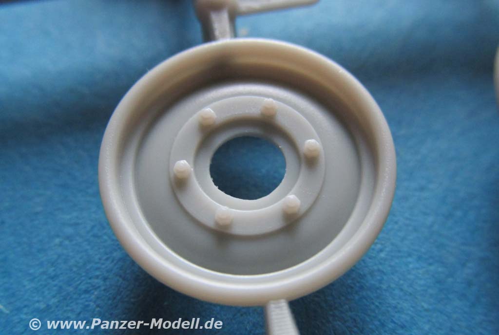 Die Plastikfelgen werden von beiden Seiten in die Reifenteile eingefügt und verklebt. Auch diese machen einen ausgezeichneten Eindruck mit feinen Details.