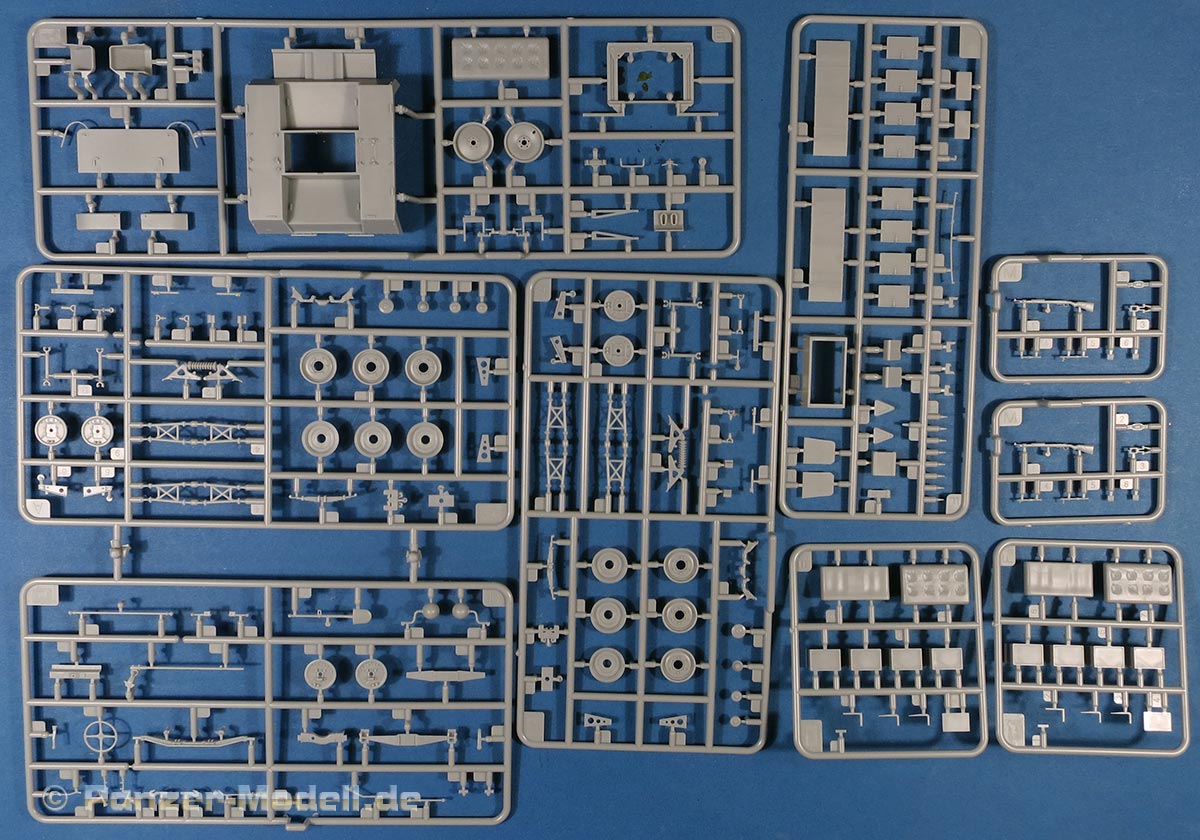 12 graue Spritzlinge, ein Spritzling klarer Plastikteile, 8 schwarze Vinylreifen für den Krupp, 3 schwarze Vinylreifen für die Pak, zwei PE Platinen und ein Decalbogen.