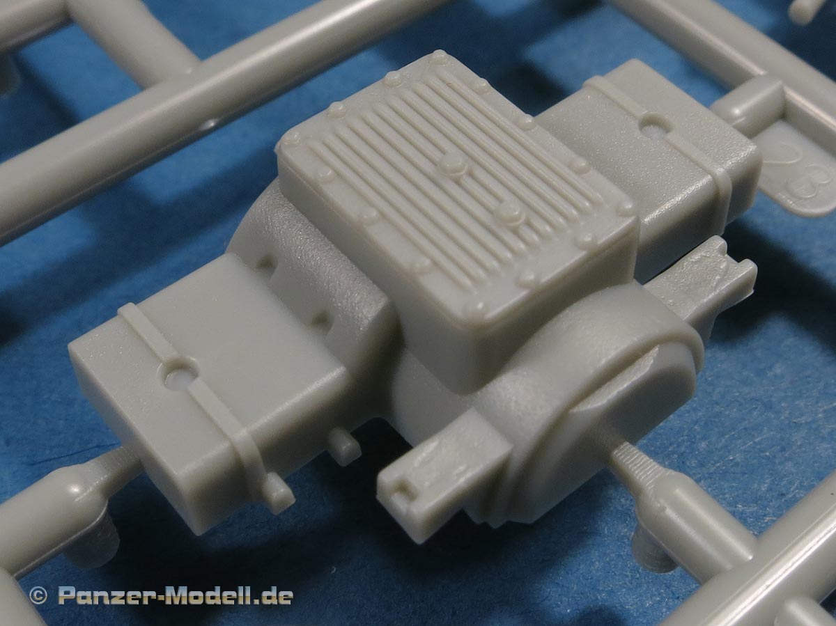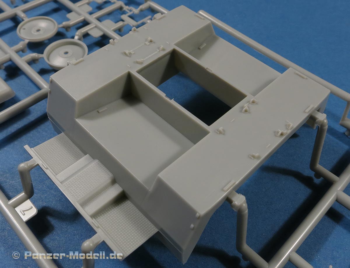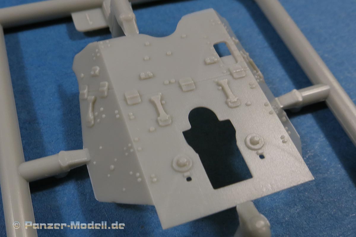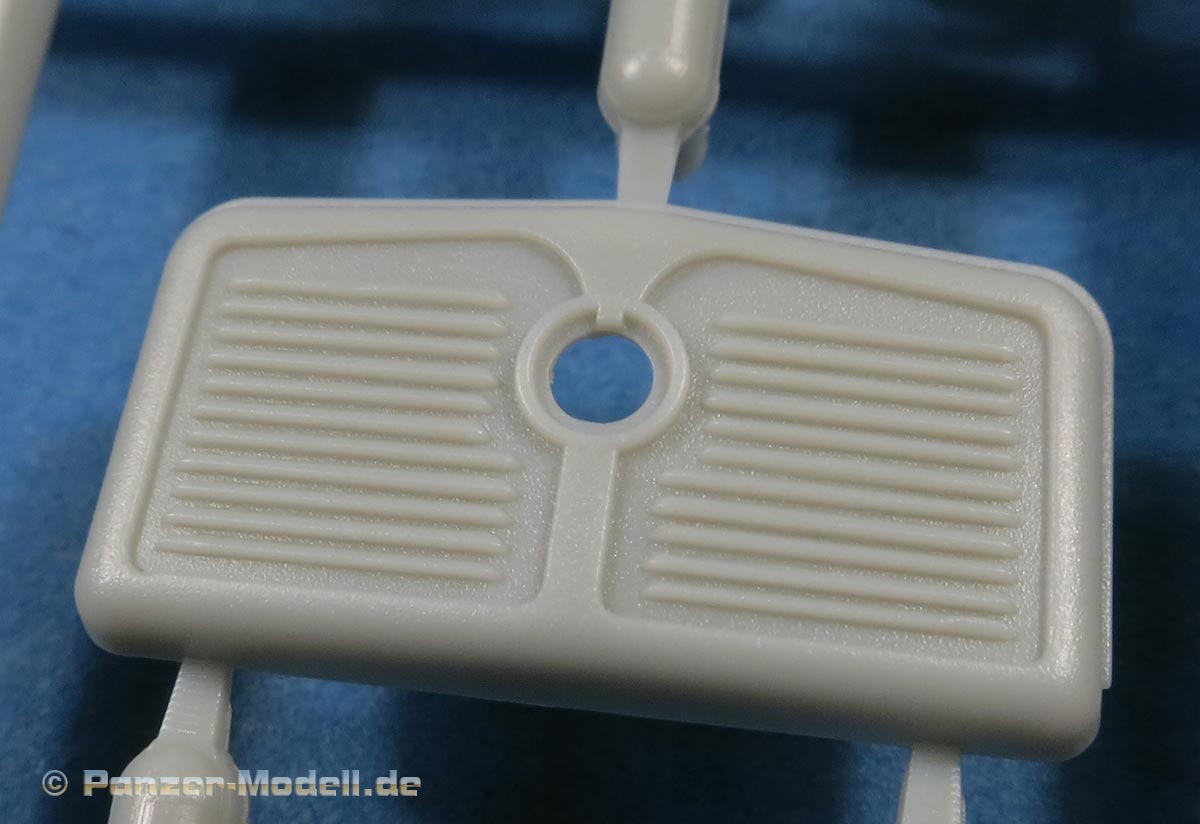 Im Heckaufbau werden die Sitze mit schönen Polstern in Spritzguss dargestellt. Dazu reichlich Stauboxen für die 3,7cm Munition, die auf den Schutzblechen der Heckachsen positioniert werden.