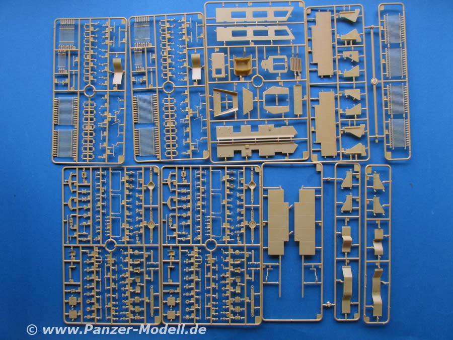 Im Kasten finden sich 20 Spritzlinge in beigem Plastik, 6 Spritzlinge in durchsichtigem Plastik, Unterwanne, Aufbau, 6 Radreifen, eine PE Platine, 0,4 und 0,6mm Gummimaterial, sowie ein Decalbogen.