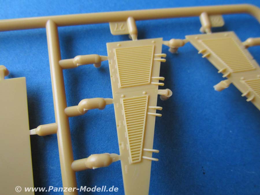 Hauptaugenmerk dieses Bausatzes liegt aber natürlich auf der Slat und Spaced Panzerung. Diese hat Bronco als Plastikspritzgussteile in einzelnen Elementen dem Bausatz beigelegt. Das ganze macht einen guten und einfach zu handhabenden Eindruck. Das einzig fummelige dürften die Halterungen und Verbindungen aus PE Teilen sein, die offenbar teilweise mit einzelnen Plastiknietenköpfen noch bestückt werden sollen.