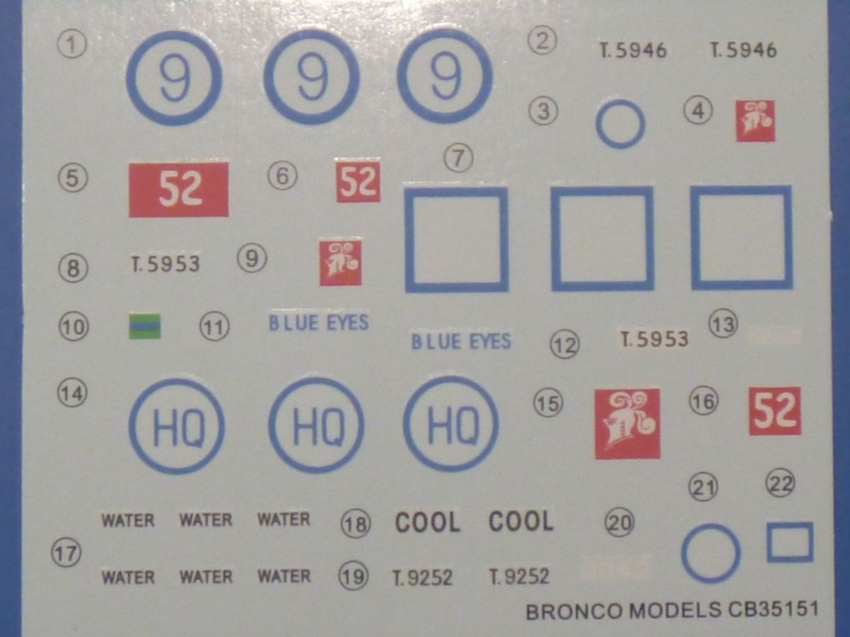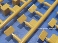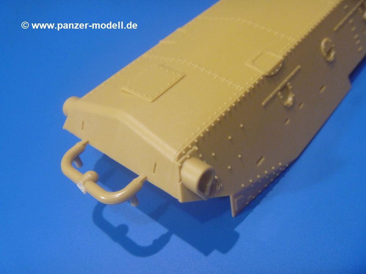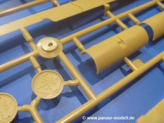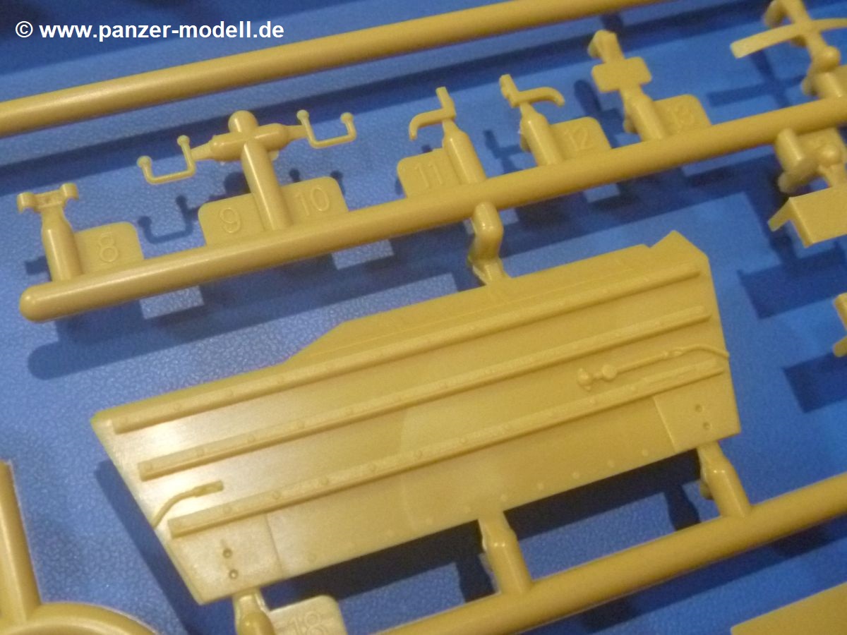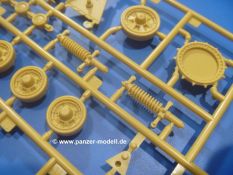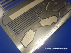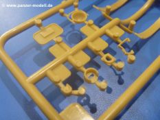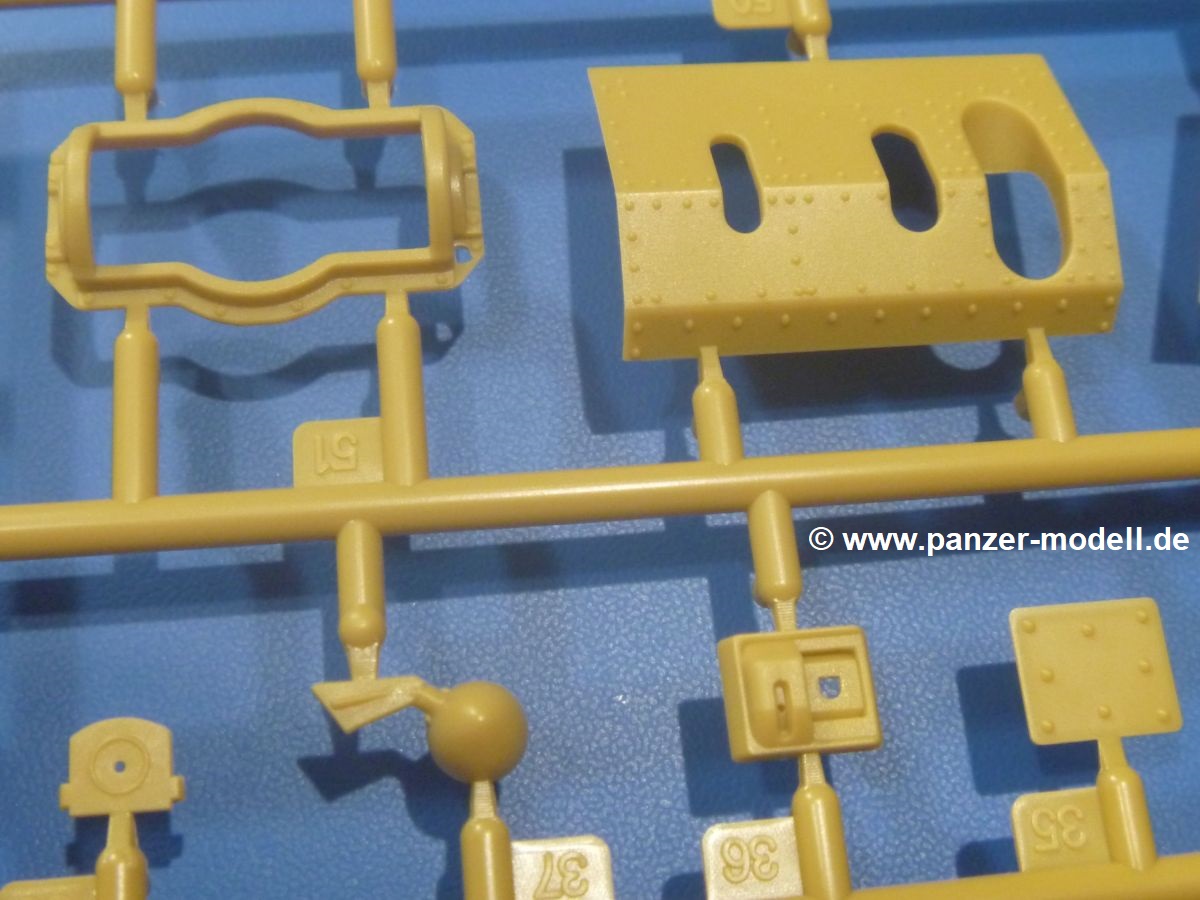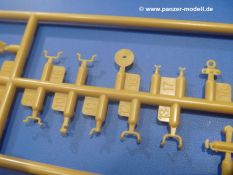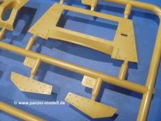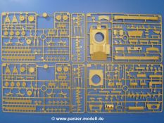 Wie nicht mehr anders zu erwarten, sind alle Teile sauber gespritzt, ohne Sinkstellen, Fischhäute oder Grat.Bei diesem Bausatz hat Bronco seiner Teileorgie abgeschworen. Es gibt weder Wannen-, noch Turminneneinrichtung, welches die Teilezahl übersichtlich macht.Die Wanne besteht aus einem Teil, aber dennoch mit vielen Details wie Wartungsdeckeln, Nieten und Lagerverschraubungen. Das Fahrgestell entspricht dem des Valentine - je Seite 2 große Lagerböcke, die die Rollenwagen mit je einem großen und 2 kleinen Laufrollen und ein Stützrad aufnehmen. Mittig zwischen den Lagerböcken findet man das 3. Stützrad. Lauf- und Stützrollen sind fein detailliert. Die typischen Federbeine bestehen diesmal aus je einem Teil. Hier kann man an den Gussnähten ein wenig versäubern, wenn man sein Modell in Nahaufnahmen präsentieren will. Die Abstützung der Lagerböcke besteht aus feinen PE Blechen. Der Getriebekasten, der die Antriebsräder aufnimmt, ist reichlich mit Scharnieren und Nieten versehen. Die Kette besteht aus verschieden langen Segmenten und Einzelgliedern für die Rundungen an Leit- und Antriebsrädern.Das Oberteil besteht aus einem Guss. Hier braucht man nur die Fahrerfront anbauen, die noch eine separate Fahrersichtklappe aufweist, die man ggfs. auch offenlassen kann. Beim Beifahrer hat man die Wahl zwischen einer Panzerplatte für die frühe Version oder einem Besa-Bug-MG. Fahrer- und Beifahrerluken können auch offen oder geschlossen gebaut werden. Für den Fahrer gibt es noch einen Winkelspiegel aus Klarsichtmaterial. Die großen Lufteinlässe links und rechts vom Motorraum werden zwecks besserer Detaillierung aus einzelnen Blechen zusammengesetzt. Für die Motorraumklappen gibt es so einige Handgriffe anzubringen. Ein schönes Teil ist der Auspuff. Dieser wird mit dem großen PE Gitter ummantelt und mit Zulauf- und Endrohr versehen. Die Fahrscheinwerfer auf der Bugplatte können wahlweise mit Glaseinsatz oder Tarnscheibe gebaut werden. Die Zuleitungen der Scheinwerfer sind auf der Bugplatte angegossen.Auch die Kettenabdeckungen bestehen aus einem Guss. Hier werden noch große Staukästen angebracht. Die linke und nur die linke Seite erhält eine Kettenschürze. Ich habe versucht, entsprechende Aufnahmen zu finden, aber nirgendwo konnte ich welche finden, die beide Seiten eines Fahrzeuges zeigen, das links die Kettenschürze trägt. Vorn auf der linken Kettenabdeckung wird der Außentank, wie wir ihn z.B. beim Matilda II oder auch beim Valentine wiederfinden. Er ruht auf Halterungen aus PE-Teilen, die nicht nur mehrfach gewinkelt sind, sondern auch noch Rundungen beinhalten. Die kleinsten Teile, mit denen Bronco diesmal aufwartet, sind die Flügelmutter der Heckleuchte und die Begrenzungsleuchten. Das Außenbordwerkzeug beschränkt sich auf Schaufel, Spitzhacke und Stiel, einen Ratschenschlüssel (?) und eine Brechstange. Dazu gibt es noch kleine Feuerlöscher. Die Hupe wurde ebenso wenig vergessen wie der Fahrerspiegel. Auf der rechten, hinteren Kettenabdeckung gibt es noch eine Kanisterhalterung, aber diesmal ohne den typischen Kraftstoffbehälter der Briten. Dafür gibt es zusätzlich am Heck eine große Kanisterhalterung aus PE-Teilen, die mit den Kanistern der beiden D Spritzlinge gefüllt werden können. Man hat die Wahl zwischen Wasser- und Kraftstoffkanistern. „1940 PETROLEUMSPIRIT HIGHLY INFAMMABLE“ findet man in erhabenen Buchstaben den Deckeln der Kraftstoffkanister.Beim Turm muss man sich dann entscheiden, welche Version - Mk. IIA oder Mk. IIA CS - man bauen möchte. Der Mk. IIA besitzt eine 2 Pfünder Kanone, deren Lauf natürlich aufgebohrt ist. Der Mk. IIA CS benutzt die gleiche Turmfront und Turm-MG wie der IIA, dafür hat er die 94mm Haubitze und eine andere Blende. Die Turmluken können offen oder geschlossen gebaut werden. Es gibt wieder einen Klarsicht-Winkelspiegel für den Kommandanten. Auch der Suchscheinwerfer wird mit einer Glasscheibe versehen. Lukenanschlag und Hilfsvisier des Kommandanten sind aus PE Teilen. Der Antennenfuß am Turmheck besteht aus 6 Teilen. So kommen die Details besser herausFür dieses Modell liegen Decals für 3 Fahrzeuge bei. Damit kann man folgende Fahrzeuge darstellen: