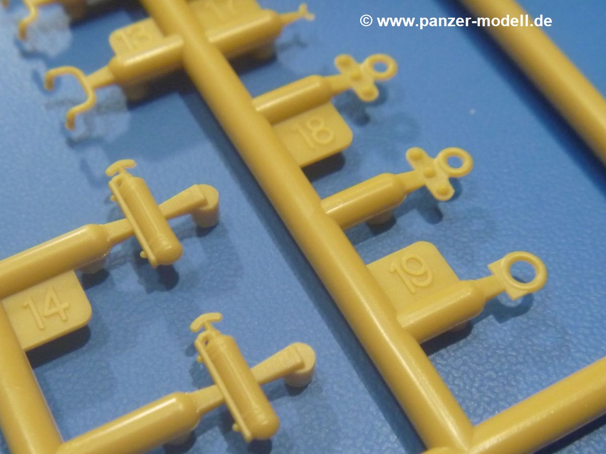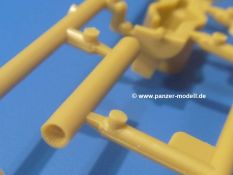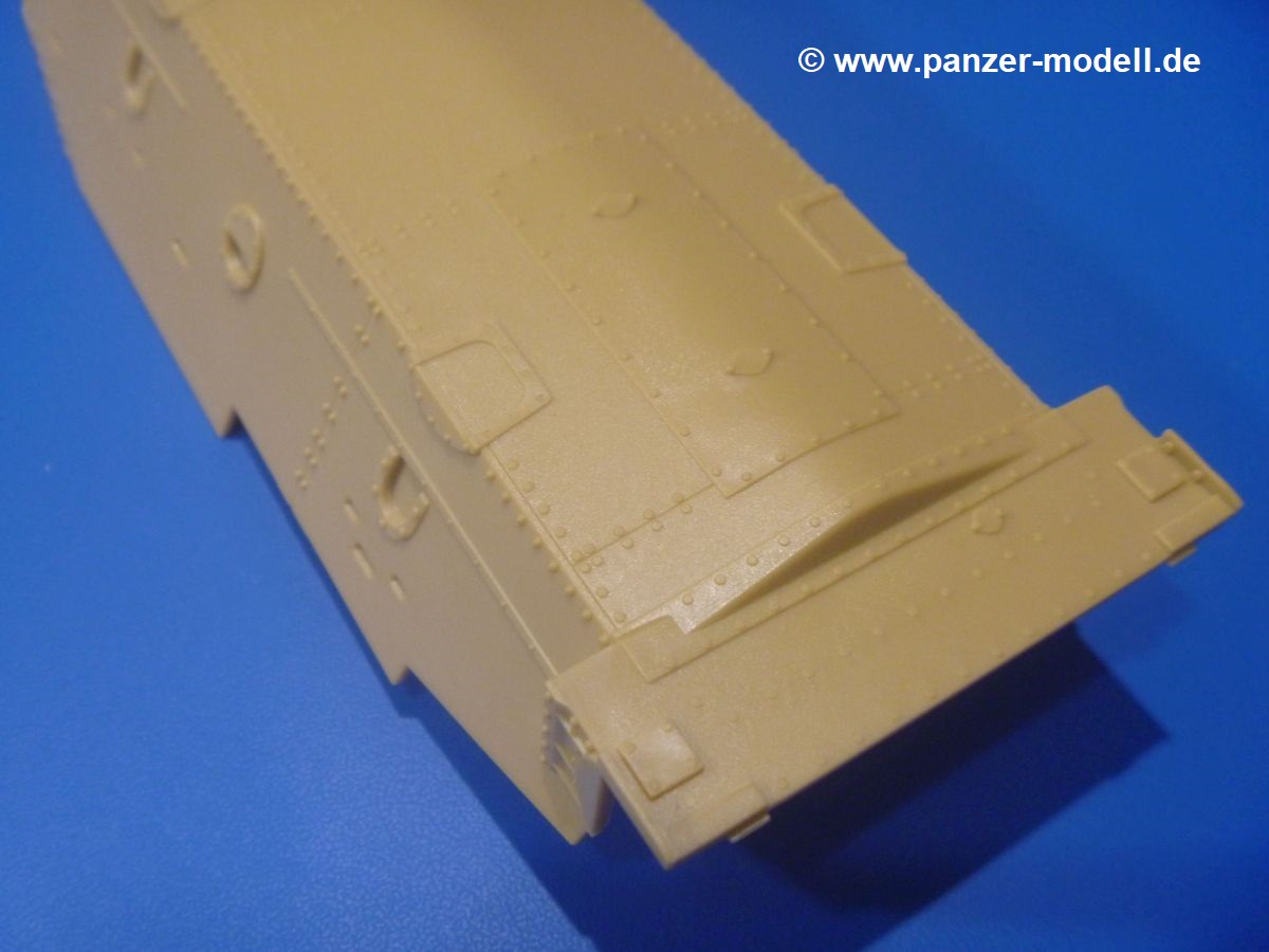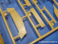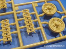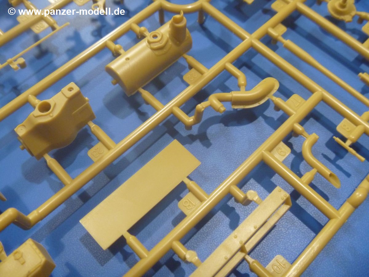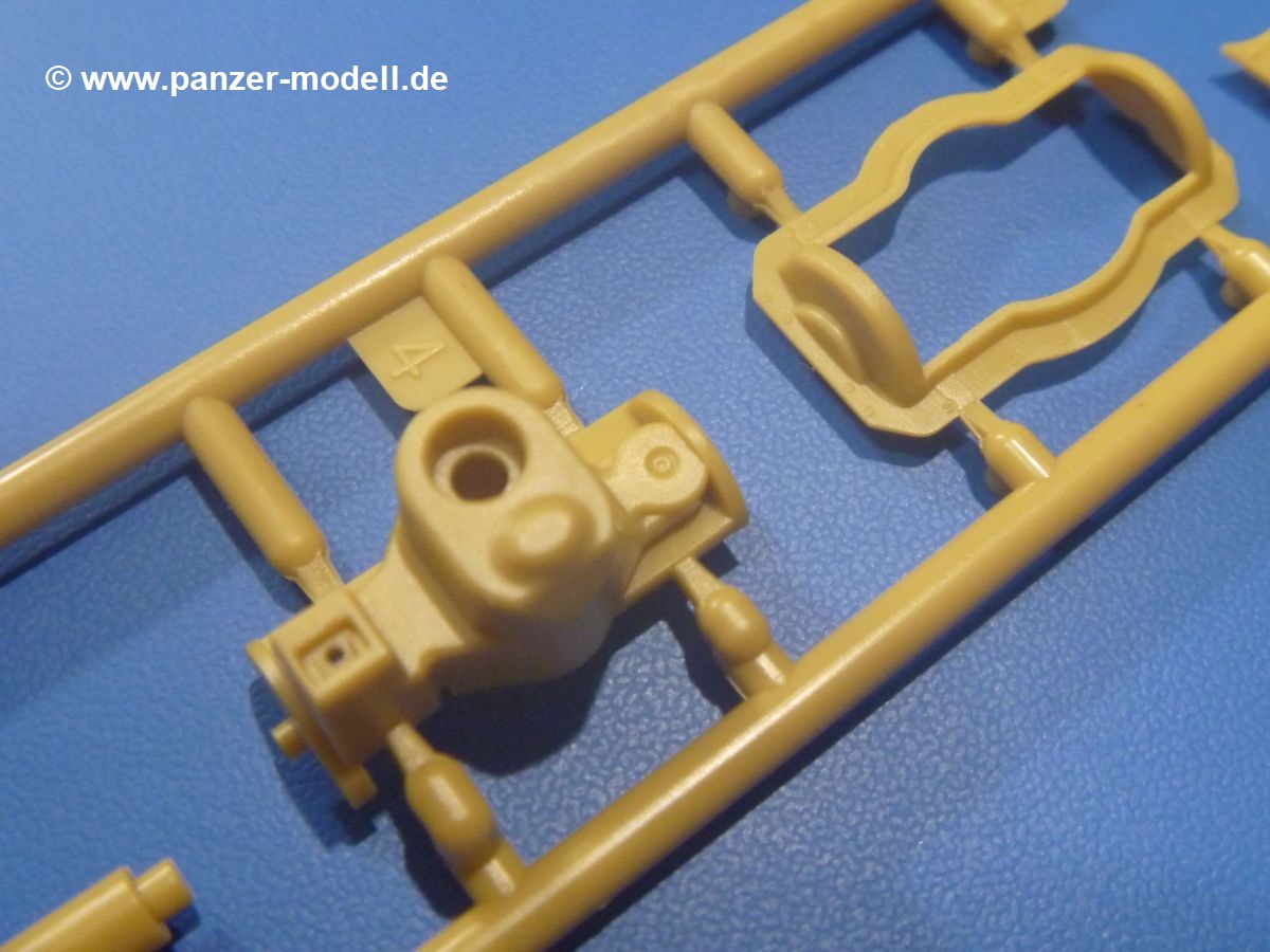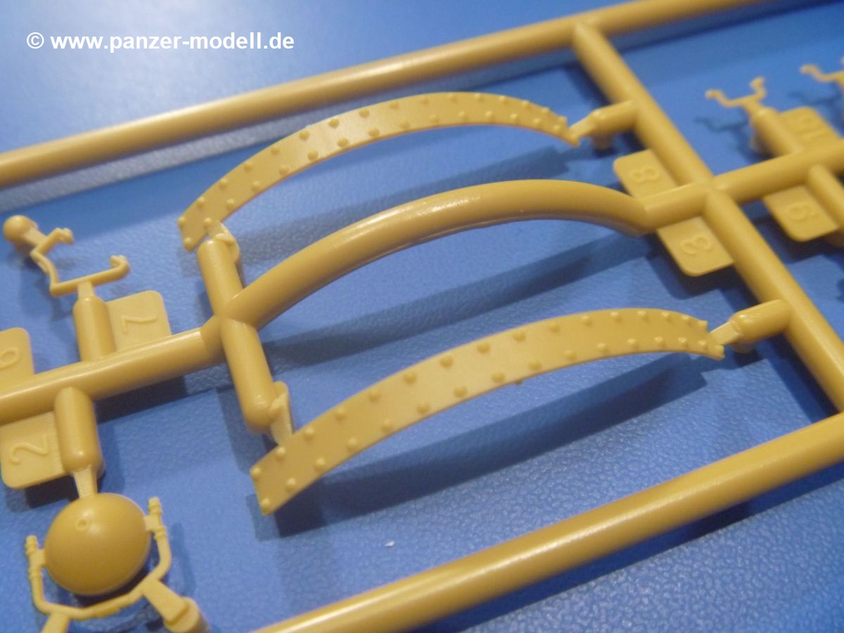 Wie nicht mehr anders zu erwarten, sind alle Teile sauber gespritzt, ohne Sinkstellen, Fischhäute oder Grat.Bei diesem Bausatz hat Bronco seiner Teileorgie abgeschworen. Es gibt weder Wannen-, noch Turminneneinrichtung, welches die Teilezahl übersichtlich macht.Die Wanne besteht aus einem Teil, aber dennoch mit vielen Details wie Wartungsdeckeln, Nieten und Lagerverschraubungen. Das Fahrgestell entspricht dem des Valentine - je Seite 2 große Lagerböcke, die die Rollenwagen mit je einem großen und 2 kleinen Laufrollen und ein Stützrad aufnehmen. Mittig zwischen den Lagerböcken findet man das 3. Stützrad. Lauf- und Stützrollen sind fein detailliert. Die typischen Federbeine bestehen diesmal aus je einem Teil. Hier kann man an den Gussnähten ein wenig versäubern, wenn man sein Modell in Nahaufnahmen präsentieren will. Die Abstützung der Lagerböcke besteht aus feinen PE Blechen. Der Getriebekasten, der die Antriebsräder aufnimmt, ist reichlich mit Scharnieren und Nieten versehen. Die Kette besteht aus verschieden langen Segmenten und Einzelgliedern für die Rundungen an Leit- und Antriebsrädern.Das Oberteil besteht aus einem Guss. Hier braucht man nur die Fahrerfront anbauen, die noch eine separate Fahrersichtklappe aufweist, die man ggfs. auch offenlassen kann. Beim Beifahrer hat man die Wahl zwischen einer Panzerplatte für die frühe Version oder einem Besa-Bug-MG. Fahrer- und Beifahrerluken können auch offen oder geschlossen gebaut werden. Für den Fahrer gibt es noch einen Winkelspiegel aus Klarsichtmaterial. Die großen Lufteinlässe links und rechts vom Motorraum werden zwecks besserer Detaillierung aus einzelnen Blechen zusammengesetzt. Für die Motorraumklappen gibt es so einige Handgriffe anzubringen. Ein schönes Teil ist der Auspuff. Dieser wird mit dem großen PE Gitter ummantelt und mit Zulauf- und Endrohr versehen. Die Fahrscheinwerfer auf der Bugplatte können wahlweise mit Glaseinsatz oder Tarnscheibe gebaut werden. Die Zuleitungen der Scheinwerfer sind auf der Bugplatte angegossen.Auch die Kettenabdeckungen bestehen aus einem Guss. Hier werden noch große Staukästen angebracht. Die linke und nur die linke Seite erhält eine Kettenschürze. Ich habe versucht, entsprechende Aufnahmen zu finden, aber nirgendwo konnte ich welche finden, die beide Seiten eines Fahrzeuges zeigen, das links die Kettenschürze trägt. Vorn auf der linken Kettenabdeckung wird der Außentank, wie wir ihn z.B. beim Matilda II oder auch beim Valentine wiederfinden. Er ruht auf Halterungen aus PE-Teilen, die nicht nur mehrfach gewinkelt sind, sondern auch noch Rundungen beinhalten. Die kleinsten Teile, mit denen Bronco diesmal aufwartet, sind die Flügelmutter der Heckleuchte und die Begrenzungsleuchten. Das Außenbordwerkzeug beschränkt sich auf Schaufel, Spitzhacke und Stiel, einen Ratschenschlüssel (?) und eine Brechstange. Dazu gibt es noch kleine Feuerlöscher. Die Hupe wurde ebenso wenig vergessen wie der Fahrerspiegel. Auf der rechten, hinteren Kettenabdeckung gibt es noch eine Kanisterhalterung, aber diesmal ohne den typischen Kraftstoffbehälter der Briten. Dafür gibt es zusätzlich am Heck eine große Kanisterhalterung aus PE-Teilen, die mit den Kanistern der beiden D Spritzlinge gefüllt werden können. Man hat die Wahl zwischen Wasser- und Kraftstoffkanistern. „1940 PETROLEUMSPIRIT HIGHLY INFAMMABLE“ findet man in erhabenen Buchstaben den Deckeln der Kraftstoffkanister.Beim Turm muss man sich dann entscheiden, welche Version - Mk. IIA oder Mk. IIA CS - man bauen möchte. Der Mk. IIA besitzt eine 2 Pfünder Kanone, deren Lauf natürlich aufgebohrt ist. Der Mk. IIA CS benutzt die gleiche Turmfront und Turm-MG wie der IIA, dafür hat er die 94mm Haubitze und eine andere Blende. Die Turmluken können offen oder geschlossen gebaut werden. Es gibt wieder einen Klarsicht-Winkelspiegel für den Kommandanten. Auch der Suchscheinwerfer wird mit einer Glasscheibe versehen. Lukenanschlag und Hilfsvisier des Kommandanten sind aus PE Teilen. Der Antennenfuß am Turmheck besteht aus 6 Teilen. So kommen die Details besser herausFür dieses Modell liegen Decals für 3 Fahrzeuge bei. Damit kann man folgende Fahrzeuge darstellen: