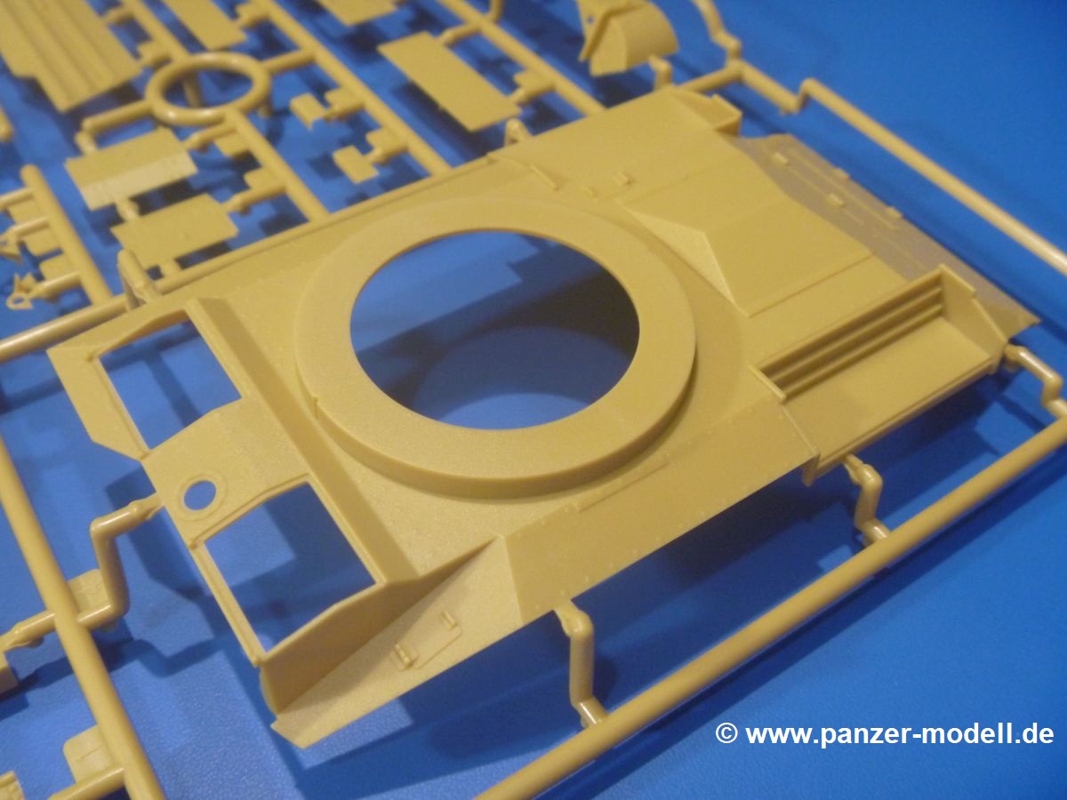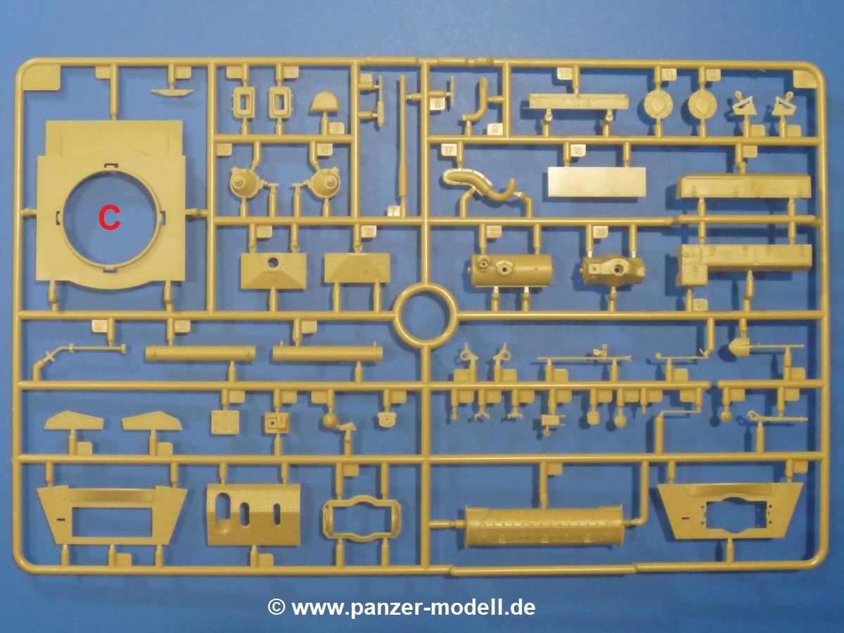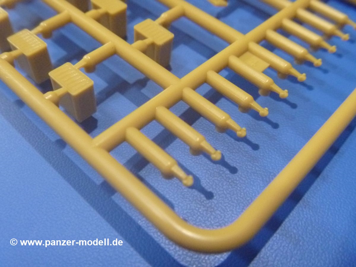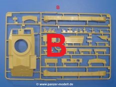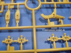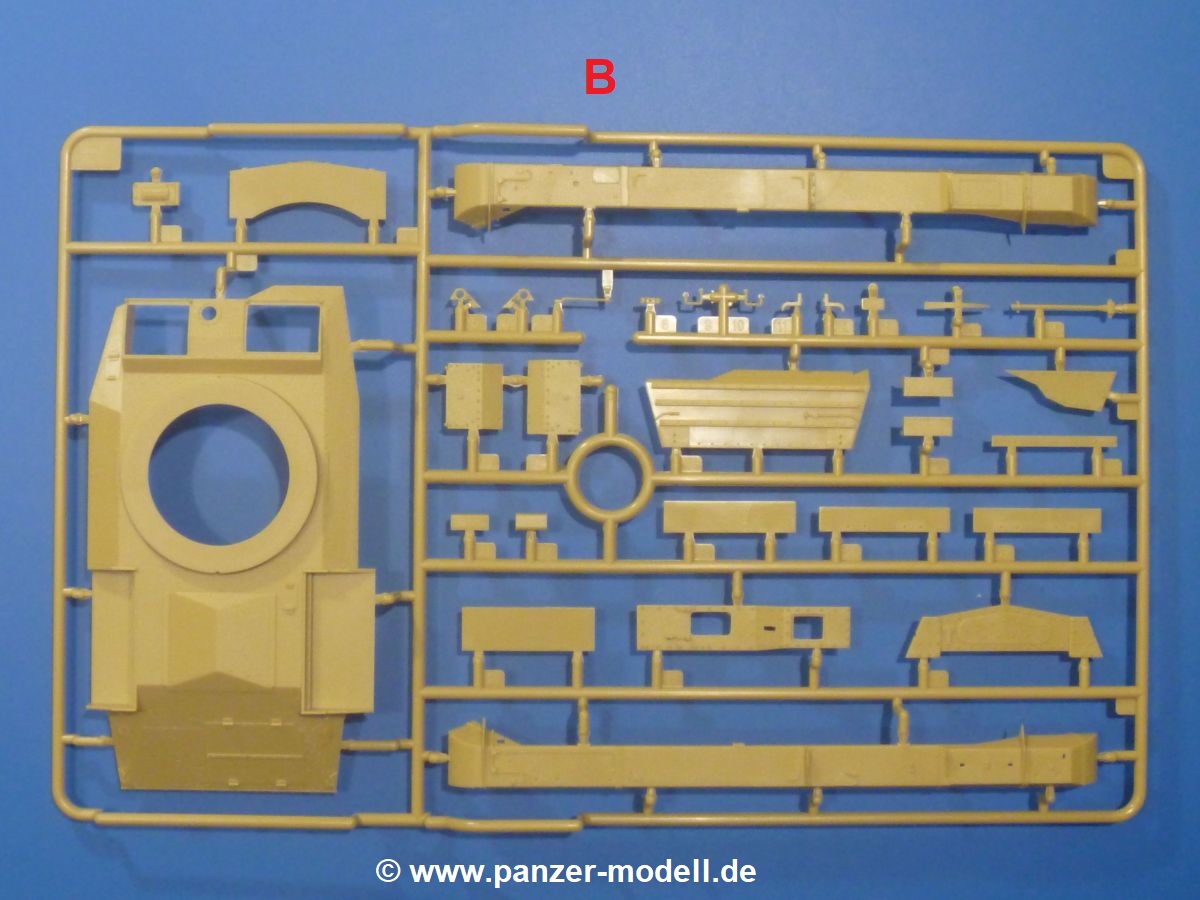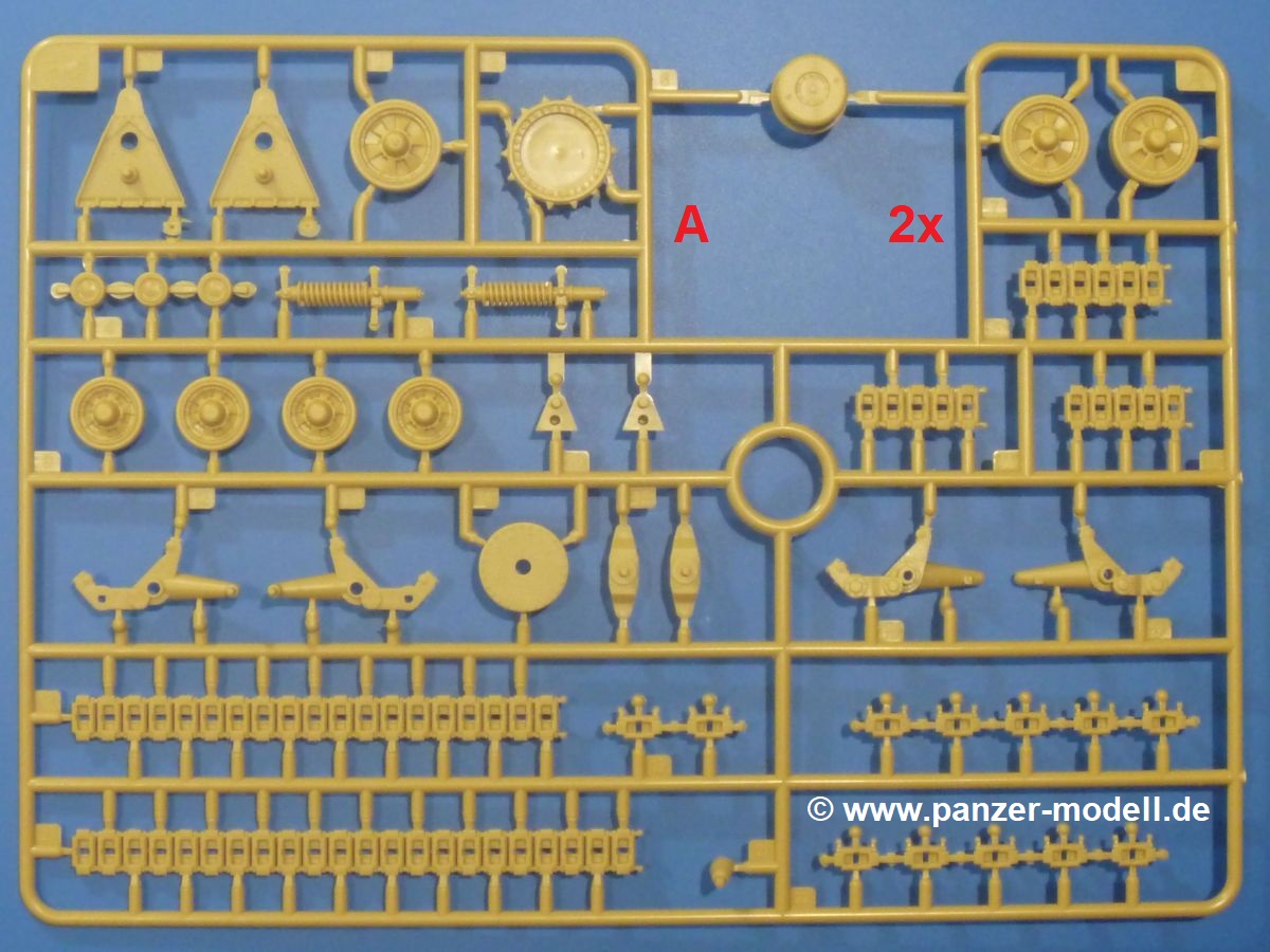 Der Bausatz: Bronco hatte bereits den A10 unter der Nr. CB35150 herausgebracht. Nun folgt eine „Balkan“ Version, offensichtlich Erkennungsmerkmal ist der große Kraftstoffbehälter auf der linken Kettenabdeckung.Im Karton finden wir 1 Klarsichtspritzling, 10 sandgelbe, Unterwanne, Turmoberteil, 2 Ätzteilplatinen, einen Decalbogen und eine 16-seitige Bauanleitung im A4 Format.Die Spritzlinge sind wie folgt aufgeteilt: