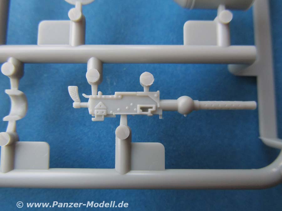 Für das Turmdach steht ein fein detailliertes .50cal Browning MG und verschiedene Antennenausstattungen zur Verfügung. Ein paar Kanister und Munitionsboxen liegen dem Bausatz als Zubehör bei.