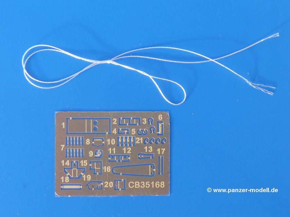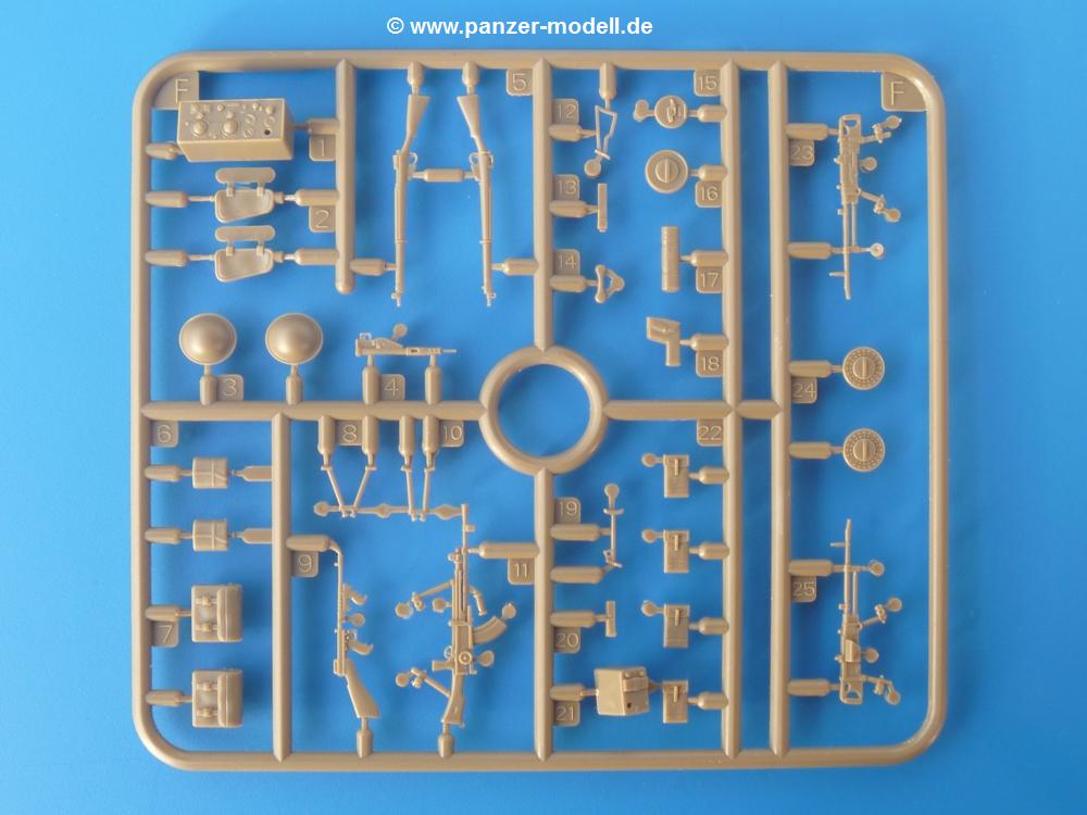 Im Karton befinden sich 4 oliv-grüne Spritzlinge für das Geschütz, 4 weitere mit Munition und Munitionskisten, einer mit Waffen und Ausrüstung der Soldaten und die beiden Reifen. Dazu kommen 4 graue Spritzlinge mit den Soldaten, eine Ätzteilplatine, Bindfaden für das Drahtseil, ein Decalbogen mit Beschriftungen für Munition und Munitionskisten und einer mit Rangabzeichen der Soldaten. Die teils farbige Bauanleitung im A4 Format hat 12 Seiten.