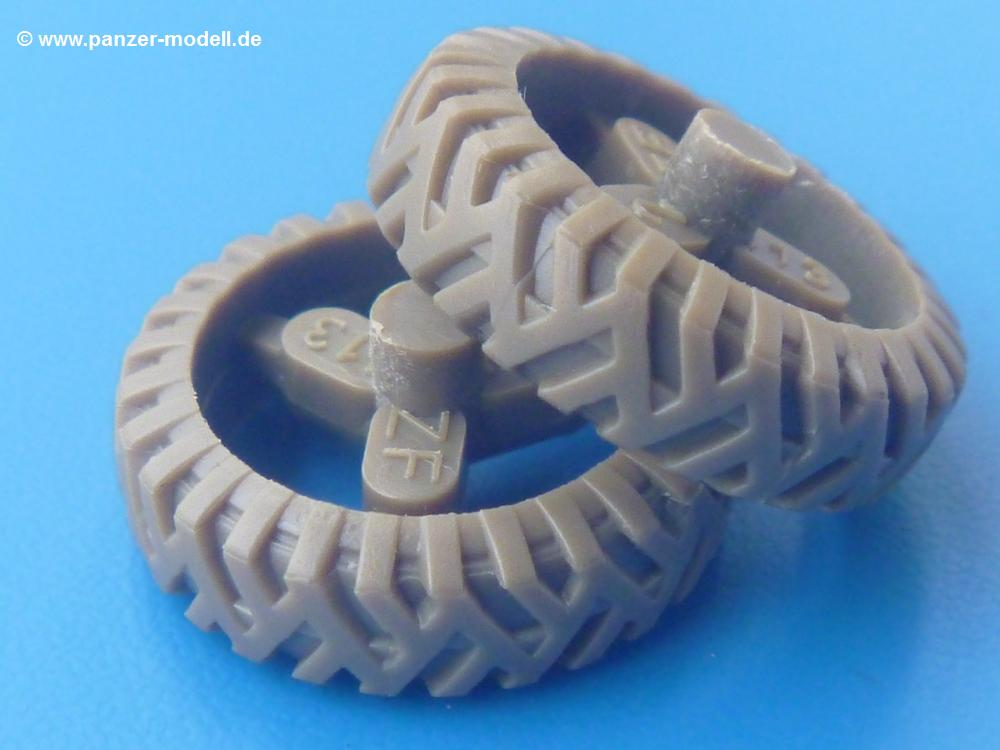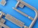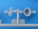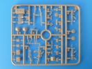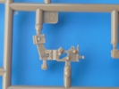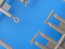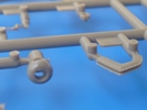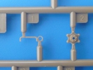 Bei den Lafettenholmen kam man früher mal mit 2-3 Teilen pro Holm aus. Dies ist bei Bronco anders. Ein Holm besteht aus über 20 Teilen, welches natürlich den Detailgrad um ein etliches erhöht und es zudem möglich macht, die Holme auch in Lufttransportstellung (eingeklappt) zu bauen. Wie schon bei anderen Bausätzen befinden sich an den Spritzlingen einzelne Nieten, die abgetrennt und einzeln angebracht werden. Die Radachse fällt durch angenehm große und vergleichsweise wenige Teile auf. Schön dargestellt sind die beiden Handbremshebel. Bei einem Rad würde man auf 2-3 Teile tippen (Reifen, Felge, Bolzen). Es sind aber 10 (!). Die Reifen mit dem hervorstechenden Profil sind dabei die größten, die geätzten Zurr-Ösen an den Radnaben die kleinsten Teile.