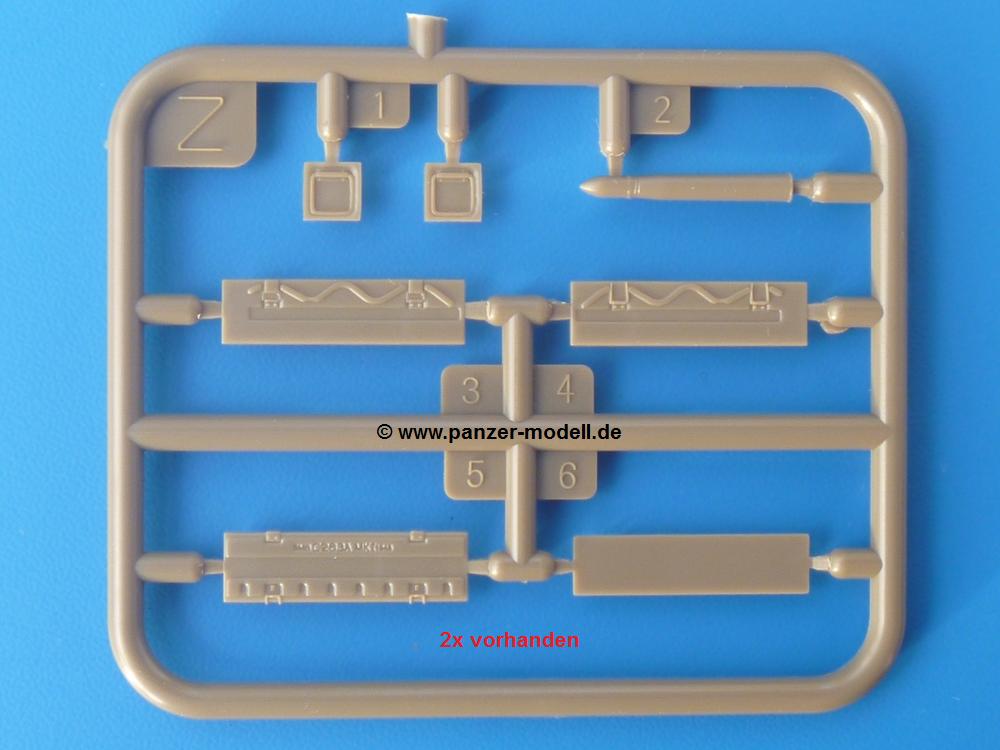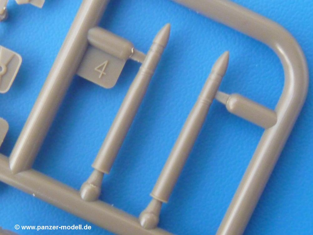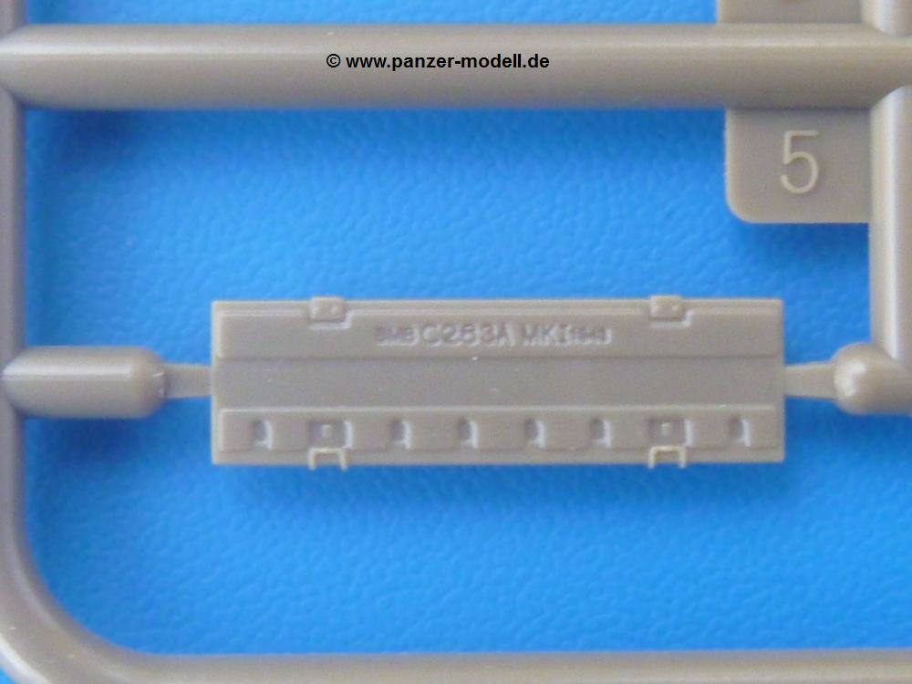 Als Zubehör liegen noch 2 Sorten Munitionskisten mit der entsprechenden Munition bei. Sehr schön detailliert (man achte auf den eingravierten Code der kleineren Kiste) kommt man mit 6 Teilen pro Kiste aus. Scharniere, Verschlüsse und Tragegriffe sind bereits angegossen. Die Kisten können aber nur in geschlossenem Zustand gebaut werden, erhalten dafür aber eine Unzahl an Decals, wobei man bei den größeren Kisten zwischen 2 Decalvarianten wählen kann.