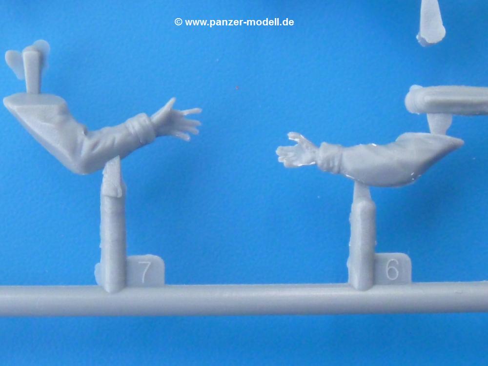 Als Geschützbesatzung sind 4 Soldaten enthalten. Ein Ladeschütze, der grad eine Patrone in den Verschluss einführen will. Dann der, mit einem zugekniffenen Auge, Richtschütze, der grad ein Ziel anvisiert. Soldat C ist ein liegender Schütze, von dem ich immer noch nicht weiß, was er da macht. Von der Handhaltung her stützt er irgendetwas ab. Zum Schluss kommt noch der Geschützführer, der mit seinem Fernglas das Zielgebiet beobachtet. Alle Figuren haben schöne Gesichter. Die gepolsterten Riemen der Helme kommen mir etwas dick vor. Faltenwurf und Detaillierung der Kleidung und Ausrüstung sind toll. Die Helme sind mit Tarnnetz und Tarnmaterial versehen. Bei manchen Soldaten sind die genagelten Schuhsohlen als separate Teile dabei. Ausrüstungsgegenstände wie Rücken- oder Munitionstaschen ergänzen das Outfit. Die Dienstgradabzeichen gibt es als Decals dazu, die aber bei den Tarnanzügen gemäß Anleitung keine Anwendung finden. Nur die Fallschirmspringerschwinge wird am rechten Arm angebracht.