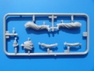Der Spritzling A ist der größte und beherbergt die meisten Teile. Zum Beispiel die 18 (!) Teile für den Motor mit Anbauteilen, der fertig gestellt kleiner als das letzte Daumenglied eines durchschnittlichen Erwachsenen ist. Trotz seiner Winzigkeit sind alle wichtigen Details klar erkennbar. Die Klappen für den Motorraum und die Kühlerhaube haben Details auf beiden Seiten, da sie sich sowohl im geschlossenen als auch offenen Zustand bauen lassen. Das Gestänge der Vorderradaufhängung ist so fein, dass man beim Abtrennen von Teil A43 vom Spritzling vorsichtig vorgehen muss. Fast schon als irre zu bezeichnen ist die Tatsache, dass sogar die Bremstrommeln noch Details aufweisen. Die größten Teile an diesem Spritzling sind die beiden Türen und der Unterboden der Limousine, den man für den Lieferwagen aber nicht braucht. An den Innenseiten der Türen sind jeweils eine Stofftasche angebracht.