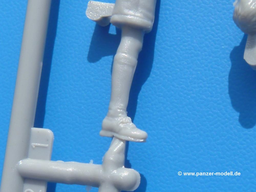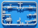 Diesmal sind 3 zivile Figuren dem Bausatz beigelegt. Die Nonne (grauer Spritzling A) besteht aus 8 Teilen - den beiden Beinen, Vorder- und Rückseite des Habits, den weiten Ärmeln mit den Händen, dem Oberkörper mit Ordenskreuz und dem Kopf und dem Schleier. Die Gesichtsdetails sind etwas schwammig, aber der Faltenwurf der Kleidung und Details der Schuhe sind gut. Der Nonne zur Seite steht ein kleiner Junge (grauer Spritzling C) bestehend aus den beiden Beinen inkl. Unterkörper, den Armen, Oberkörper und Kopf. Den Abschluss bildet der Lieferwagenfahrer, der mit dem Ein-/Ausladen der Milchkannen beschäftig ist. Seine Gesichtszüge mit dem freundlichen Lächeln finde ich gelungen. Auch er besteht aus den beiden Beinen inkl. Unterkörper, den Armen, Oberkörper und Kopf. Am Kopf ist eine Baskenmütze angegossen. Der hintere Verschluss seiner Hosenträger ist das 7. Teil der Figur.