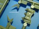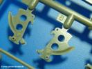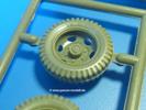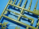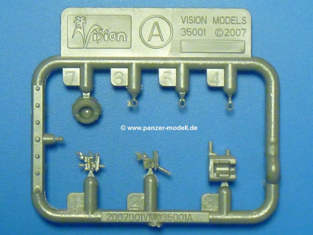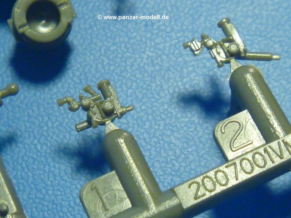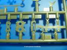 Wie beim Bronco Bausatz CB35163 ist die Haubitze die gleiche, die Vision Models im Jahr 2008 als Einzelmodell herausbrachte. Bronco hat jenes Modell 1:1 mitsamt Vision Models Logo und Modell-Nr. übernommen und einen eigenen Spritzling Kd mit Teilen zur besseren Darstellung der Räder und des hinteren Lafettenträgers beigelegt. Im Vergleich erkennt man die Vision Spritzlinge an dem dunkleren oliv-grün zu den helleren Bronco Teilen. Die Detaillierung und Feinheit der Teile finde ich sehr ordentlich, besonders bei der Visiereinrichtung und den Heberingen. Die über die Rohrmündung geschobene Muffe liegt als Messingteil bei. Leider findet man an den Vision Spritzlingen leichten Grat. Vorhandene Auswerferspuren verschwinden meist beim Zusammenbau außer dem an der linken Seite des Rohrkörpers. Der Bronco Spritzling Kd erfüllt aber alle Qualitätsanforderungen. Kein Grat oder Auswerferspuren. Das Profil der Reifen ist sehr fein. Ein zusätzlicher Munitionskasten liegt bei. Die hinteren Lafettenträger sind hohl dargestellt wie beim Original. Manche Teile (Kd15, Kd16) sind aber wieder so winzig (klein wäre untertrieben), dass man sie kaum als solche erkennt. Man muss den Spritzling hin- und herdrehen, um zu erkennen, wo das Teil vom Spritzling zu trennen ist. Dem Bausatz liegen 2 lose Räder mit Längsprofil und 2 Spritzlinge (Kc) mit Handwaffen bei, die aber in der Bauanleitung keine Erwähnung/Verwendung finden (Danke, Bronco!)