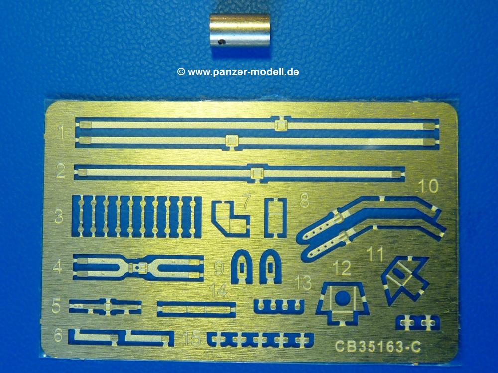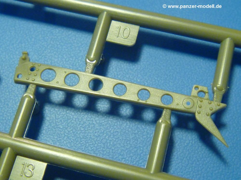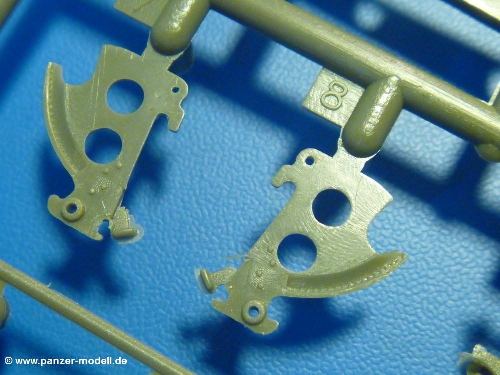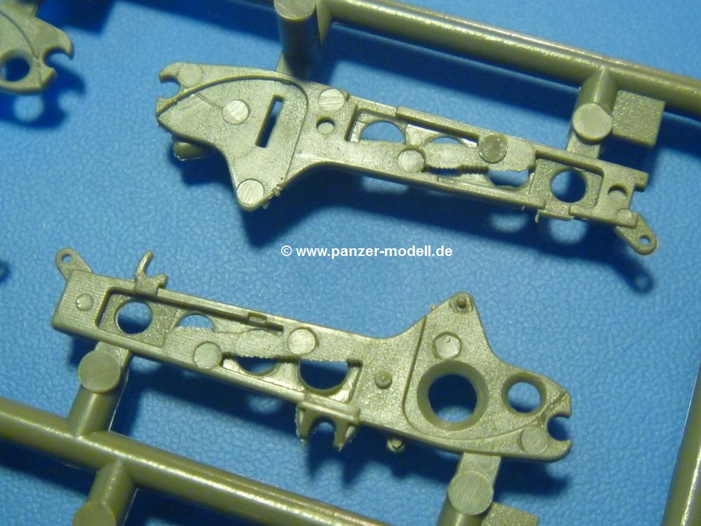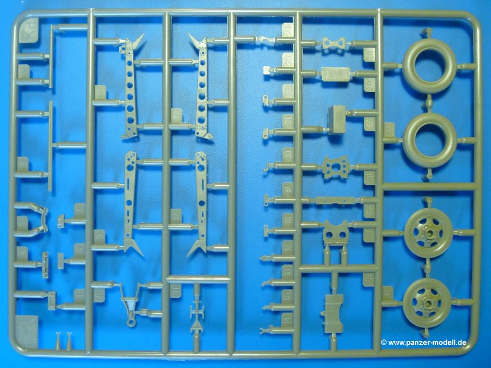 - Kd oliv-grün (1x): Längsprofilräder, hinterer Lafettenträger, Munitionskasten, Stützplatte - PC PE Teile (1x): Halterungen, Gurte, Verschlüsse, Nieten/Schrauben, Bügel - Z Metall (1x): Metallmuffe für Rohrmündung - Räder dunkel oliv-grün (2x): Längsprofilräder (nicht in der Bauanleitung vorgesehen)
