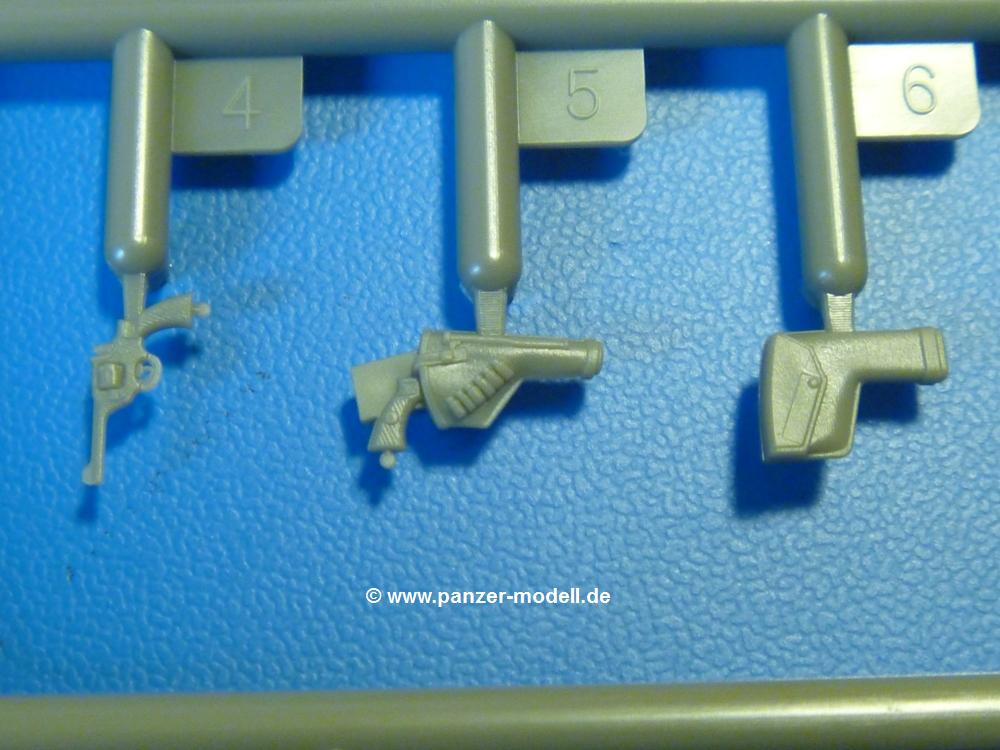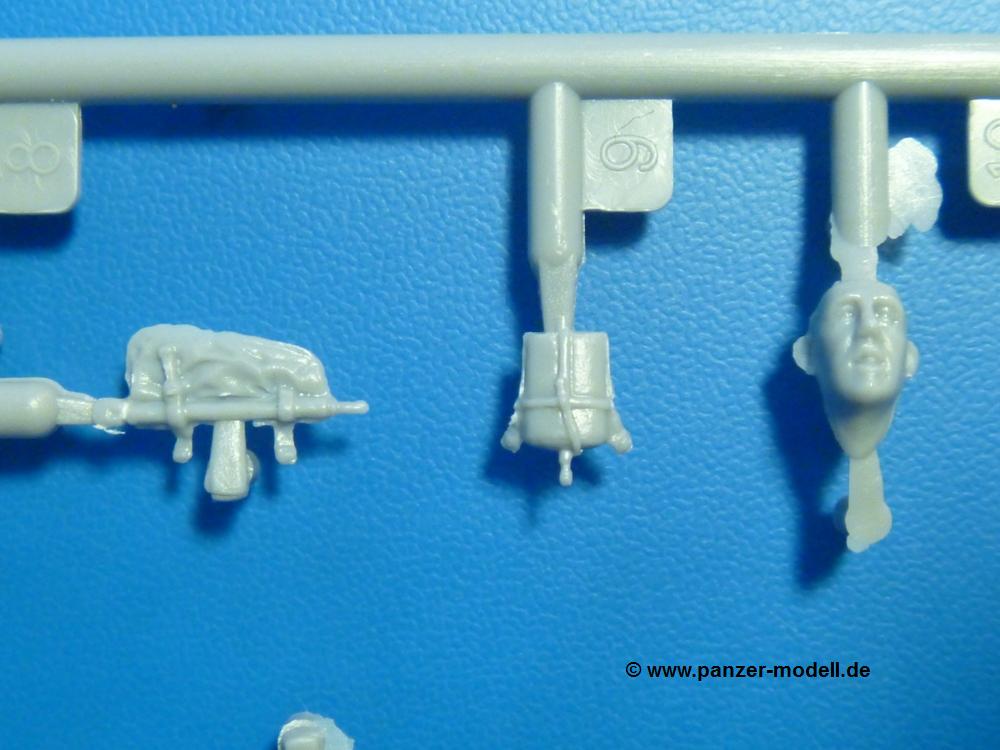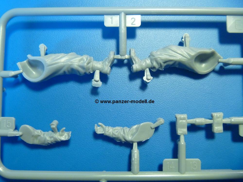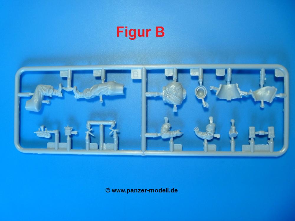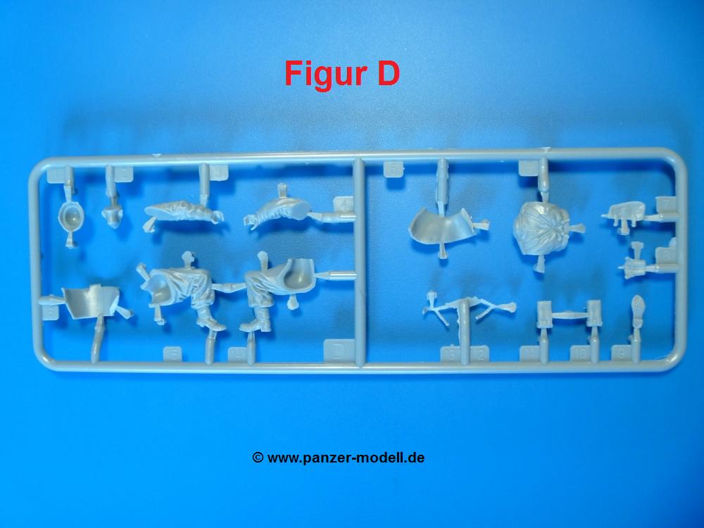 Figuren: - A hell-grau (1x): Arme, Beine, Rockschöße, Rumpf, Kopf, Helm, Helmriemen, 2 Magazintaschen, Feldflasche, Tasche, genagelte Schuhsohle (Richtkanonier) - B hell-grau (1x): Arme, Beine, Rockschöße, Rumpf, Kopf, Helm, Helmriemen, 2 Magazintaschen, Feldflasche, Tasche (Ladekanonier 1) - C hell-grau (1x): Arme, Beine, Rockschöße, Rumpf, Kopf, Helm, Helmriemen, 2 Magazintaschen, Feldflasche, Tasche (Beobachter (?)) - D hell-grau (1x): Arme, Beine, Rockschöße, Rumpf, Kopf, Helm, Helmriemen , 2 Magazintaschen, Feldflasche, Tasche, genagelte Schuhsohle (Geschützführer) - E hell-grau (1x): Arme, Beine, Rockschöße, Rumpf, Kopf, Helm, Helmriemen, 2 Magazintaschen, Feldflasche, Tasche (Ladekanonier 2)