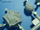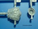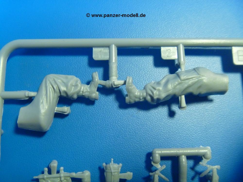 Die Geschützbedienung besteht aus 5 Figuren - dem Geschützführer, 1 Richt- und 2 Ladekanonieren und einem Beobachter (?). Von den Posen her machen sie eher einen entspannten Eindruck wie bei einem Übungsschiessen. Jede Figur ist in Arme, Beine, Rockschöße, Rumpf und Kopf aufgeteilt. Dazu kommen Helm und Helmriemen, Magazintaschen, Feldflasche und eine Tasche. Die knienden Soldaten erhalten für den hochstehenden Fuß eine separate genagelte Schuhsohle. Die beiden Ladekanoniere halten Munition aus dem Geschützbausatz in den Händen. Alle Figuren haben annehmbare und einigermaßen unterschiedliche Gesichter. Faltenwurf und Detaillierung der Kleidung und Ausrüstung sind toll.