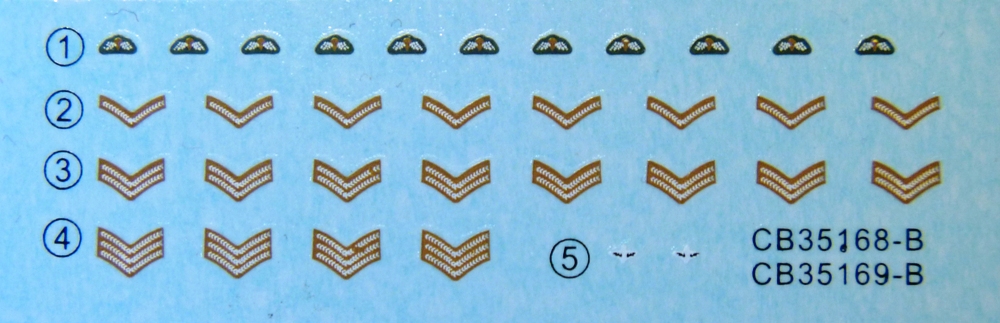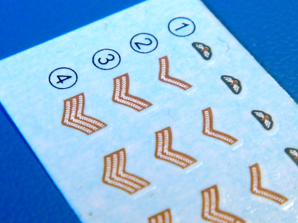 Die Dienstgradabzeichen gibt es als Decals dazu. Zur Auswahl stehen Lance Corporal, Corporal und Sergeant. Dazu kommt die Fallschirmspringerschwinge, die am rechten Arm angebracht wird.