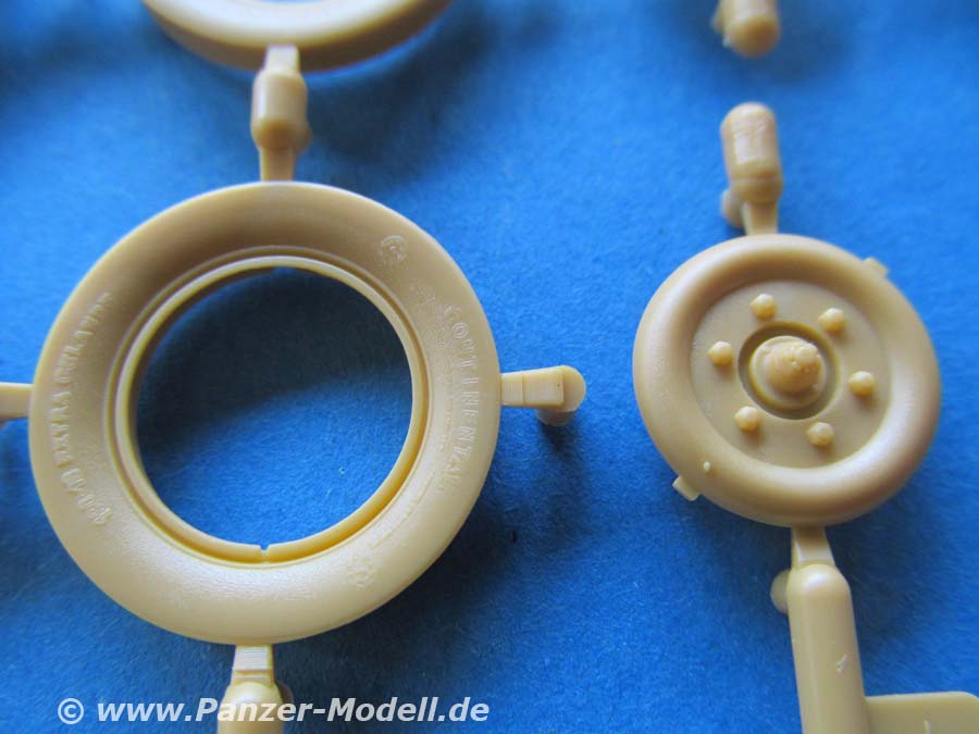 Die Vorderachse sollte ohne größere Probleme mit Lenkeinschlag gebaut werden können. Die Reifen sind sauber gespritzt mit feinem Profil und realistischem dünnen herstelleraufdruck auf den Reifenflanken. Jeder Reifen setzt sich aus bis zu 8 Einzelteilen zusammen. Gerade die Art des Zusammenbaus des Reifens ist eigenwillig, denn die Felgen, Reifenflanken und Laufflächen setzen sich einzeln zusammen und können dabei zu unschönen Spalten führen, wenn man nicht aufpasst. Für die Felgen stehen zwei Optionen entweder mit Schutzkappe oder Felgenring zur Verfügung.