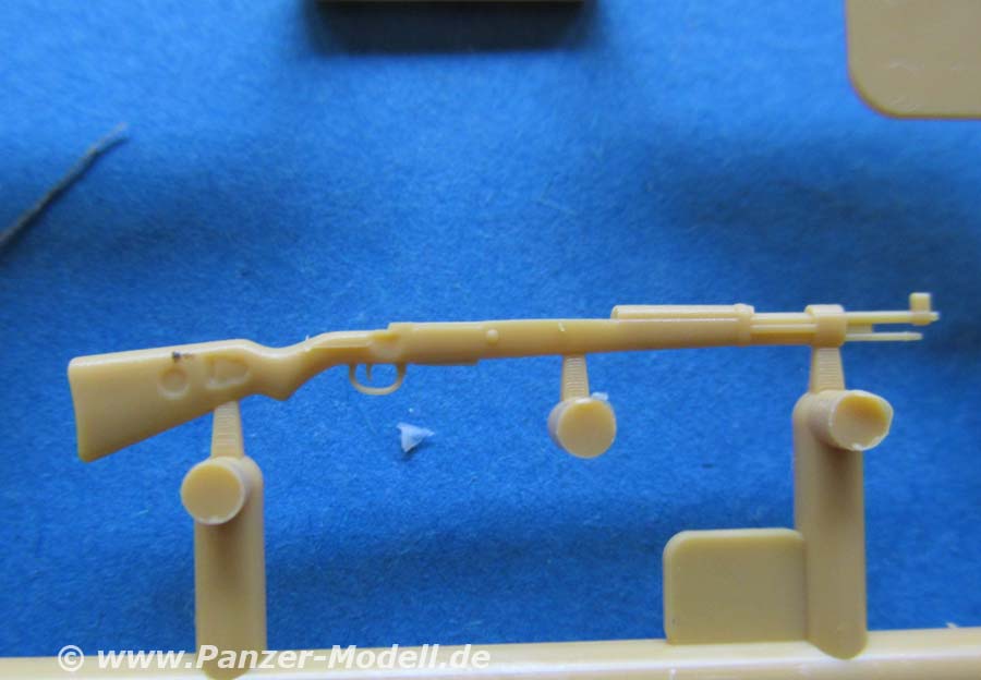 Der Aufbau ist dann natürlich auch mehrteilig mit sehr schöner Bodenplatte mit Struktur und natürlich einem kompletten und sehr detaillierten Innenraum. Die Sitzbänke weisen eine tolle Struktur auf, die Funkgeräteausstattung ist komplett mit ebenfalls schön detaillierten Armaturen, ebenso wie der Fahrerplatz mit Armaturenbrett. Und es fehlt auch nicht an so kleinen Details wie Gewehrhalterungen inklusive der Karabiner, die widerum sehr fein udn detailliert sind - sogar der Abzug ist eingespritzt und sehr sehr fein.
