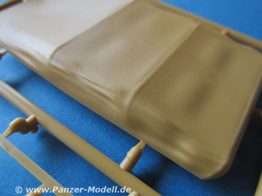 Die Windschutzscheibe lässt sich auch abklappen oder aufstellen, insbesondere wenn man das beiliegende Verdeck mit anbaut Das Verdeck ist mal richtig gut relungen der obere Abschluss mit tollem Faltenwurf und den Absackungen zwischen den Spriegeln. Die hinteren Seitenteile des Verdecks sind auch sehr gelungen, insbesondere mit den kleinen Verzurrlaschen. Ebenfalls sehr gelungen sind die seitlichen Fensterteile. Diese sind aus klarem Plastik, was in diesem Fall insofern genial ist, als dass nicht nur das Fenster, sondern die umgebende Plane mit vielen feinen Details und Falten auch mit im Teil ist.
