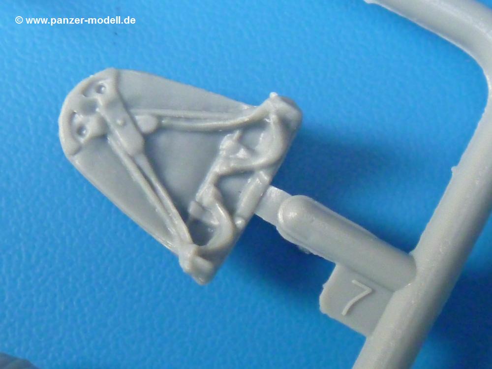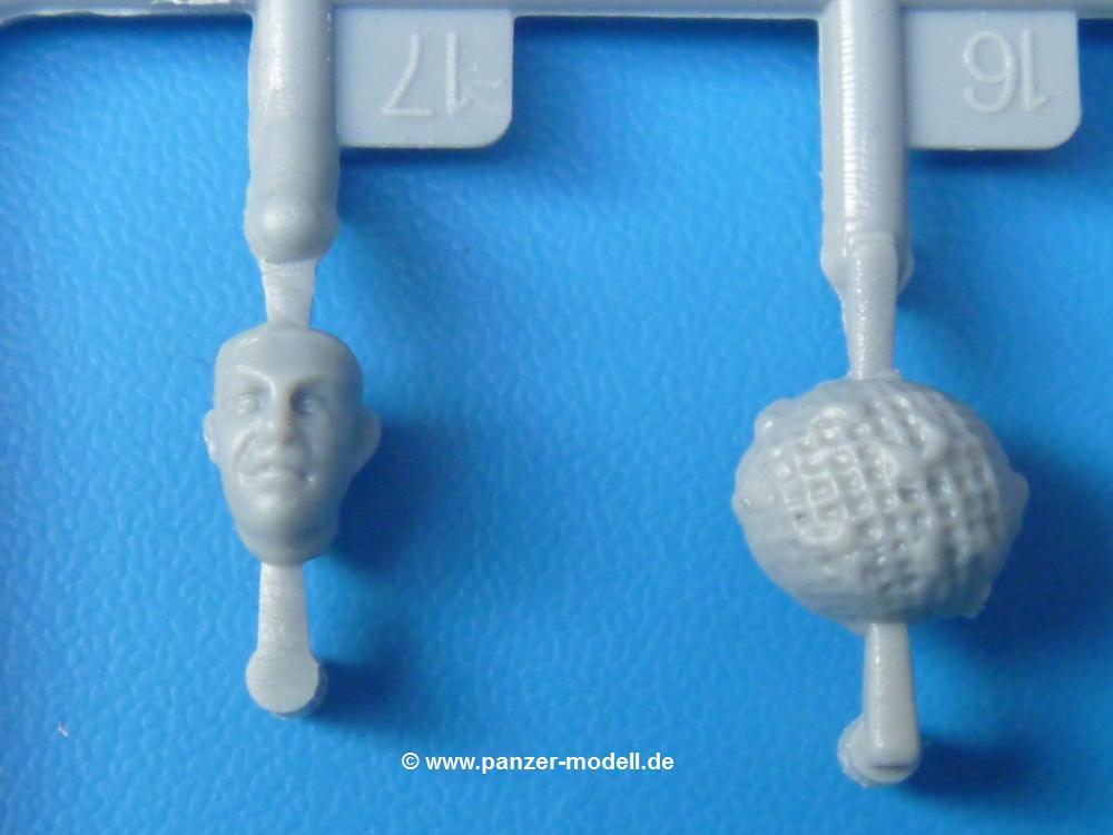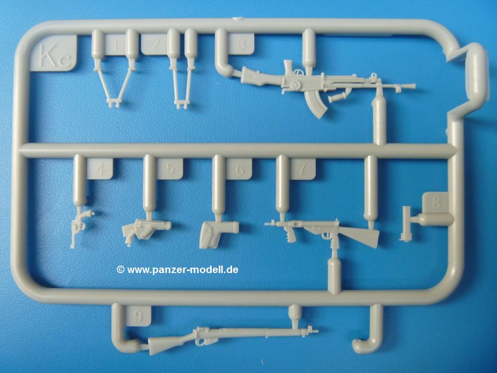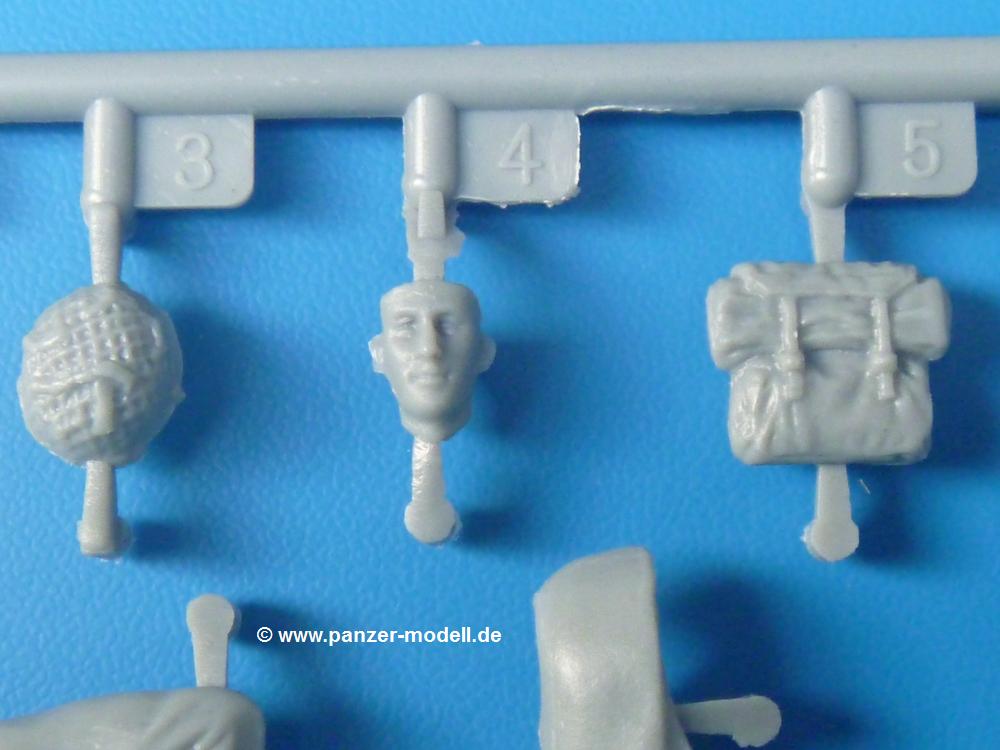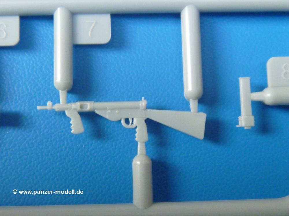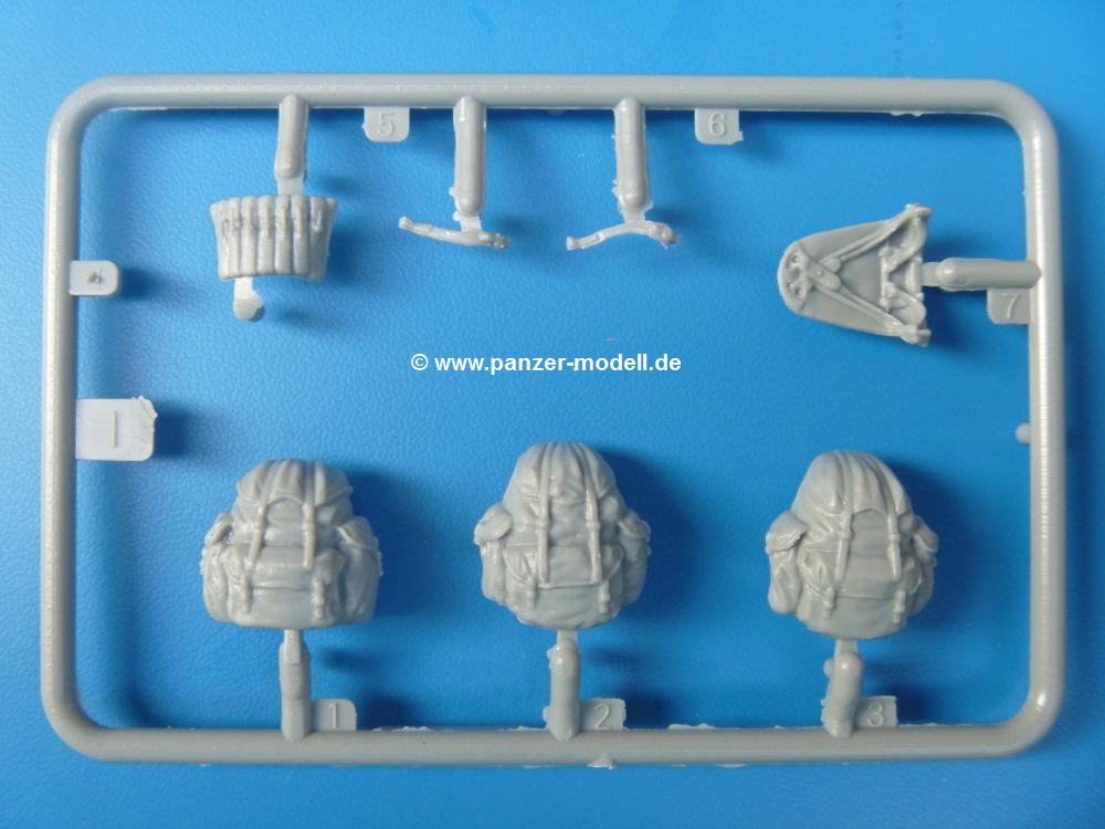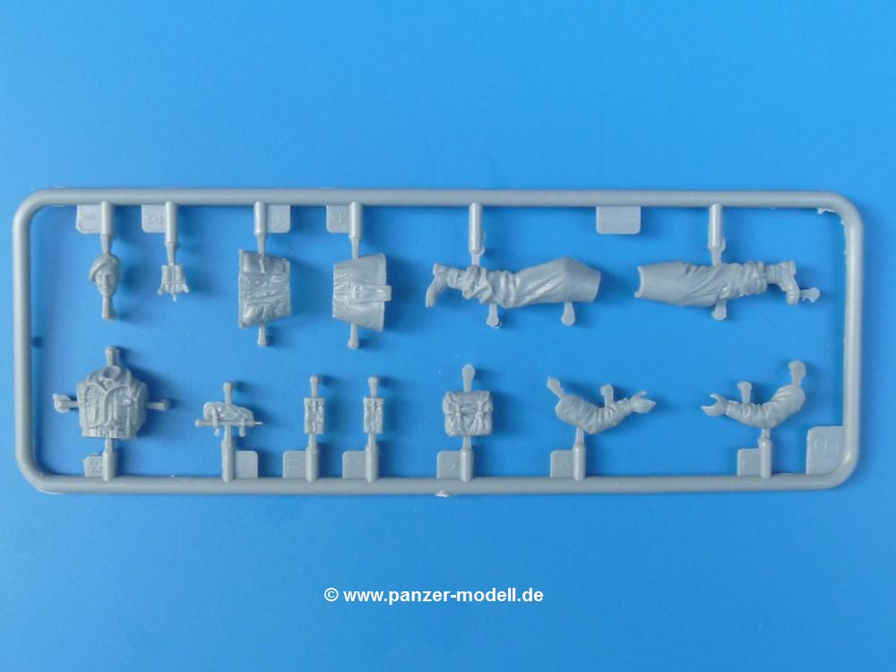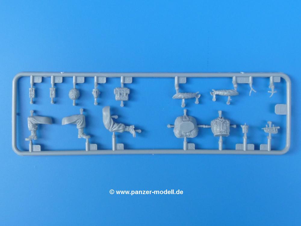 Die Teile sind wie üblich sauber gespritzt, ohne Versatz oder dicken Grat. Die Versäuberung kann sich fast nur auf die Angussstellen beschränken. Die vielen, sehr kleinen Teile sind Highlight und Herausforderung in einem. Die Gesichter der Soldaten sind gut gestaltet. Die Details kommen einem etwas "weich" vor, sind aber durchaus akzeptabel und für Spritzguss toll geworden.Soldat Handkarre schiebendHier handelt es sich um einen aufrecht gehenden Soldaten, ausgerüstet mit 2 Munitionstaschen, Rucksack, Schanzwerkzeugtasche mit Stiel und Feldflasche. Sein Barret ist bereits am Kopf angegossen.Die einfache Handkarre besteht aus 21 Teilen. Sie ist zwar faltbar, aber im Bausatz nur ausgeklappt darstellbar, damit der Soldat sie auch schieben kann. Die Stoffbespannung ist sehr schön dargestellt. Die Räder lassen sich drehbar montieren, wobei mir hier der Sinn nicht ganz verständlich ist. Die Beladung kann man mit dem vorhandenen Material individuell gestalten. Die Anleitung macht keine Vorgaben dazu, aber geht man nach dem Kartonbild, lädt man z.B. die PIAT Munitionsbehälter, die PIAT selbst, Helm (vom separaten Spritzling D) und den Karabiner des Soldaten auf.Die PIAT (Projector, Infantry, Anti-Tank) ist ein Kleinod. Man hat die Möglichkeit, diese Waffe mit eingeklappter Visiereinrichtung ohne Granate zu bauen oder eben einsatzbereit. Die Aufnahme für Granate besteht aus Ätzteilen. Es ist kein Trageriemen vorhanden - selbst herstellen. Zum Transport auf dem Karren wird man wohl eher die eingeklatte Visiereinrichtung ohne Granate nehmen.Soldat, Welbike (Minimotorrad) aus dem Abwurfbehälter hebendDas winzige Motorrad allein besteht aus 48 (!) Teilen und wird zusammengeklappt gebaut. Hier kommen Teile im Zehntelmillimeterbereich zum Einsatz. Viele Kleinteile sind nur als PE-Teile vorhanden (Bremshebel, Kette, Felgen etc). Die Bauanleitung gibt sogar an, wie dieser Winzling zu verkabeln ist, bzw. Verlauf des Gas- und Bremszuges. Allerdings muss man die Kabel und Züge selbst herstellen. Je nach Version muss man noch 2 bis 7 Decals an dem Winzling anbringen.Für den Abwurfbehälter des Welbikes liegen alle Teile bei, um ihn geschlossen, offen mit Welbike oder offen leer zu bauen. Für den Satz ist die offene Version gefragt.Der Soldat ist knieend dargestellt, wie er das Welbike aus dem Behälter hebt, bzw. auf dem linken Knie abstützt. Wegen dieser Haltung gibt es für den rechten Schuh die Sohle extra. Seine Ausrüstung besteht aus Helm mit Tarnnetz, 2 Munitionstaschen, Rucksack, Schanzwerkzeugtasche mit Stiel und Feldflasche.Soldat, auf Welbike (Minimotorrad) aufgesessenFür diese Welbike gilt das gleiche wie bereits oben angegeben, nur das man es fahrbereit baut. Den dazugehörigen Abwurfbehälter kann man auch weglassen oder anderweitig verwenden. Da es der gleiche Typ wie vorher ist, kann er geschlossen oder offen leer gebaut werden.Wie der Radfahrer im Set A hat auch dieser Fahrer 3 Beine, damit man ihn entweder fahrend mit beiden Füßen auf den Fussrasten oder anhaltend mit dem linken Fuß abgesetzt gestalten kann. Auch er ist mit Helm mit Tarnnetz, 2 Munitionstaschen, Rucksack, Schanzwerkzeugtasche mit Stiel und Feldflasche ausgerüstet. Die Anleitung sieht keine Anbringung einer Waffe vor, das Kartonbild zeigt ihn mit geschultertem Karabiner, aber ggfs. kann man ihm auch die MP umhängen.Die zusätzlich beiliegenden Rucksäcke sind sehr schön und hinten hohl. Für einen ist ein Tragegestell mit Tragschlaufen dabei. Am Spritzling der Rucksäcke sind auch nach Magazintaschen dabei. Alle diese Teile sind nicht besonders in der Anleitung erwähnt. Man kann sie also nach Belieben verwenden.Aus dem Minispritzling der 4 Fallschirmjägerhelme mit Tarnnetz und -material braucht man iegntlich nur den einen für den gehenden Soldaten. Die anderen 3 sind zur freien Verfügung, da die anderen Soldaten ihre Helme bereits am eigenen Spritzling haben.Ein Decalbogen hat Rangabzeichen vom Private bis zum Sergeant plus Fallschirmjägerschwingen anzubieten, aber die Anleitung schweigt sich über die Anbringung aus. Der zweite Bogen enthält die Decals für ein Welbike, Abwurfbehälter und PIAT Munitionsbehälter. Laut Anleitung soll der gleiche Bogen 2-mal vorhanden sein. Im Besprechungsmuster lag nur einer bei.Die farbige Bauanleitung auf dem Kartonrücken zeigt die gebauten Figuren mit den Nummern, wohin die Teile gehören. Hier sind die Bemalungshinweise mittels Farbnamen angegeben. Für die Welbikes, Abwurfbehälter, Handkarren, PIAT und die Waffen liegt eine kleine 12-seitige Anleitung im A5-Format im Karton. Die Anleitung enthält auch die komplette Spritzlingaufteilung und die Farbangaben bei Verwendung von Mr. Hobby, Hobby Color, Humbrol und Tamiya Farben in einer Tabelle. Wer einen Blick in die Anleitung werfen möchte, kann Sie sich hier unter "Instruction Sheets" anschauen und/oder herunterladen.Wie schon Set A ein schöner Figurensatz mit viel Zubehör - prima in Dioramen zu verwenden. In Deutschland muss man ca. 27-28 EUR auf den Ladentisch legen. |
