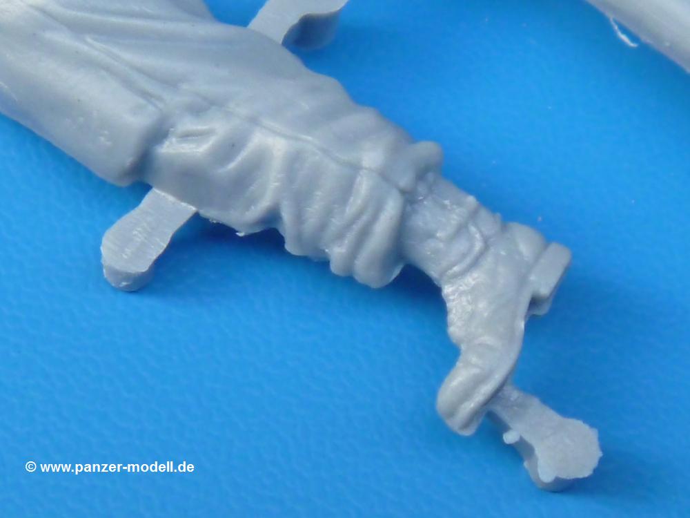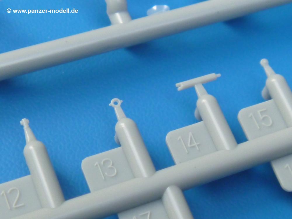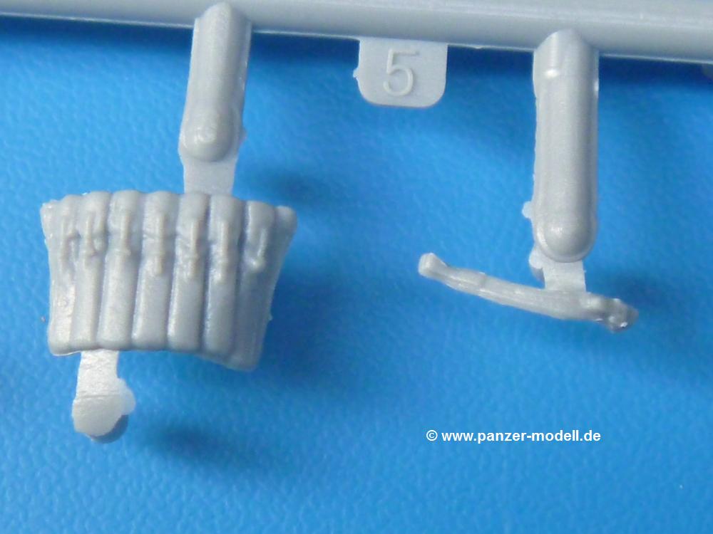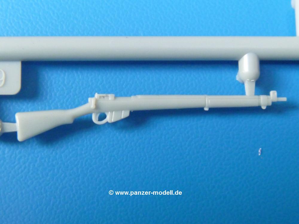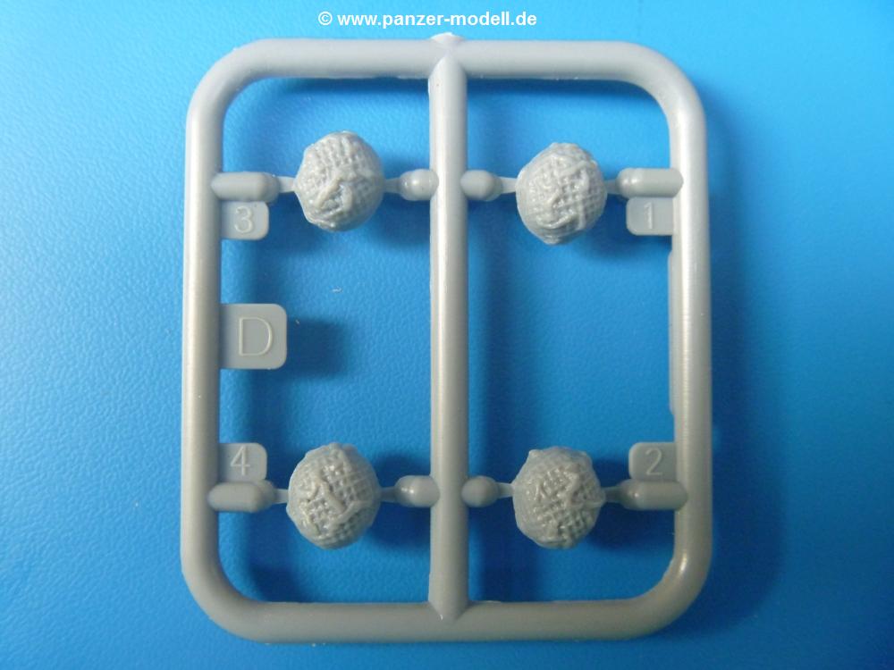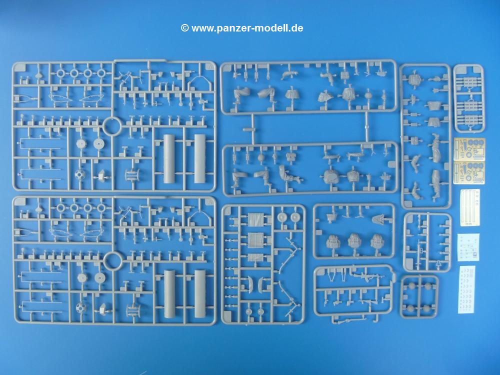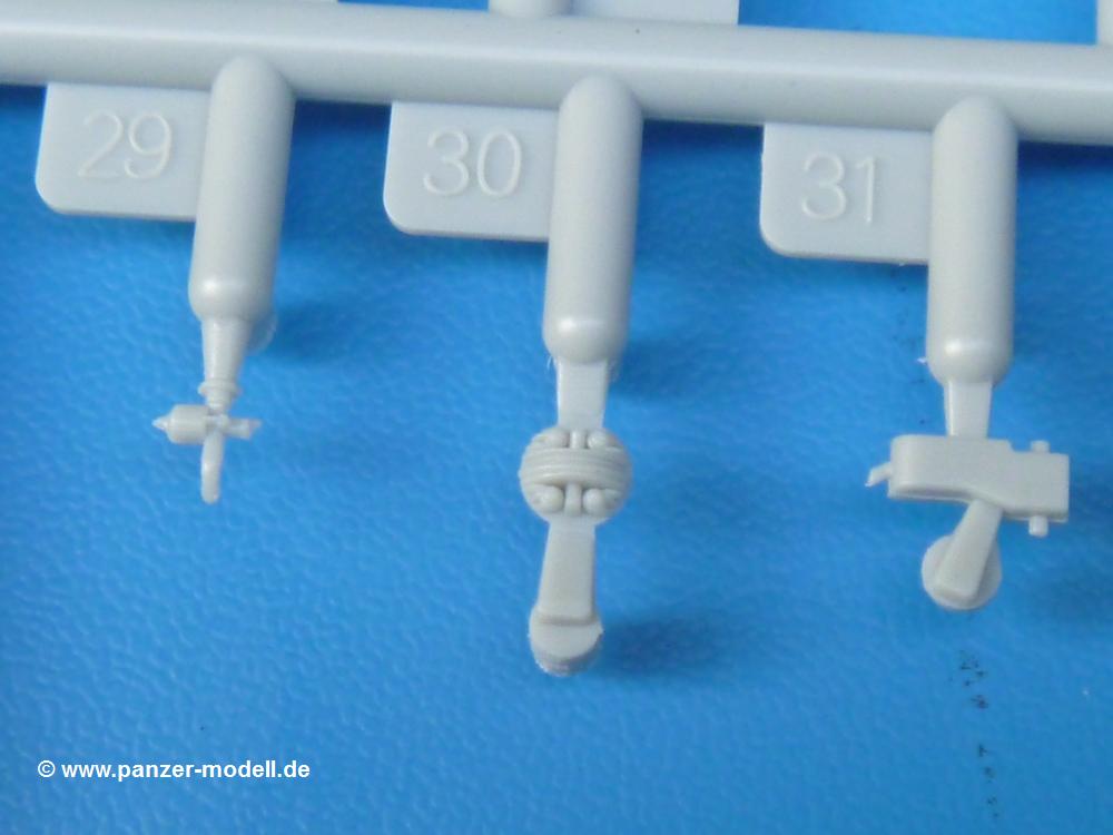 Die Teile sind wie üblich sauber gespritzt, ohne Versatz oder dicken Grat. Die Versäuberung kann sich fast nur auf die Angussstellen beschränken. Die vielen, sehr kleinen Teile sind Highlight und Herausforderung in einem. Die Gesichter der Soldaten sind gut gestaltet. Die Details kommen einem etwas "weich" vor, sind aber durchaus akzeptabel und für Spritzguss toll geworden.Soldat Handkarre schiebendHier handelt es sich um einen aufrecht gehenden Soldaten, ausgerüstet mit 2 Munitionstaschen, Rucksack, Schanzwerkzeugtasche mit Stiel und Feldflasche. Sein Barret ist bereits am Kopf angegossen.Die einfache Handkarre besteht aus 21 Teilen. Sie ist zwar faltbar, aber im Bausatz nur ausgeklappt darstellbar, damit der Soldat sie auch schieben kann. Die Stoffbespannung ist sehr schön dargestellt. Die Räder lassen sich drehbar montieren, wobei mir hier der Sinn nicht ganz verständlich ist. Die Beladung kann man mit dem vorhandenen Material individuell gestalten. Die Anleitung macht keine Vorgaben dazu, aber geht man nach dem Kartonbild, lädt man z.B. die PIAT Munitionsbehälter, die PIAT selbst, Helm (vom separaten Spritzling D) und den Karabiner des Soldaten auf.Die PIAT (Projector, Infantry, Anti-Tank) ist ein Kleinod. Man hat die Möglichkeit, diese Waffe mit eingeklappter Visiereinrichtung ohne Granate zu bauen oder eben einsatzbereit. Die Aufnahme für Granate besteht aus Ätzteilen. Es ist kein Trageriemen vorhanden - selbst herstellen. Zum Transport auf dem Karren wird man wohl eher die eingeklatte Visiereinrichtung ohne Granate nehmen.Soldat, Welbike (Minimotorrad) aus dem Abwurfbehälter hebendDas winzige Motorrad allein besteht aus 48 (!) Teilen und wird zusammengeklappt gebaut. Hier kommen Teile im Zehntelmillimeterbereich zum Einsatz. Viele Kleinteile sind nur als PE-Teile vorhanden (Bremshebel, Kette, Felgen etc). Die Bauanleitung gibt sogar an, wie dieser Winzling zu verkabeln ist, bzw. Verlauf des Gas- und Bremszuges. Allerdings muss man die Kabel und Züge selbst herstellen. Je nach Version muss man noch 2 bis 7 Decals an dem Winzling anbringen.Für den Abwurfbehälter des Welbikes liegen alle Teile bei, um ihn geschlossen, offen mit Welbike oder offen leer zu bauen. Für den Satz ist die offene Version gefragt.Der Soldat ist knieend dargestellt, wie er das Welbike aus dem Behälter hebt, bzw. auf dem linken Knie abstützt. Wegen dieser Haltung gibt es für den rechten Schuh die Sohle extra. Seine Ausrüstung besteht aus Helm mit Tarnnetz, 2 Munitionstaschen, Rucksack, Schanzwerkzeugtasche mit Stiel und Feldflasche.Soldat, auf Welbike (Minimotorrad) aufgesessenFür diese Welbike gilt das gleiche wie bereits oben angegeben, nur das man es fahrbereit baut. Den dazugehörigen Abwurfbehälter kann man auch weglassen oder anderweitig verwenden. Da es der gleiche Typ wie vorher ist, kann er geschlossen oder offen leer gebaut werden.Wie der Radfahrer im Set A hat auch dieser Fahrer 3 Beine, damit man ihn entweder fahrend mit beiden Füßen auf den Fussrasten oder anhaltend mit dem linken Fuß abgesetzt gestalten kann. Auch er ist mit Helm mit Tarnnetz, 2 Munitionstaschen, Rucksack, Schanzwerkzeugtasche mit Stiel und Feldflasche ausgerüstet. Die Anleitung sieht keine Anbringung einer Waffe vor, das Kartonbild zeigt ihn mit geschultertem Karabiner, aber ggfs. kann man ihm auch die MP umhängen.Die zusätzlich beiliegenden Rucksäcke sind sehr schön und hinten hohl. Für einen ist ein Tragegestell mit Tragschlaufen dabei. Am Spritzling der Rucksäcke sind auch nach Magazintaschen dabei. Alle diese Teile sind nicht besonders in der Anleitung erwähnt. Man kann sie also nach Belieben verwenden.Aus dem Minispritzling der 4 Fallschirmjägerhelme mit Tarnnetz und -material braucht man iegntlich nur den einen für den gehenden Soldaten. Die anderen 3 sind zur freien Verfügung, da die anderen Soldaten ihre Helme bereits am eigenen Spritzling haben.Ein Decalbogen hat Rangabzeichen vom Private bis zum Sergeant plus Fallschirmjägerschwingen anzubieten, aber die Anleitung schweigt sich über die Anbringung aus. Der zweite Bogen enthält die Decals für ein Welbike, Abwurfbehälter und PIAT Munitionsbehälter. Laut Anleitung soll der gleiche Bogen 2-mal vorhanden sein. Im Besprechungsmuster lag nur einer bei.Die farbige Bauanleitung auf dem Kartonrücken zeigt die gebauten Figuren mit den Nummern, wohin die Teile gehören. Hier sind die Bemalungshinweise mittels Farbnamen angegeben. Für die Welbikes, Abwurfbehälter, Handkarren, PIAT und die Waffen liegt eine kleine 12-seitige Anleitung im A5-Format im Karton. Die Anleitung enthält auch die komplette Spritzlingaufteilung und die Farbangaben bei Verwendung von Mr. Hobby, Hobby Color, Humbrol und Tamiya Farben in einer Tabelle. Wer einen Blick in die Anleitung werfen möchte, kann Sie sich hier unter "Instruction Sheets" anschauen und/oder herunterladen.Wie schon Set A ein schöner Figurensatz mit viel Zubehör - prima in Dioramen zu verwenden. In Deutschland muss man ca. 27-28 EUR auf den Ladentisch legen. |