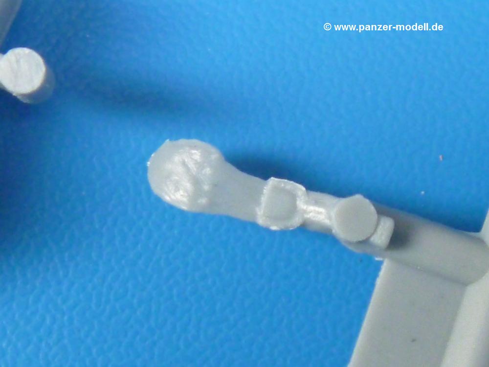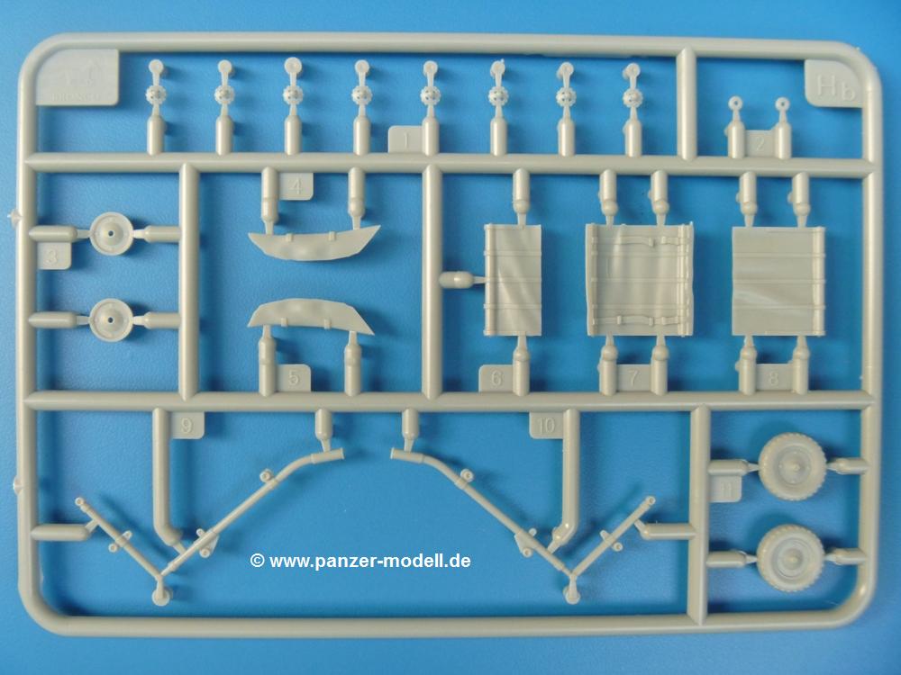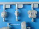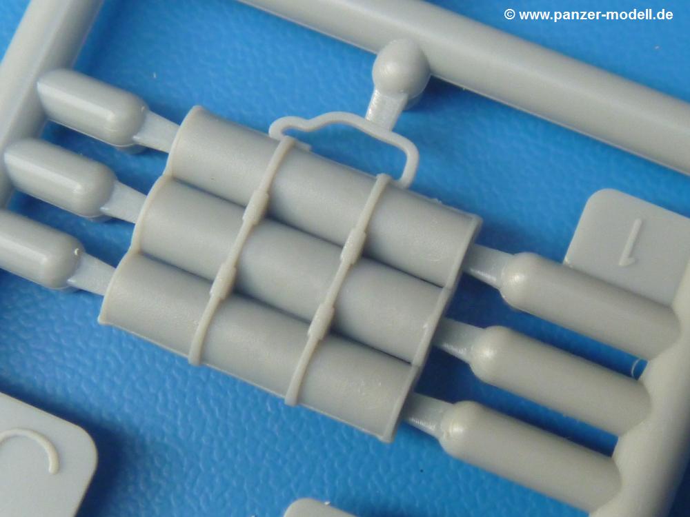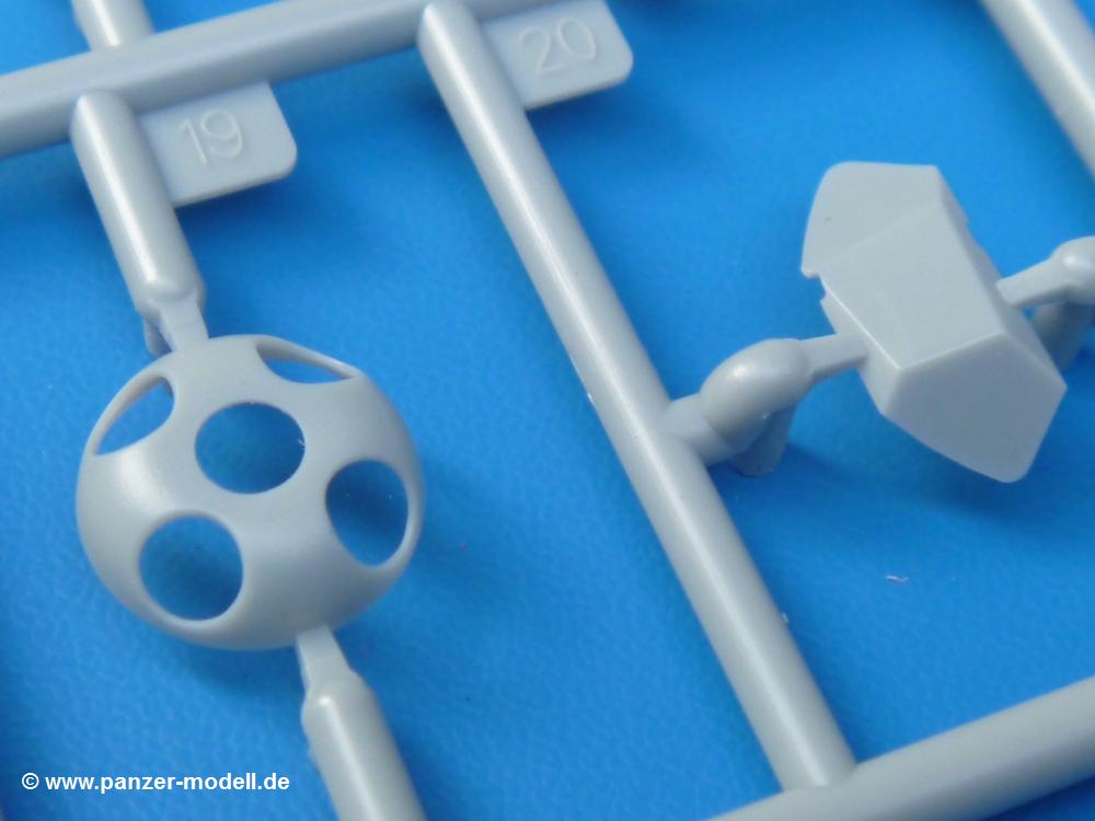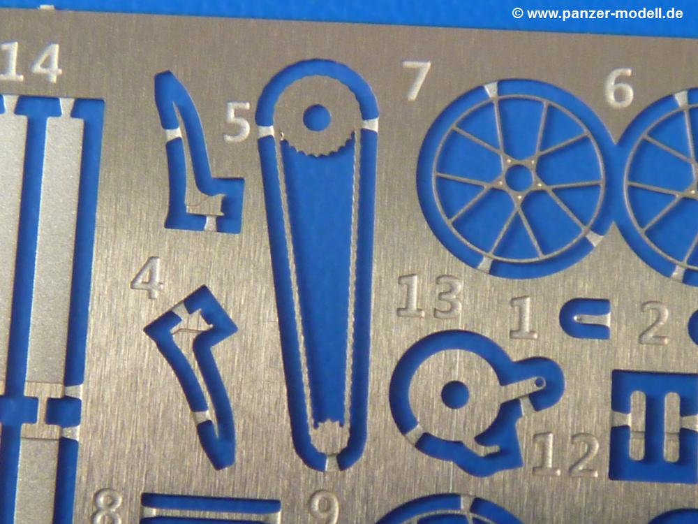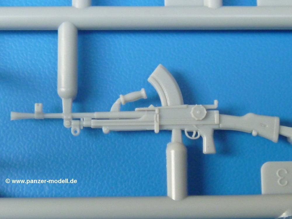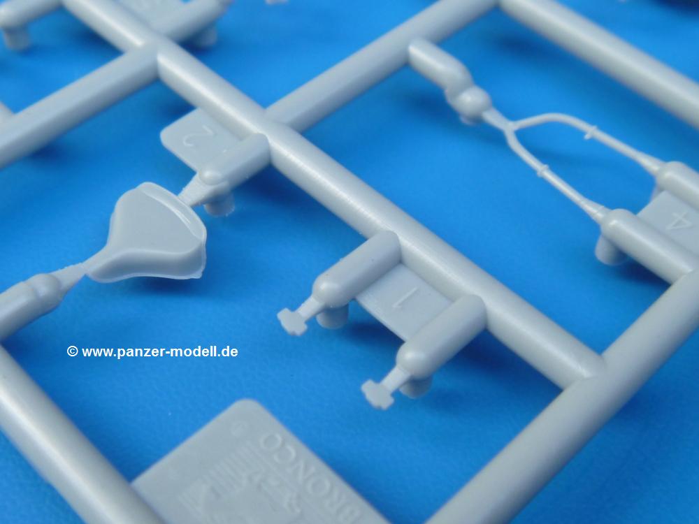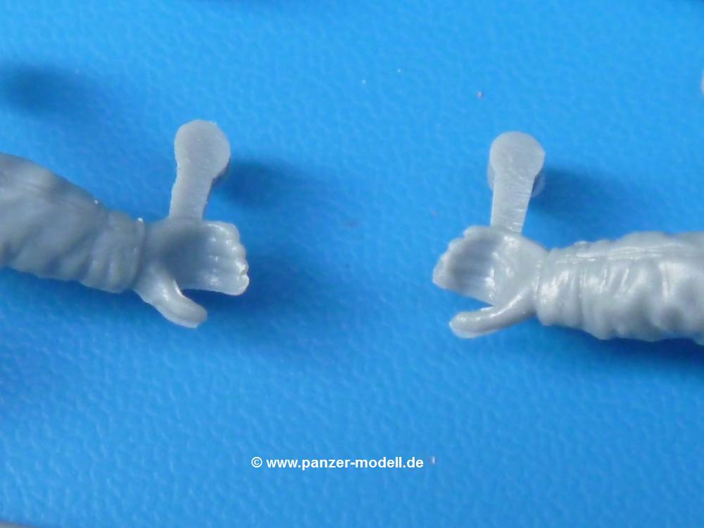 Die Teile sind wie üblich sauber gespritzt, ohne Versatz oder dicken Grat. Die Versäuberung kann sich fast nur auf die Angussstellen beschränken. Die vielen, sehr kleinen Teile sind Highlight und Herausforderung in einem. Die Gesichter der Soldaten sind gut gestaltet. Die Details kommen einem etwas "weich" vor, sind aber durchaus akzeptabel und für Spritzguss toll geworden.Soldat Handkarre schiebendHier handelt es sich um einen aufrecht gehenden Soldaten, ausgerüstet mit 2 Munitionstaschen, Rucksack, Schanzwerkzeugtasche mit Stiel und Feldflasche. Sein Barret ist bereits am Kopf angegossen.Die einfache Handkarre besteht aus 21 Teilen. Sie ist zwar faltbar, aber im Bausatz nur ausgeklappt darstellbar, damit der Soldat sie auch schieben kann. Die Stoffbespannung ist sehr schön dargestellt. Die Räder lassen sich drehbar montieren, wobei mir hier der Sinn nicht ganz verständlich ist. Die Beladung kann man mit dem vorhandenen Material individuell gestalten. Die Anleitung macht keine Vorgaben dazu, aber geht man nach dem Kartonbild, lädt man z.B. die PIAT Munitionsbehälter, die PIAT selbst, Helm (vom separaten Spritzling D) und den Karabiner des Soldaten auf.Die PIAT (Projector, Infantry, Anti-Tank) ist ein Kleinod. Man hat die Möglichkeit, diese Waffe mit eingeklappter Visiereinrichtung ohne Granate zu bauen oder eben einsatzbereit. Die Aufnahme für Granate besteht aus Ätzteilen. Es ist kein Trageriemen vorhanden - selbst herstellen. Zum Transport auf dem Karren wird man wohl eher die eingeklatte Visiereinrichtung ohne Granate nehmen.Soldat, Welbike (Minimotorrad) aus dem Abwurfbehälter hebendDas winzige Motorrad allein besteht aus 48 (!) Teilen und wird zusammengeklappt gebaut. Hier kommen Teile im Zehntelmillimeterbereich zum Einsatz. Viele Kleinteile sind nur als PE-Teile vorhanden (Bremshebel, Kette, Felgen etc). Die Bauanleitung gibt sogar an, wie dieser Winzling zu verkabeln ist, bzw. Verlauf des Gas- und Bremszuges. Allerdings muss man die Kabel und Züge selbst herstellen. Je nach Version muss man noch 2 bis 7 Decals an dem Winzling anbringen.Für den Abwurfbehälter des Welbikes liegen alle Teile bei, um ihn geschlossen, offen mit Welbike oder offen leer zu bauen. Für den Satz ist die offene Version gefragt.Der Soldat ist knieend dargestellt, wie er das Welbike aus dem Behälter hebt, bzw. auf dem linken Knie abstützt. Wegen dieser Haltung gibt es für den rechten Schuh die Sohle extra. Seine Ausrüstung besteht aus Helm mit Tarnnetz, 2 Munitionstaschen, Rucksack, Schanzwerkzeugtasche mit Stiel und Feldflasche.Soldat, auf Welbike (Minimotorrad) aufgesessenFür diese Welbike gilt das gleiche wie bereits oben angegeben, nur das man es fahrbereit baut. Den dazugehörigen Abwurfbehälter kann man auch weglassen oder anderweitig verwenden. Da es der gleiche Typ wie vorher ist, kann er geschlossen oder offen leer gebaut werden.Wie der Radfahrer im Set A hat auch dieser Fahrer 3 Beine, damit man ihn entweder fahrend mit beiden Füßen auf den Fussrasten oder anhaltend mit dem linken Fuß abgesetzt gestalten kann. Auch er ist mit Helm mit Tarnnetz, 2 Munitionstaschen, Rucksack, Schanzwerkzeugtasche mit Stiel und Feldflasche ausgerüstet. Die Anleitung sieht keine Anbringung einer Waffe vor, das Kartonbild zeigt ihn mit geschultertem Karabiner, aber ggfs. kann man ihm auch die MP umhängen.Die zusätzlich beiliegenden Rucksäcke sind sehr schön und hinten hohl. Für einen ist ein Tragegestell mit Tragschlaufen dabei. Am Spritzling der Rucksäcke sind auch nach Magazintaschen dabei. Alle diese Teile sind nicht besonders in der Anleitung erwähnt. Man kann sie also nach Belieben verwenden.Aus dem Minispritzling der 4 Fallschirmjägerhelme mit Tarnnetz und -material braucht man iegntlich nur den einen für den gehenden Soldaten. Die anderen 3 sind zur freien Verfügung, da die anderen Soldaten ihre Helme bereits am eigenen Spritzling haben.Ein Decalbogen hat Rangabzeichen vom Private bis zum Sergeant plus Fallschirmjägerschwingen anzubieten, aber die Anleitung schweigt sich über die Anbringung aus. Der zweite Bogen enthält die Decals für ein Welbike, Abwurfbehälter und PIAT Munitionsbehälter. Laut Anleitung soll der gleiche Bogen 2-mal vorhanden sein. Im Besprechungsmuster lag nur einer bei.Die farbige Bauanleitung auf dem Kartonrücken zeigt die gebauten Figuren mit den Nummern, wohin die Teile gehören. Hier sind die Bemalungshinweise mittels Farbnamen angegeben. Für die Welbikes, Abwurfbehälter, Handkarren, PIAT und die Waffen liegt eine kleine 12-seitige Anleitung im A5-Format im Karton. Die Anleitung enthält auch die komplette Spritzlingaufteilung und die Farbangaben bei Verwendung von Mr. Hobby, Hobby Color, Humbrol und Tamiya Farben in einer Tabelle. Wer einen Blick in die Anleitung werfen möchte, kann Sie sich hier unter "Instruction Sheets" anschauen und/oder herunterladen.Wie schon Set A ein schöner Figurensatz mit viel Zubehör - prima in Dioramen zu verwenden. In Deutschland muss man ca. 27-28 EUR auf den Ladentisch legen. |