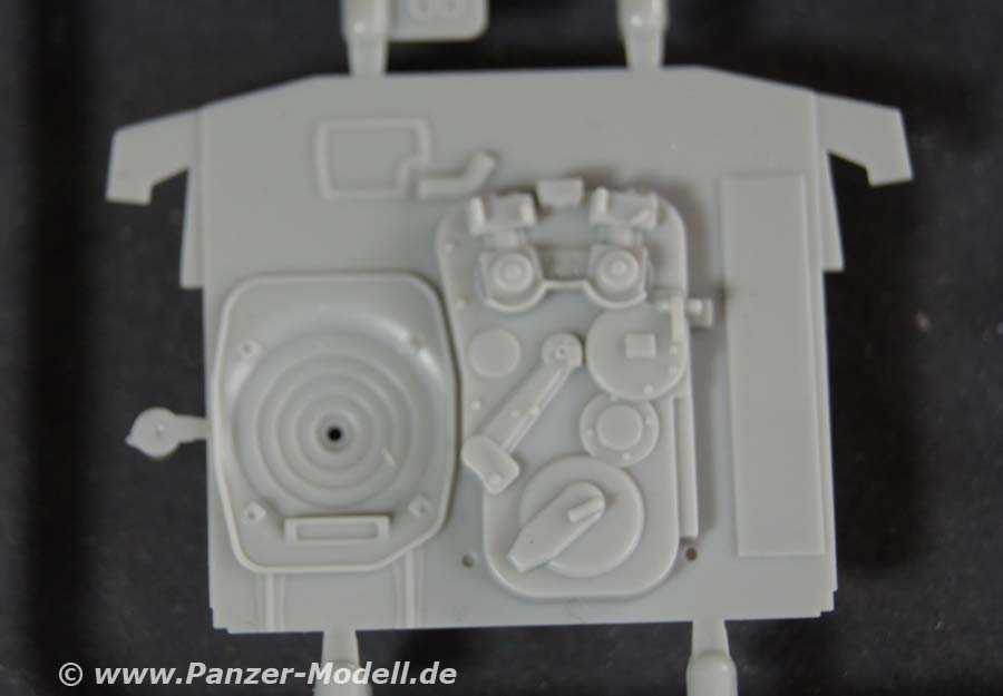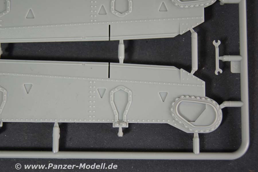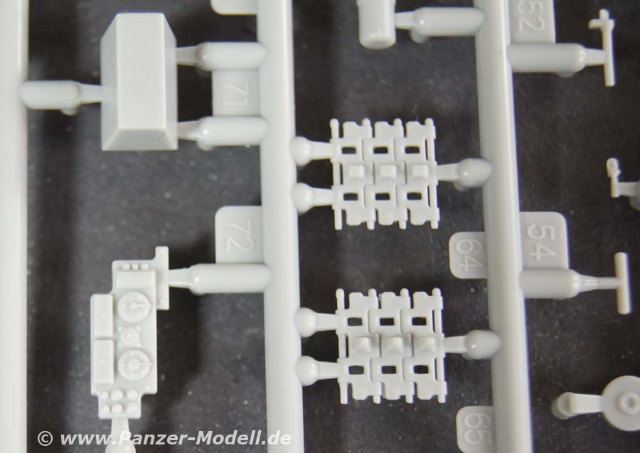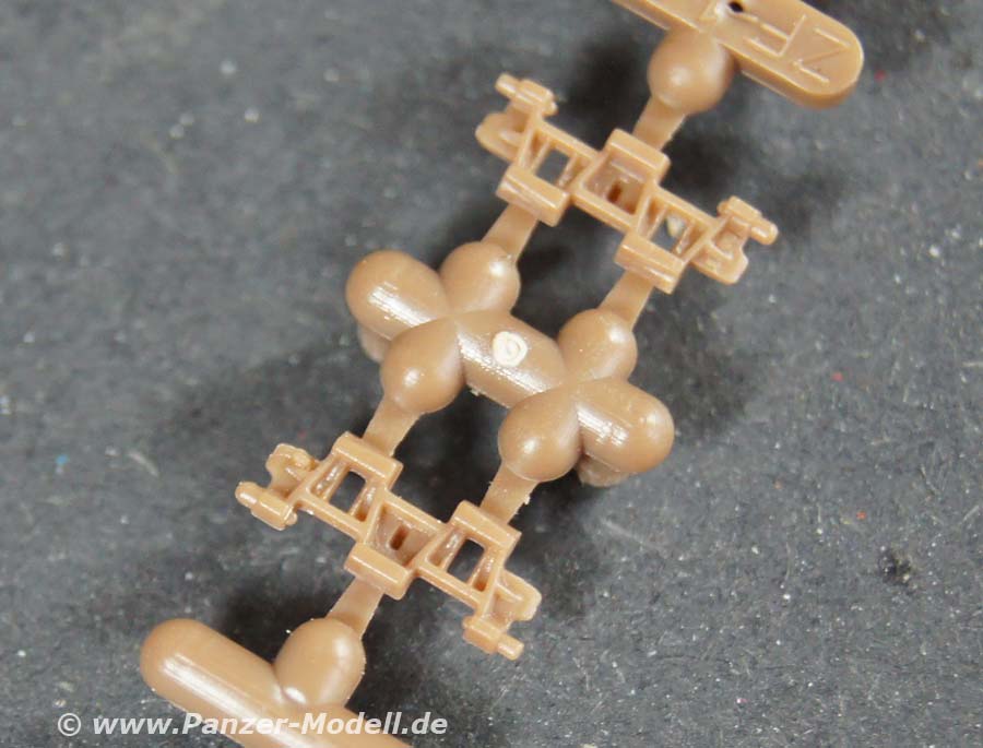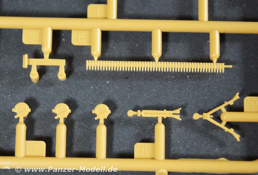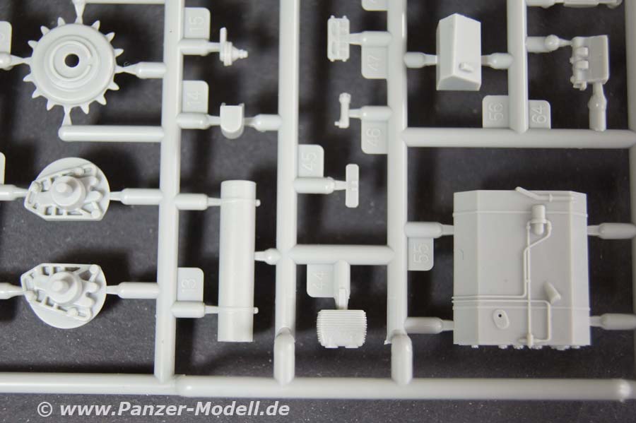 Kommen wir nun zum Kit, im Bausatz sind in Hellgrauen Plastik insgesamt 9 Spritzlinge, 2 einzelne Plastikteile, einzeln abgepackte Kettenglieder, ein umfangreichen Ätzteilesatz, ein kleiner Decalsatz und Klarsichteile, ein kleiner Strick aus Stoff für die Optiken. Der Bausatz baut auf die vorhergegangen beiden Bausätze des 35 (t) aus dem hause Bronco aus, neu sind hierbei die Abschlepp/Anhängevorrichtung, der Wetterschutz (aufgerollt oder alternativ ausgerollt bausbar) und die typische Kanister an den Seiten. Der erste Eindruck haut einen aus den Latschen, sauber gegossen, richtig feine Details, z.B. die wiedergabe der an dem 35 (t) markanten Nieten, eine enorme Teilevielfalt, gut versteckte Angußlöcher, aber leider hat das auch seine Schattenseiten, der Bausatz hat viele filigrane Teile die zudem noch sehr winzig sind, die Wanne kommt z.B. in mehreren Teilen daher, wer hier nicht sorgsam Arbeitet bekommt das später leider deutlich zu Spüren. Sinkstellen oder gar Fischhaut konnte ich so gut wie gar nicht sehen und wenn, dann an Stellen die man nach dem Zusammenbau nicht mehr zu sehen bekommt. Die Anleitung ist 19 Seiten stark und gliedert sich wie folgt, auf der 1. Seite ist eine kurze Geschichtliche Abhandlung über den Panzer zu finden, auf Seite 2 und 3 finden sich Farbangaben und eine übersicht über die Spritzlinge, bis Seite 16 werden die 32 Bausatzstufen beschrieben und auf den letzten Seiten befinden sich, sehr löblich in Farbe, Bemalungshilfen. Als Decals liegen dem Bausatz lediglich ein Balkenkreuz, die Tonagebegrenzung für die Anhängelast und 2 nicht näher definierte Einheitssymbole bei, leider schweigt sich auch die Bemalungsanleitung über Ort und Einsatz des Mörserzugmittels aus, es sind lediglich 2 Bemalungsvorschläge in Panzergrau mit und ohne aufgebauten Verdeck. Als kleiner Gimnick liegt noch ein Poster den Deckelbildes dabei. Für einen Preis von ca. 43 Euro bekommt man viel Bastelspaß der aber auch seine leider seine Mängel hat, so muss man sich Fragen warum einige Teile nicht angegossen wurden, sondern man sich teilweise in einer wahren Kleinteilorgie verliert.Für einen Preis von ca. 43 Euro bekommt man viel Bastelspaß der aber auch seine kleineren Detallierungstücken hat.