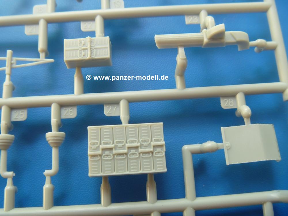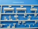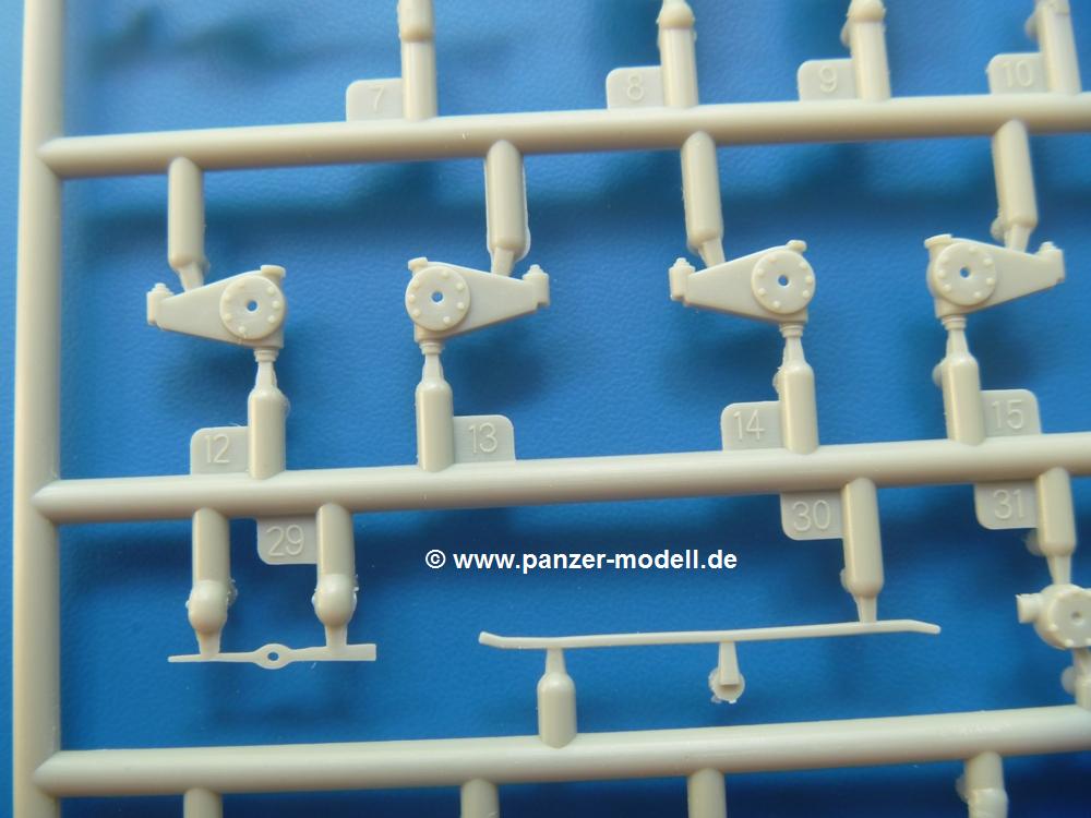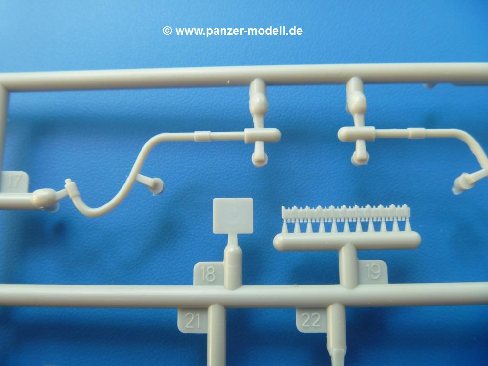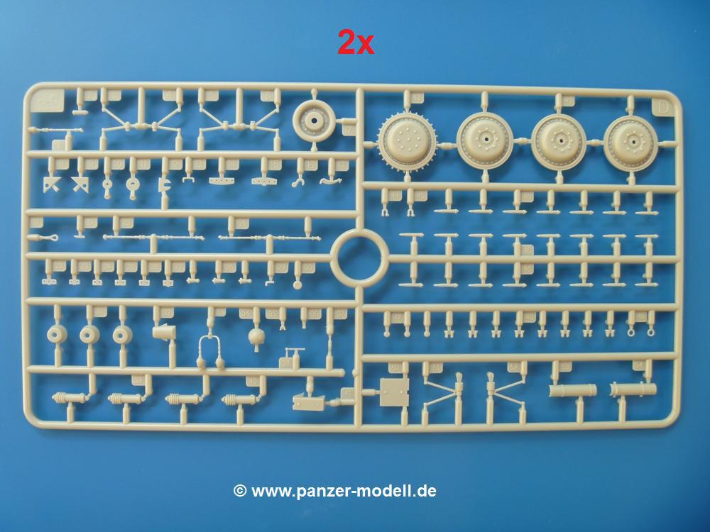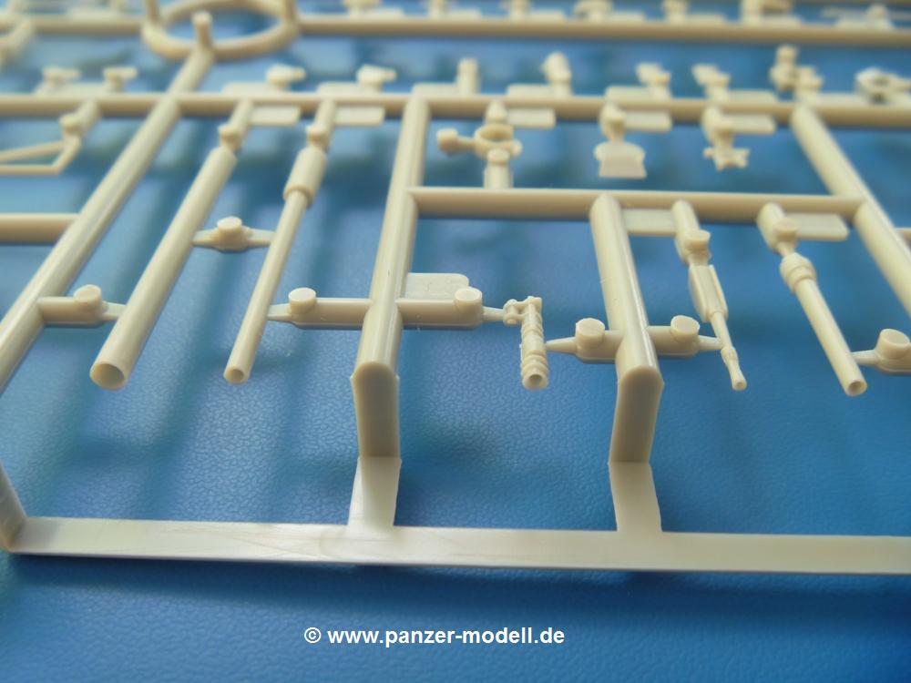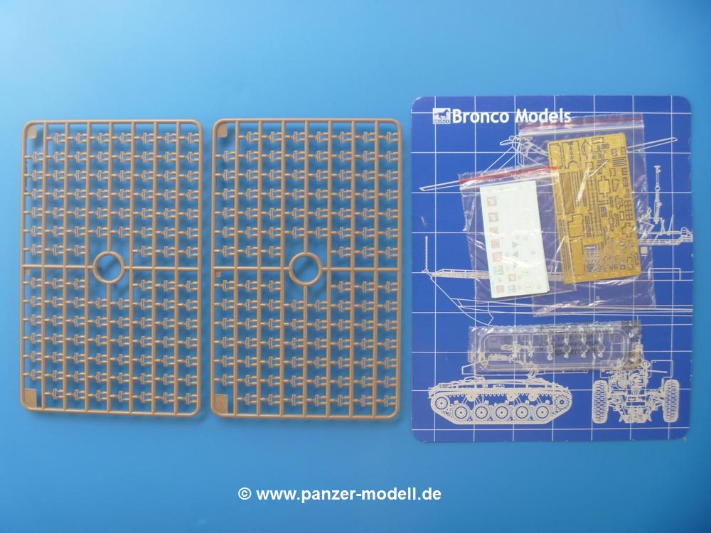 Das Original: Der A17 Tetrarch war ein britischer, leichter Panzer mit einer 2-pfünder Kanone und einem 7,92 mm Besa-MG. Der 12-Zylinder Benzinmotor mit 165 PS (123 kW) verlieh seinen 7,6 Tonnen Gefechtsgewicht eine Maximalgeschwindigkeit von 65 km/h. Von den 177 hergestellten Tetrarch wurden 20 an die Sovjet Union geliefert und einige nahmen an der Invasion von Französisch-Madagaskar teil. Den verbliebenen Teil erhielten britische Luftlandeeinheiten, die ca. 20 Stück bei der Landung in der Normandie einsetzten. 1945 wurde er außer Dienst gestellt, verblieb aber bis zu seiner Verschrottung 1950 bei Reserveeinheiten. Von verbliebenen Exemplaren ist eines im britischen Panzermuseum Bovington, ein anderes in russischen Kubinka bekannt. Der Bausatz: Bronco bleibt bei aussergewöhnlichen Panzern. Unter den Fans der britischen Fahrzeuge ist der Tetrarch sicherlich gut eingeschlagen. Das Modell dieses kleinen Panzers hat einiges zu bieten. Auf den Motor hat man verzichtet, aber sonst scheint die Fahrer-, Kampfraum- und Turminnenausstattung komplett vorhanden zu sein.Im Karton finden wir 5 hellgraue Spritzlinge, Unterwanne, Turm, 1 Spritzling mit den Klarsichtteilen, eine Ätzteilplatine, einen Abziehbilderbogen (Decals) und eine 20-seitige Bauanleitung im A4 Format.Die Spritzlinge sind wie folgt aufgeteilt: