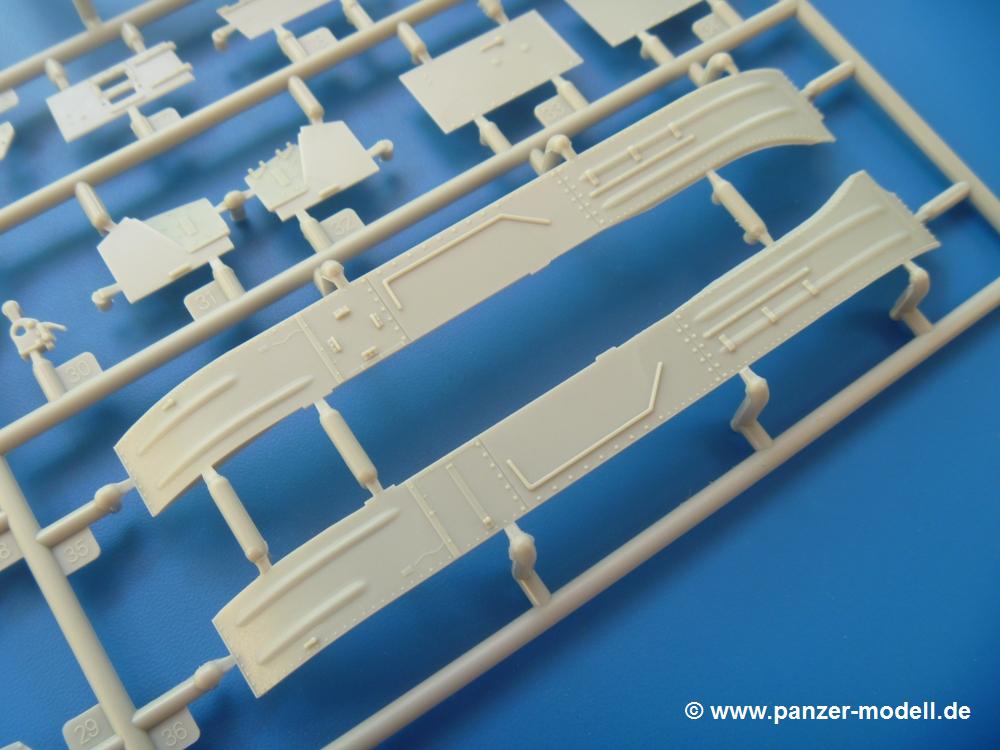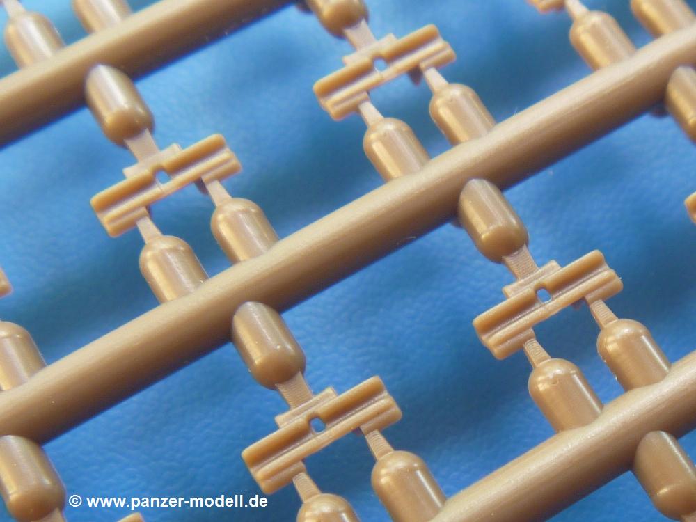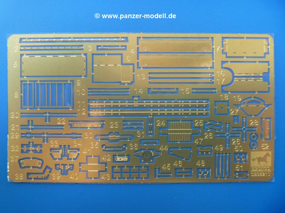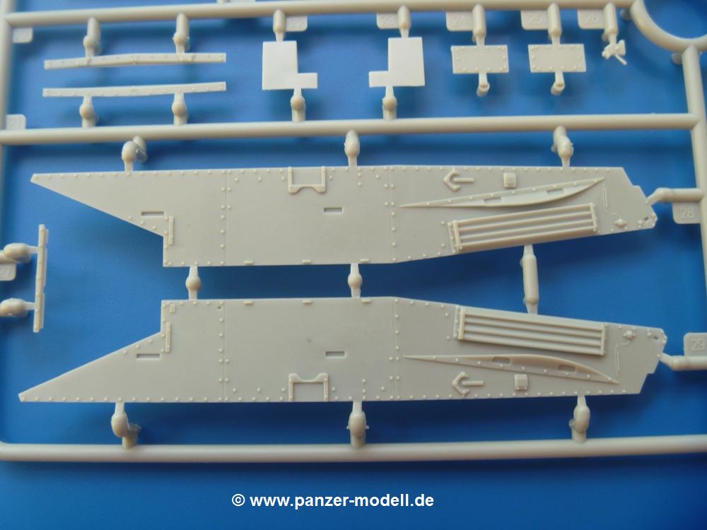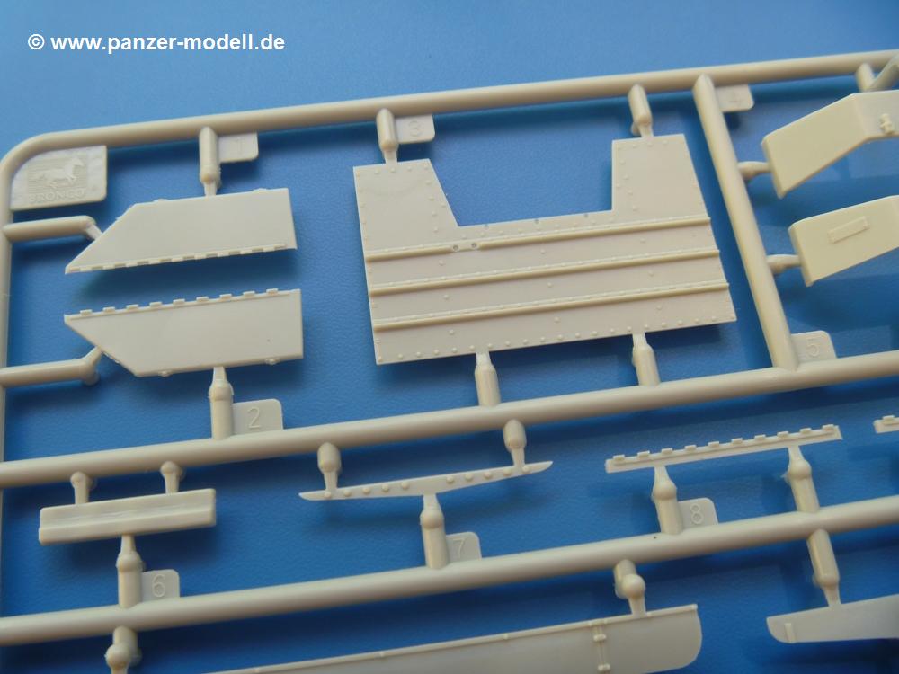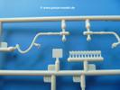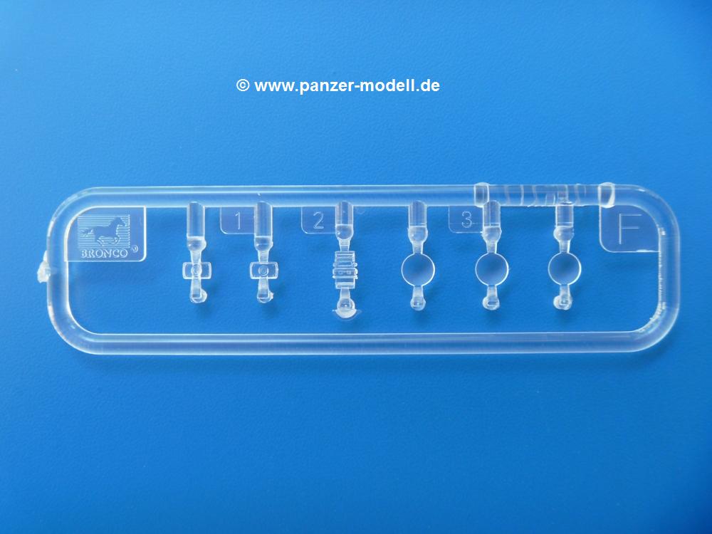 Alle Teile sind, wie bei Bronco üblich, sauber gespritzt, ohne Sinkstellen, Versatz, Fischhäute oder Grat. Einige Auswerferspuren (erhaben, vertieft) sind zu finden, die sich zumeist an verdeckten Stellen befinden.Arbeiten wir uns mal bei diesem Bausatz von innen nach außen durch. Schon in der einteiligen Wanne finden wir im Fahrerbereich aufgeprägte Leitungen und Kästen. Dazu baut man Lenkradhalterung, Lenkgestänge und Lenkrad aus 6 Teilen zusammen. Im Fußraum finden wir Kupplungs-, Brems- und Gaspedal. Die beiden ersteren bestehen aus je 2 Teilen, der Sitz aus vier. Eine schöne Schaltkulisse und der Schalthebel mit Entriegelungsgriff kommen dazu. An der Frontplatte wird ein zweigeteiltes Armaturenbrett mit Instrumenten, der Ziffern und Zeiger erkennbar sind, angebracht. Der Fahrererker ist so aufgebaut, dass man die feinen Innendetails gut erkennen kann, wenn man die mehrteilige Luke offen anbaut.Der Kampfraum besteht aus Bodenplatte, dem Brandschott und einer halbhohen Wand zum Fahrer hin. Etliche Details, teils mit PE-Teilen ergänzt, wie Stau- und Munitionskästen, Feuerlöscher und Rucksäcke hauchen zusätzliches Leben ein. Der Hit sind aber die Halterungen für die 2-pfünder Munition und die Munition selbst, die Schuß für Schuß in den Halterungen ihren Platz finden will.Auch im Turminneren ist viel los. Über 40 Teile müssen verbaut werden. Dazu zählen z.B. das Funkgerät Mr. 19 mit geätztem Schutzgitter, mehrteiligem Kopfhörer und Mikrofon. Verschluß der Kanone, Rohrwiege, Abweiser, Rohrbremsen, Zielfernrohr, MG inkl. Munitionsgurt, Winkelspiegel aus Klarsichtmaterial, Sitz für den Kommandanten - alles da.Auch außen geht es mit der Detailflut weiter. Das Fahrgestell wird auch die Geduldigen fordern. Zwar sind es pro Seite nur 4 Räder, aber dafür in Einzelradaufhängung, die pro Rad aus 7 Teilen (9 beim Antriebsrad wegen der Antriebswelle) besteht. Die Räder selbst mit ihren vielen Nieten und Verschraubungen sehen sehr gut aus. Die sehr feine Kette wird aus 98 Einzelgliedern pro Seite zusammengesetzt.Im Heckbereich hat man die Wahl, ob man den Außentank mit PE-Haltebändern anbringen möchte oder nicht. An der Heckplatte laufen die beiden Auspufftöpfe hoch. Hier kann man zwischen nach hinten gekrümmten oder aufrechten, kurzen Endrohren wählen. Und man muss sich entscheiden, ob man je nach Endversion die Anhängevorrichtung anbaut.Die Kettenabdeckungen mit Verstärkungsrippen bestehen aus je einem Stück. Hier finden Staukästen mit separaten Klappen und sehr schönen Scharnieren ihren Platz. Die Klappen können geöffnet dargestellt und ggfs. mit Aftermarket Gepäck/-Werkzeug etc befüllt werden. Für die innen hohlen Scheinwerfer gibt es Klarsichtgläser. Auch die Aussenspiegel bestehen aus Klarsichtmaterial. Kleines Gimmick - die Leitungen für die Begrenzungsleuchten sind auf den Kettenabdeckungen aufgeprägt.Am Turm finden sich jede Menge Details in Form von Antennenhalterungen, Nebelwurfbecher links und rechts und Suchscheinwerfer. An der Blende darf das Besa-MG nicht fehlen und bei der Kanone kann man zwischen 2 Pfünder und 3 Inch Haubitze wählen. Wie allerdings die 3 Inch Haubitze mit der 2 Pfünder Munition im Turm zusammenpasst, entzieht sich meiner Kenntnis. Im Turmdach findet der einzige Klarsichtwinkelspiegel seinen Platz. Die große Turmluke kann geöffnet oder geschlossen dargestellt werden.Der Decalbogen vrsorgt uns mit Material für 3 verschiedene Fahrzeuge:
