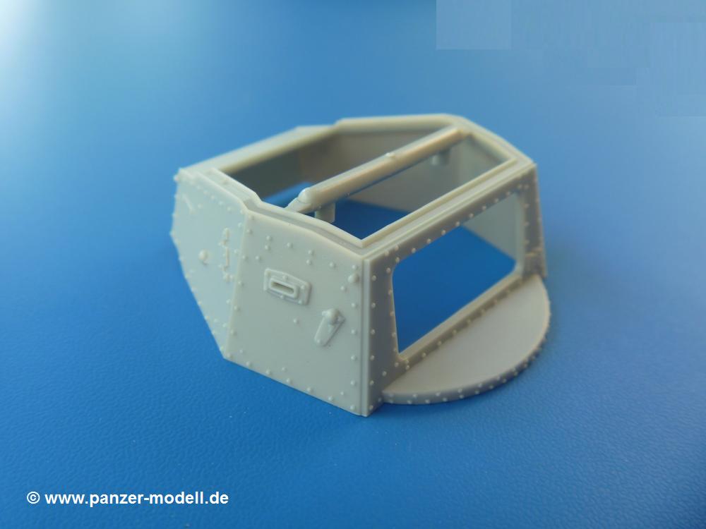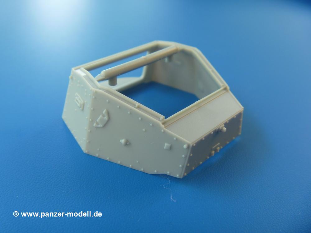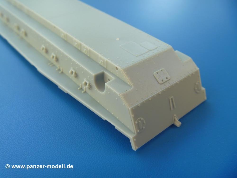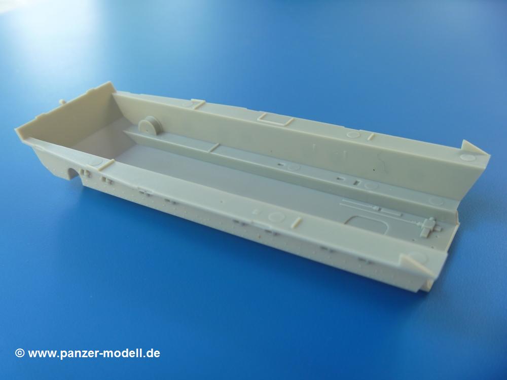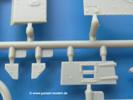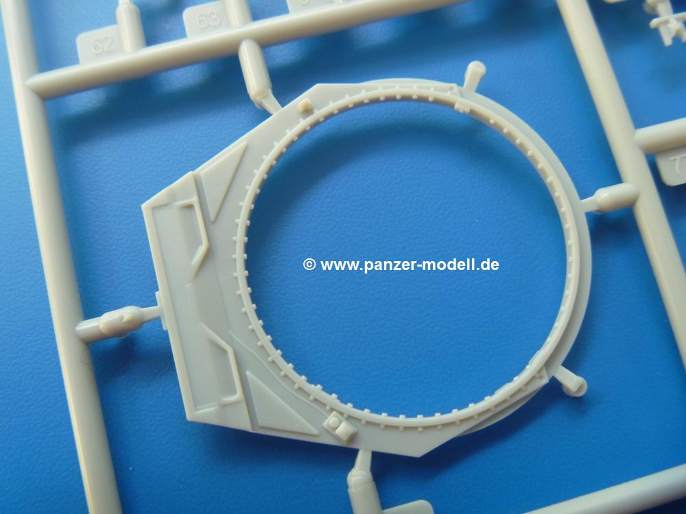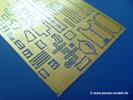 Alle Teile sind, wie bei Bronco üblich, sauber gespritzt, ohne Sinkstellen, Versatz, Fischhäute oder Grat. Einige Auswerferspuren (erhaben, vertieft) sind zu finden, die sich zumeist an verdeckten Stellen befinden.Arbeiten wir uns mal bei diesem Bausatz von innen nach außen durch. Schon in der einteiligen Wanne finden wir im Fahrerbereich aufgeprägte Leitungen und Kästen. Dazu baut man Lenkradhalterung, Lenkgestänge und Lenkrad aus 6 Teilen zusammen. Im Fußraum finden wir Kupplungs-, Brems- und Gaspedal. Die beiden ersteren bestehen aus je 2 Teilen, der Sitz aus vier. Eine schöne Schaltkulisse und der Schalthebel mit Entriegelungsgriff kommen dazu. An der Frontplatte wird ein zweigeteiltes Armaturenbrett mit Instrumenten, der Ziffern und Zeiger erkennbar sind, angebracht. Der Fahrererker ist so aufgebaut, dass man die feinen Innendetails gut erkennen kann, wenn man die mehrteilige Luke offen anbaut.Der Kampfraum besteht aus Bodenplatte, dem Brandschott und einer halbhohen Wand zum Fahrer hin. Etliche Details, teils mit PE-Teilen ergänzt, wie Stau- und Munitionskästen, Feuerlöscher und Rucksäcke hauchen zusätzliches Leben ein. Der Hit sind aber die Halterungen für die 2-pfünder Munition und die Munition selbst, die Schuß für Schuß in den Halterungen ihren Platz finden will.Auch im Turminneren ist viel los. Über 40 Teile müssen verbaut werden. Dazu zählen z.B. das Funkgerät Mr. 19 mit geätztem Schutzgitter, mehrteiligem Kopfhörer und Mikrofon. Verschluß der Kanone, Rohrwiege, Abweiser, Rohrbremsen, Zielfernrohr, MG inkl. Munitionsgurt, Winkelspiegel aus Klarsichtmaterial, Sitz für den Kommandanten - alles da.Auch außen geht es mit der Detailflut weiter. Das Fahrgestell wird auch die Geduldigen fordern. Zwar sind es pro Seite nur 4 Räder, aber dafür in Einzelradaufhängung, die pro Rad aus 7 Teilen (9 beim Antriebsrad wegen der Antriebswelle) besteht. Die Räder selbst mit ihren vielen Nieten und Verschraubungen sehen sehr gut aus. Die sehr feine Kette wird aus 98 Einzelgliedern pro Seite zusammengesetzt.Im Heckbereich hat man die Wahl, ob man den Außentank mit PE-Haltebändern anbringen möchte oder nicht. An der Heckplatte laufen die beiden Auspufftöpfe hoch. Hier kann man zwischen nach hinten gekrümmten oder aufrechten, kurzen Endrohren wählen. Und man muss sich entscheiden, ob man je nach Endversion die Anhängevorrichtung anbaut.Die Kettenabdeckungen mit Verstärkungsrippen bestehen aus je einem Stück. Hier finden Staukästen mit separaten Klappen und sehr schönen Scharnieren ihren Platz. Die Klappen können geöffnet dargestellt und ggfs. mit Aftermarket Gepäck/-Werkzeug etc befüllt werden. Für die innen hohlen Scheinwerfer gibt es Klarsichtgläser. Auch die Aussenspiegel bestehen aus Klarsichtmaterial. Kleines Gimmick - die Leitungen für die Begrenzungsleuchten sind auf den Kettenabdeckungen aufgeprägt.Am Turm finden sich jede Menge Details in Form von Antennenhalterungen, Nebelwurfbecher links und rechts und Suchscheinwerfer. An der Blende darf das Besa-MG nicht fehlen und bei der Kanone kann man zwischen 2 Pfünder und 3 Inch Haubitze wählen. Wie allerdings die 3 Inch Haubitze mit der 2 Pfünder Munition im Turm zusammenpasst, entzieht sich meiner Kenntnis. Im Turmdach findet der einzige Klarsichtwinkelspiegel seinen Platz. Die große Turmluke kann geöffnet oder geschlossen dargestellt werden.Der Decalbogen vrsorgt uns mit Material für 3 verschiedene Fahrzeuge:
