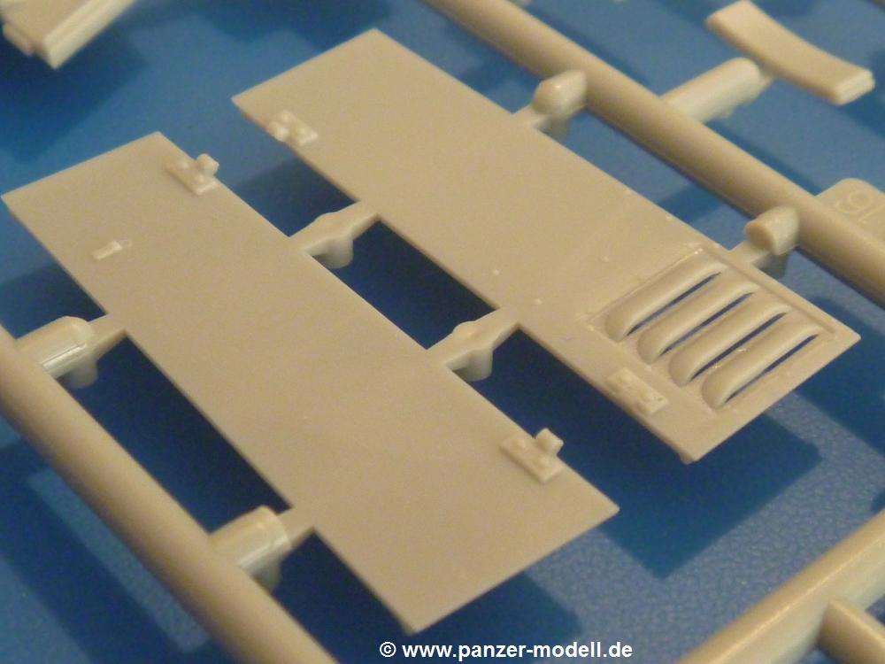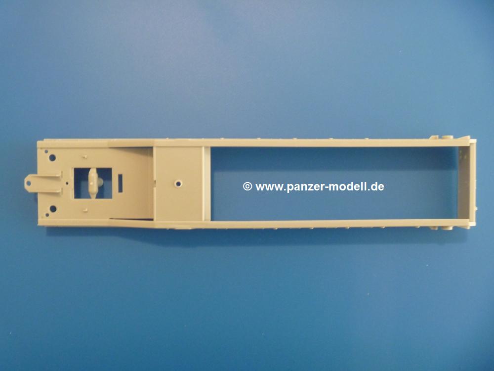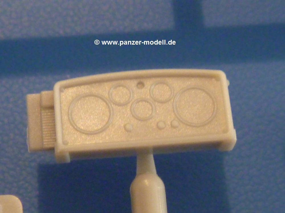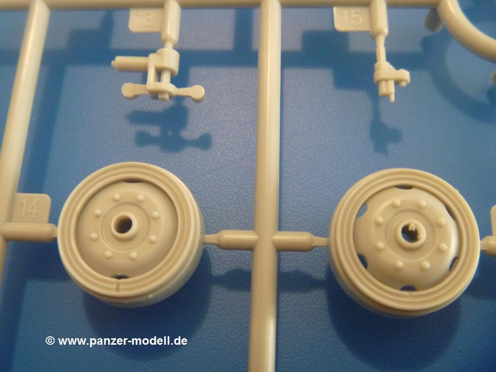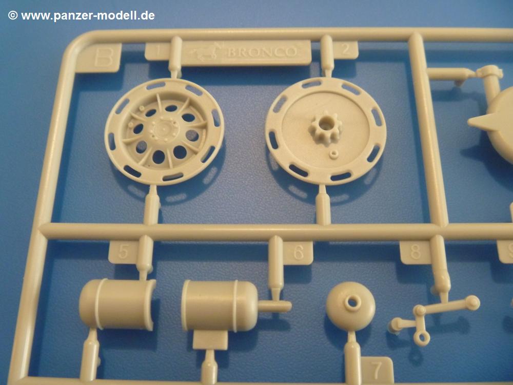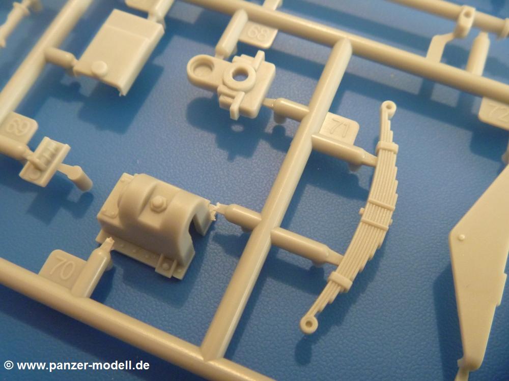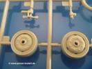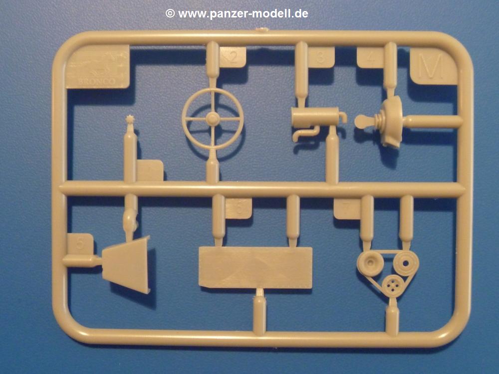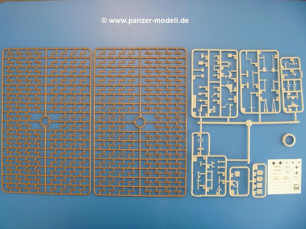 Gemäß meinen Informationen handelt es sich auch bei diesem Bausatz um ein ehemaligen Great Wall Hobby Modell. Alle Teile sind sauber gespritzt, ohne Sinkstellen, Versatz, Fischhäute oder Grat.Der Unterrahmen besteht aus einem großen Teil, in das die aus Hälften zusammengesetzten Drehstabkörper eingesetzt werden. Allein diese machen 7 Unterbaugruppen aus. Dazu kommen Schwingarme und die Achsen der hinteren Spannrollen mit der schönen Spindel des Kettenspanners. Die Vorderachse mit der schönen, querliegenden Blattfeder erlaubt eine eingeschlagene Stellung der Räder. Jedes Vorderrad besteht aus Felge, Einsatz, Nabe und 6 Reifenscheiben zur besseren Darstellung des Profils. Der Herstelleraufdruck auf den Reifenflanken fehlt auch hier. Es liegen 2 verschiedene Größen der Antriebszahnräder bei. Die Bauanleitung stellt einen vor die Wahl, welche Gräße man verwenden möchte. Bei den Laufrollen handelt es sich um die späten Scheibenräder mit je 5 Durchbrüchen. Die Schraubenköpfe machen mir einen etwas flachen Eindruck. Die Einzelgliederkette wird wohl etwas Arbeit machen. 112 Glieder pro Seite, immer wechselweise mit Zähnen und ohne, müssen zusammengefügt werden. Dafür bekommt man aber auch Kette mit schönen Details. Einige gut gestaltete Teile wie der Tank, die Luftdruckbehälter, Getriebe für Seilwinde und Seilführungen verschwinden im Rahmen und werden später kaum noch einzusehen sein. Dann ist es auch nicht schlimm, wenn man die Winde ganz weglässt, da sowieso der gepanzerte sWS im Original angeblich keine Seilwinde mehr hatte.Der originale sWS hat eine seitlich liegende Ölwanne und den Unterboden geschlossen. Bei ersten Bronco sWS hatte der Motor noch eine untenliegende Ölwanne. Jetzt ist der Unterboden zwar immer noch offen (mit Plastikkarte verschließen), aber der Spritzling M enthält die Korrekturteile für den Motor (flache Bodenplatte für den Motor, seitliche Ölwanne, andere Keilriemen etc). Wie angesprochen, der Motor mit Lichtmaschine, Luftfilter und Kühler ist ein kleiner Bausatz für sich und verspricht viel Spaß. Und wenn man sich schon die Abriet macht, Motorklappen offen lassen!Im Fahrerraum ist allerhand los - Pedale, Funkgerät, Schalt- und Bedienhebel, mehrteilige Sitze. Für die Armaturen gibt es Decals. Will man den Blick darauf nicht missen, sollte man alle Luken und Deckel offen anbauen. Da kommt es einem entgegen, dass sowohl die Fahrer-/Beifahrersichtklappen als auch die seitlichen Schiebeluken geschlossen oder offen angebaut werden können. Im hinteren Bereich werden noch Klappsitze angebracht. Da dieser sWS für den Nachteinsatz vorgesehen ist, bekommt der Fahrer eine IR-Optik und den entsprechenden Scheinwerfer dazu. Der gleiche Scheinwerfer wird zusätzlich an der Frontpanzerung angebracht. Hinter der Dachluke bohrt man ein Loch, damit dort die Halterung mit dem MG42 angebracht werden kann. Beim MG leiegn Verschlussdeckel, Zweibein und Munitonstrommel als separate Teile bei.Der hintere Aufbau besteht aus Seiten-, Heck- und Dachteil. Die Staufächer in den Seiten sind offen. Man hat die Wahl, ob man die Staufächer mit den Klappen verschliesst oder offen lässt, um ggfs. Werkzeug oder Gepäck (nicht im Bausatz enthalten) dort hineinzulegen. an den Klappen sind die Vorhängeschlösser bereits angegossen. Innen geht es etwas spartanisch vor. Weitere Staukästen, Elektrokasten, Innenverkleidung und Stützstreben sind alles, was wir dort finden. Mir stellt sich da die Frage, woher der grosse IR Scheinwerfer wohl seinen Strom bekommen wird (externer Generator?)?Natürlich ragt die Drehbühne des kleinen, achteckigen Turmes des IR-Scheinwerfers auch ins Innere hinein und sorgt für mehr Leben. An der Bühne sind Bedienelemente und Sitz angebracht, im Turminneren das Schwenkgetriebe und die Stellräder. In der Sichtluke des Turms sitzt eine IR-Optik ähnlich der des Fahrers. Auf dem Turm selbst sitzt ein U-förmiger Rahmen, der den Scheinwerfer aufnimmt. Bei diesem Rahmen kann man zwischen Einsatz- (aufgerichtet) und Fahrstellung (nach hinten abgeklappt) wählen. Der Scheinwerfer ist ein Bausatz für sich. 29 Plastik-, 20 PE-Teile und 2 Klarsitzscheiben wollen zusammengesetzt werden.Der Decalbogen enthält die Zifferblätter für die Armaturentafel (2 grosse, 3 kleine), Kennzeichen und Gewichtsklassen für 2 Wehrmachtsfahrzeuge (WH), was nicht so ganz zur Geschichte passt, dass die Fahrzeuge meist bei der 6. SS-Panzerdivision eingesetzt gewesen sein sollen. (Nun gut, solche Decals dürften in Deutschland sowieso nicht im Bausatz enthalten sein!) Dazu kann man sich jeweils ein WH Front-/Heckkennzeichen mittels "leeren" Nummernsschildern und separaten Ziffern selbst erstellen.Die teils farbige Bauanleitung mit Explosionszeichnungen erklärt den Zusammenbau in 30 Schritten. Auf dem Deckblatt erscheint in Englisch, Deutsch und Chinesisch ein kurzer Abriss der Geschichte dieses sWS. Farbangaben bei Verwendung von Mr. Hobby, Hobby Color, Humbrol und Tamiya Farben finden sich auf Seite 2. Die Lackierung ist für 1 Fahrzeug angegeben - Sandgelb mit grünen und braunen Tarnflächen.Welcher Geschichte des Originals man auch immer glauben möchte, Bastelspass hat man mit diesem Teil auf alle Fälle. Wegen der winzigen PE-Teile und dem komplexen Aufbau des Scheinwerfers denke ich, dass es besser ist, wenn man etwas megr Erfahrung im Modellbau mitbringt. Grad das Verkleben von PE- mit Klarsichtteilen wird für manche eine Herausforderung werden.Im deutschen Handel ist dieser sWS zwischen 52,00 und 55,00 EUR erhältlich.