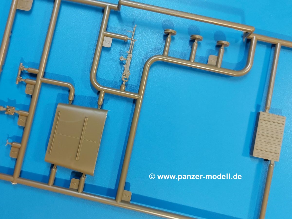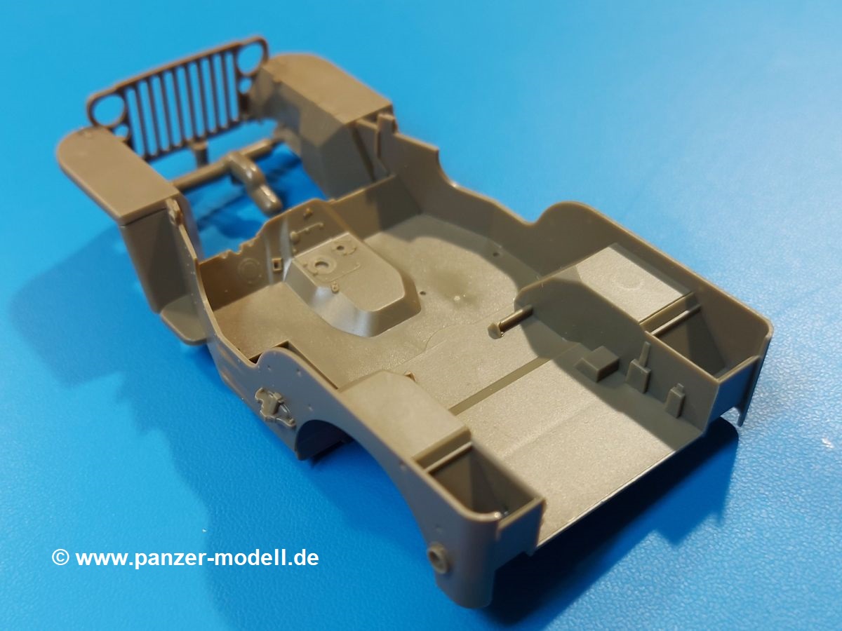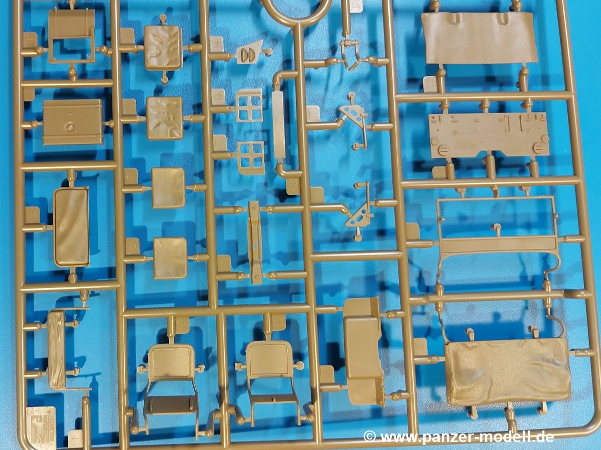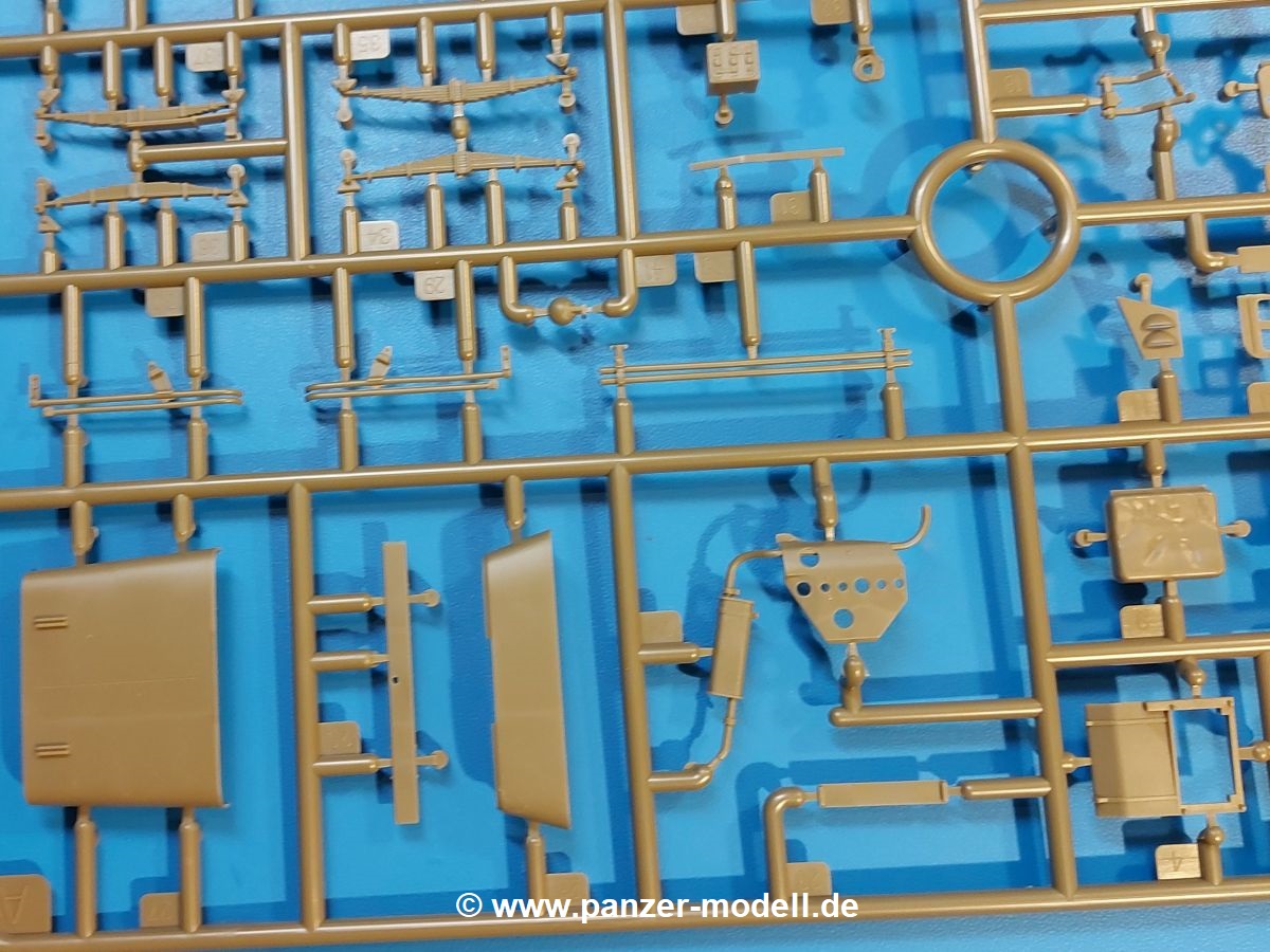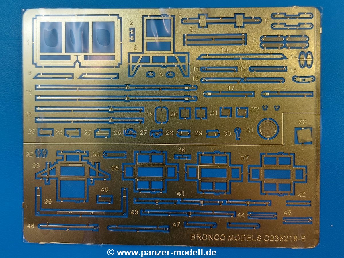 Das Original: Über "den Jeep" (formal: Truck, 1/4 ton, 4x4) braucht man eigentliche keine Worte mehr zu verlieren. Das in den 1940-ern meist bei Willys und Ford gebaute Allzweckfahrzeug war bei seinen Nutzern äußerst beliebt und fand Einsatz in den unterschiedlichsten Einheiten als Aufklärungsfahrzeug, Zugmaschine für leichte Anhänger und Geschütze usw. Allein im 2. Weltkrieg wurden fast 650.000 Jeeps gebaut und eingesetzt. Die U.S.A. lieferten ihn auch an alliierte Staaten wie Frankreich, Russland und Großbritannien. Auch heute existieren noch viele einsatzbereite Exemplare. Die Bausätze: Wer britische Jeeps bauen möchte, ist bei Bronco ganz gut aufgehoben. Der neueste Bausatz enthält gleich 2 davon einen der Aufklärer und einen der Fernmelder. So kommt es, dass einige Spritzlinge gleich doppelt vorhanden sind. Im großzügig dimensionierten Karton mit den Maßen 445 x 300 x 70 Millimeter befinden sich neben der 16-seitigen Bauanleitung, 2 PE-Platinen, Bindfaden und 2 Abziehbilderbogen (Decals) 16 olivgrüne Spritzlinge plus 2 Karosserien und 1 durchsichtiger Spritzling. Die 5 Spritzlinge der Figuren sind hellgrau, ebenso der Spritzling für den Korb und der mit den Gurttaschen. Da sich auch Teile anderer Versionen an den Spritzlingen befinden, bleibt einiges übrig. Diese Teile sind in der Übersicht ausgegraut. Alle Teile sind sauber gespritzt, ohne Sinkstellen, Versatz oder Fischhäute. Jedoch ist hier und da feiner Grat zu finden, der aber leicht zu entfernen ist und der Qualität insgesamt keinen Abbruch tut. Einige Auswerfermarken sind vorhanden, auffällig an der Unterseite der Karosserien und der Innenseite der Motorhauben. Bronco legt Wert auf kleinste Details, deshalb gibt so einige feine, aber auch kleine Teile bis hin zu separat anzubringenden Schraubenköpfen. Es empfiehlt sich, die Bauanleitung sehr gründlich zu studieren, damit man die beiden Fahrzeuge nicht durcheinanderwirft. Na, schauen wir mal, was uns geboten wird. Da ist zum Beispiel ein ziemlich kompletter Motor mit Zündspule, Vergaser, Abgaskrümmer, Auspuffrohr, Luftfilter, Keilriemen- und -scheiben, Lüfterrad, Kupplungsgehäuse, Schaltgetriebe, ein Verteilergetriebe und Kardanwellen zu Vorder- und Hinterachse. Im Motorraum hat man noch Kühler mit Scheinwerfern, Batterie, Hupe usw. Die Achsen werden an Blattfederpaketen befestigt, die jeweils mit Stoßdämpfern versehen werden. Die Vorderräder können geradeaus oder mit Lenkeinschlag gebaut werden. Man muss sich nur für die entsprechenden Gestänge entscheiden. Die Plastikräder sind mit Hersteller und Reifenangaben versehen und können drehbar gebaut werden. Die offene Karosserie bietet genug Gelegenheiten mit Details zu glänzen und Bronco nutzt das schamlos aus. Pedalerie, Schalthebel, Kraftstofftank, Sitze, Lenkrad und ein sehr schönes Armaturenbrett, für dessen Instrumente und Hinweisschilder Decals beiliegen, die man besser vor dem Einbau anbringt. Man kann wählen, ob man das gefaltete Gestänge der Plane anbringt oder nicht. Alle Versionen bekommen ein sehr feines Funkgerät Nr. 22 mit PE-Schutzgitter. Da das Funkgerät sehr gut einzusehen ist, kann man sich bemalungstechnisch entsprechend austoben. Kommen wir zu den Unterschieden. Das mache ich besser in einer Aufzählung: