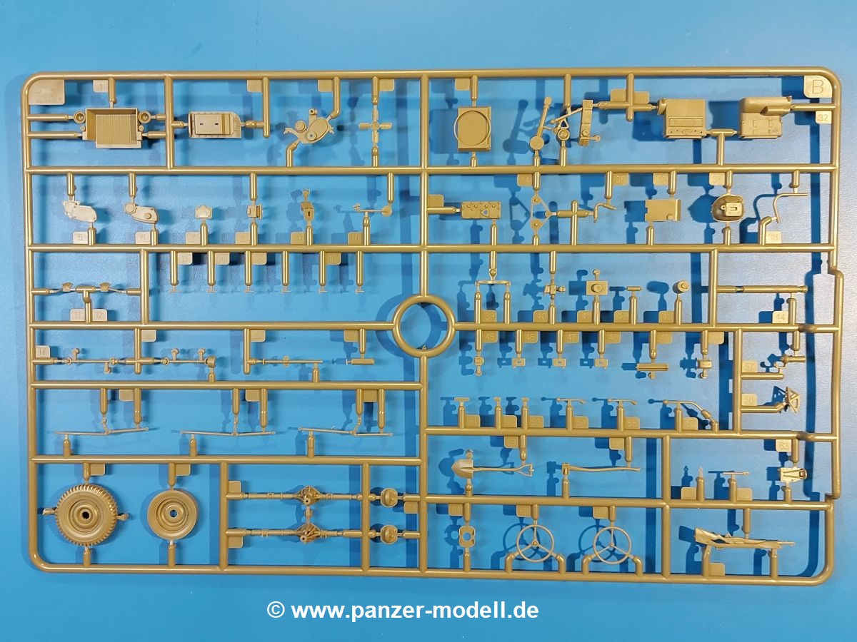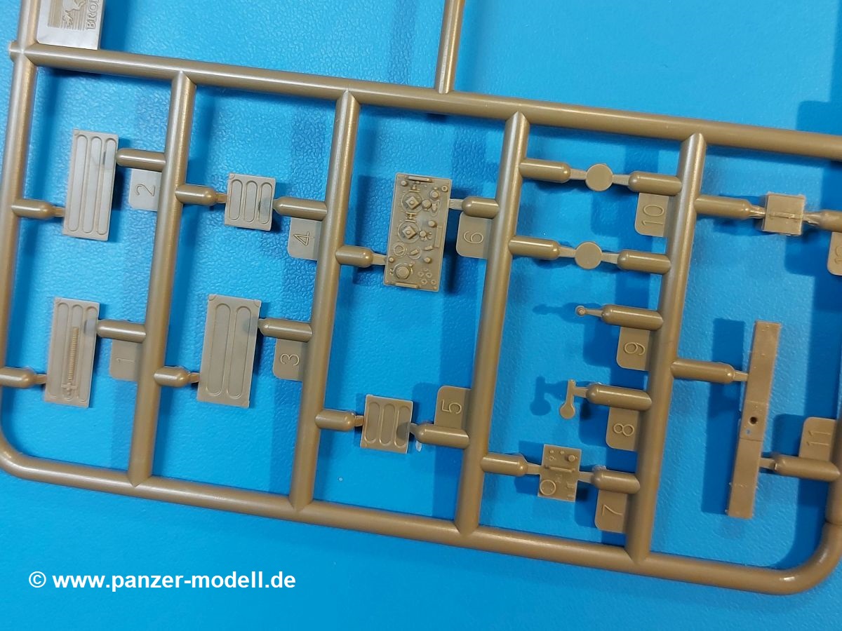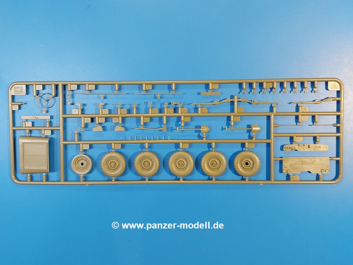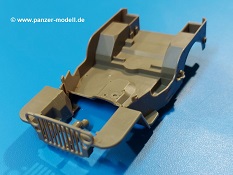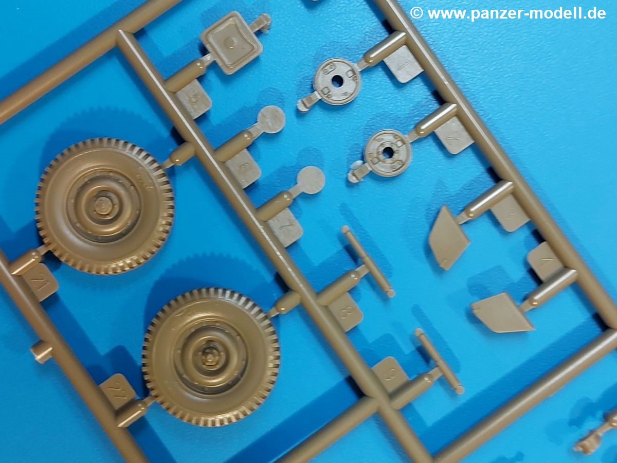 Das Original: Über "den Jeep" (formal: Truck, 1/4 ton, 4x4) braucht man eigentliche keine Worte mehr zu verlieren. Das in den 1940-ern meist bei Willys und Ford gebaute Allzweckfahrzeug war bei seinen Nutzern äußerst beliebt und fand Einsatz in den unterschiedlichsten Einheiten als Aufklärungsfahrzeug, Zugmaschine für leichte Anhänger und Geschütze usw. Allein im 2. Weltkrieg wurden fast 650.000 Jeeps gebaut und eingesetzt. Die U.S.A. lieferten ihn auch an alliierte Staaten wie Frankreich, Russland und Großbritannien. Auch heute existieren noch viele einsatzbereite Exemplare. Die Bausätze: Wer britische Jeeps bauen möchte, ist bei Bronco ganz gut aufgehoben. Der neueste Bausatz enthält gleich 2 davon einen der Aufklärer und einen der Fernmelder. So kommt es, dass einige Spritzlinge gleich doppelt vorhanden sind. Im großzügig dimensionierten Karton mit den Maßen 445 x 300 x 70 Millimeter befinden sich neben der 16-seitigen Bauanleitung, 2 PE-Platinen, Bindfaden und 2 Abziehbilderbogen (Decals) 16 olivgrüne Spritzlinge plus 2 Karosserien und 1 durchsichtiger Spritzling. Die 5 Spritzlinge der Figuren sind hellgrau, ebenso der Spritzling für den Korb und der mit den Gurttaschen. Da sich auch Teile anderer Versionen an den Spritzlingen befinden, bleibt einiges übrig. Diese Teile sind in der Übersicht ausgegraut. Alle Teile sind sauber gespritzt, ohne Sinkstellen, Versatz oder Fischhäute. Jedoch ist hier und da feiner Grat zu finden, der aber leicht zu entfernen ist und der Qualität insgesamt keinen Abbruch tut. Einige Auswerfermarken sind vorhanden, auffällig an der Unterseite der Karosserien und der Innenseite der Motorhauben. Bronco legt Wert auf kleinste Details, deshalb gibt so einige feine, aber auch kleine Teile bis hin zu separat anzubringenden Schraubenköpfen. Es empfiehlt sich, die Bauanleitung sehr gründlich zu studieren, damit man die beiden Fahrzeuge nicht durcheinanderwirft. Na, schauen wir mal, was uns geboten wird. Da ist zum Beispiel ein ziemlich kompletter Motor mit Zündspule, Vergaser, Abgaskrümmer, Auspuffrohr, Luftfilter, Keilriemen- und -scheiben, Lüfterrad, Kupplungsgehäuse, Schaltgetriebe, ein Verteilergetriebe und Kardanwellen zu Vorder- und Hinterachse. Im Motorraum hat man noch Kühler mit Scheinwerfern, Batterie, Hupe usw. Die Achsen werden an Blattfederpaketen befestigt, die jeweils mit Stoßdämpfern versehen werden. Die Vorderräder können geradeaus oder mit Lenkeinschlag gebaut werden. Man muss sich nur für die entsprechenden Gestänge entscheiden. Die Plastikräder sind mit Hersteller und Reifenangaben versehen und können drehbar gebaut werden. Die offene Karosserie bietet genug Gelegenheiten mit Details zu glänzen und Bronco nutzt das schamlos aus. Pedalerie, Schalthebel, Kraftstofftank, Sitze, Lenkrad und ein sehr schönes Armaturenbrett, für dessen Instrumente und Hinweisschilder Decals beiliegen, die man besser vor dem Einbau anbringt. Man kann wählen, ob man das gefaltete Gestänge der Plane anbringt oder nicht. Alle Versionen bekommen ein sehr feines Funkgerät Nr. 22 mit PE-Schutzgitter. Da das Funkgerät sehr gut einzusehen ist, kann man sich bemalungstechnisch entsprechend austoben. Kommen wir zu den Unterschieden. Das mache ich besser in einer Aufzählung: