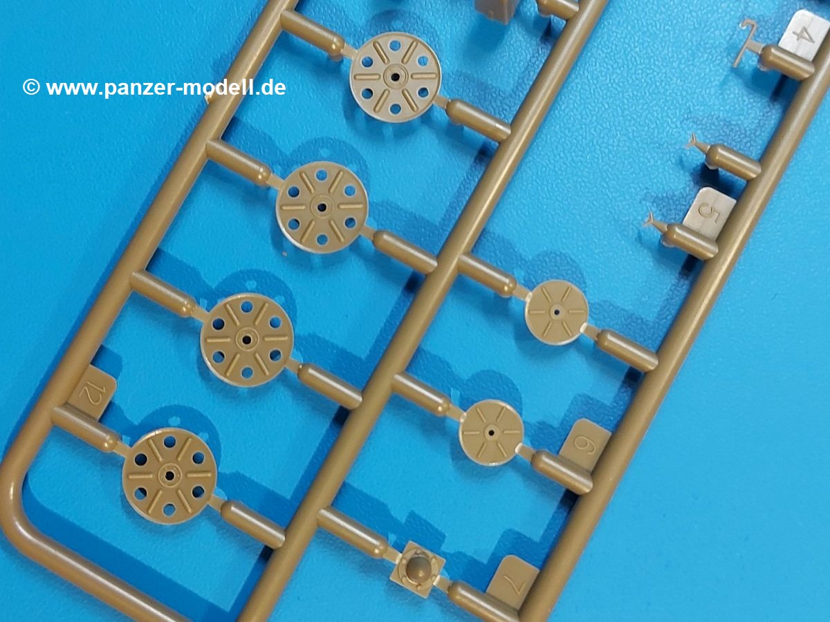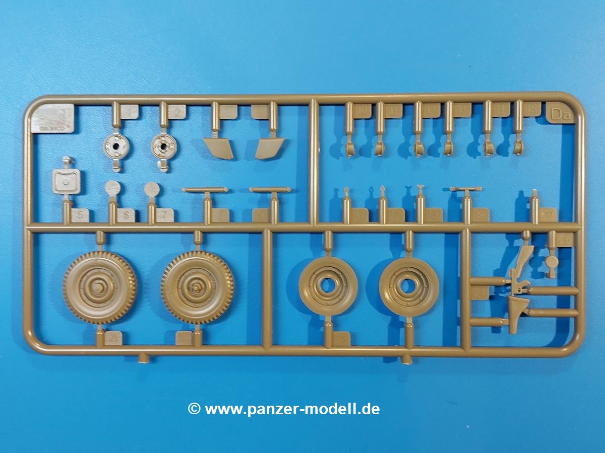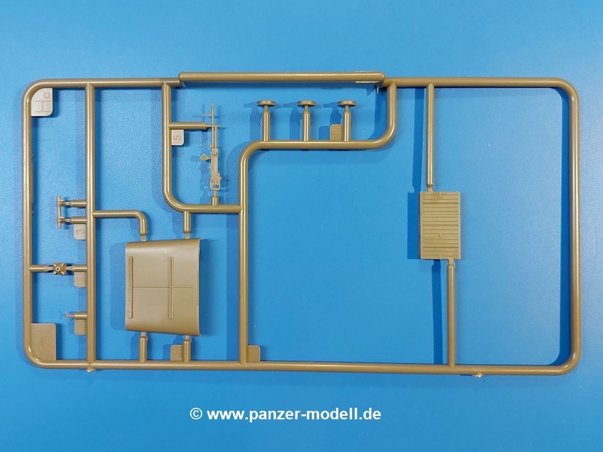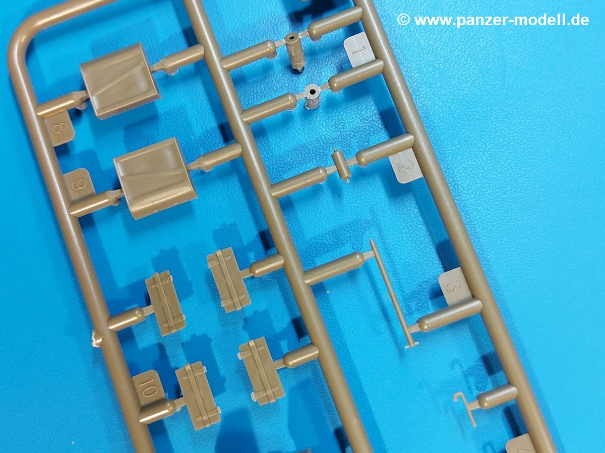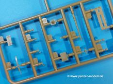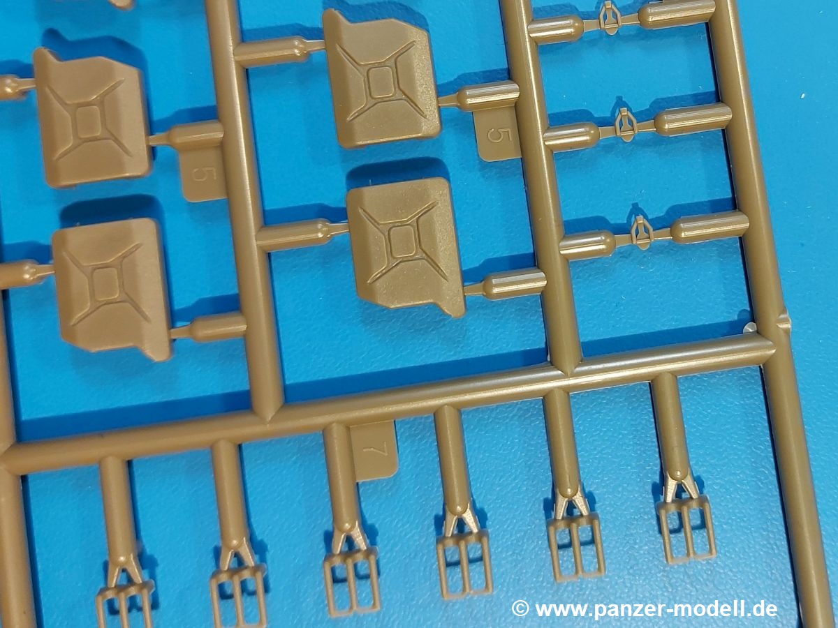 Das Original: Über "den Jeep" (formal: Truck, 1/4 ton, 4x4) braucht man eigentliche keine Worte mehr zu verlieren. Das in den 1940-ern meist bei Willys und Ford gebaute Allzweckfahrzeug war bei seinen Nutzern äußerst beliebt und fand Einsatz in den unterschiedlichsten Einheiten als Aufklärungsfahrzeug, Zugmaschine für leichte Anhänger und Geschütze usw. Allein im 2. Weltkrieg wurden fast 650.000 Jeeps gebaut und eingesetzt. Die U.S.A. lieferten ihn auch an alliierte Staaten wie Frankreich, Russland und Großbritannien. Auch heute existieren noch viele einsatzbereite Exemplare. Die Bausätze: Wer britische Jeeps bauen möchte, ist bei Bronco ganz gut aufgehoben. Der neueste Bausatz enthält gleich 2 davon einen der Aufklärer und einen der Fernmelder. So kommt es, dass einige Spritzlinge gleich doppelt vorhanden sind. Im großzügig dimensionierten Karton mit den Maßen 445 x 300 x 70 Millimeter befinden sich neben der 16-seitigen Bauanleitung, 2 PE-Platinen, Bindfaden und 2 Abziehbilderbogen (Decals) 16 olivgrüne Spritzlinge plus 2 Karosserien und 1 durchsichtiger Spritzling. Die 5 Spritzlinge der Figuren sind hellgrau, ebenso der Spritzling für den Korb und der mit den Gurttaschen. Da sich auch Teile anderer Versionen an den Spritzlingen befinden, bleibt einiges übrig. Diese Teile sind in der Übersicht ausgegraut. Alle Teile sind sauber gespritzt, ohne Sinkstellen, Versatz oder Fischhäute. Jedoch ist hier und da feiner Grat zu finden, der aber leicht zu entfernen ist und der Qualität insgesamt keinen Abbruch tut. Einige Auswerfermarken sind vorhanden, auffällig an der Unterseite der Karosserien und der Innenseite der Motorhauben. Bronco legt Wert auf kleinste Details, deshalb gibt so einige feine, aber auch kleine Teile bis hin zu separat anzubringenden Schraubenköpfen. Es empfiehlt sich, die Bauanleitung sehr gründlich zu studieren, damit man die beiden Fahrzeuge nicht durcheinanderwirft. Na, schauen wir mal, was uns geboten wird. Da ist zum Beispiel ein ziemlich kompletter Motor mit Zündspule, Vergaser, Abgaskrümmer, Auspuffrohr, Luftfilter, Keilriemen- und -scheiben, Lüfterrad, Kupplungsgehäuse, Schaltgetriebe, ein Verteilergetriebe und Kardanwellen zu Vorder- und Hinterachse. Im Motorraum hat man noch Kühler mit Scheinwerfern, Batterie, Hupe usw. Die Achsen werden an Blattfederpaketen befestigt, die jeweils mit Stoßdämpfern versehen werden. Die Vorderräder können geradeaus oder mit Lenkeinschlag gebaut werden. Man muss sich nur für die entsprechenden Gestänge entscheiden. Die Plastikräder sind mit Hersteller und Reifenangaben versehen und können drehbar gebaut werden. Die offene Karosserie bietet genug Gelegenheiten mit Details zu glänzen und Bronco nutzt das schamlos aus. Pedalerie, Schalthebel, Kraftstofftank, Sitze, Lenkrad und ein sehr schönes Armaturenbrett, für dessen Instrumente und Hinweisschilder Decals beiliegen, die man besser vor dem Einbau anbringt. Man kann wählen, ob man das gefaltete Gestänge der Plane anbringt oder nicht. Alle Versionen bekommen ein sehr feines Funkgerät Nr. 22 mit PE-Schutzgitter. Da das Funkgerät sehr gut einzusehen ist, kann man sich bemalungstechnisch entsprechend austoben. Kommen wir zu den Unterschieden. Das mache ich besser in einer Aufzählung: