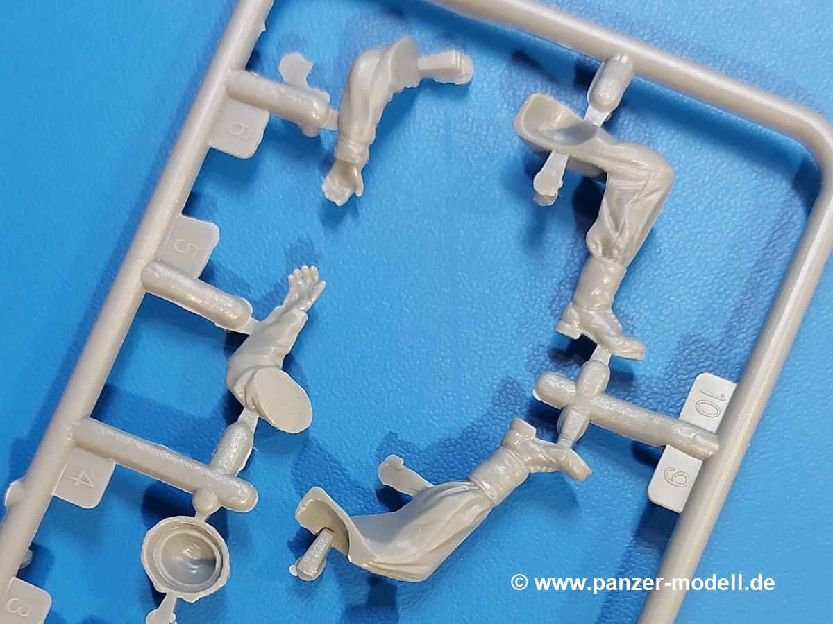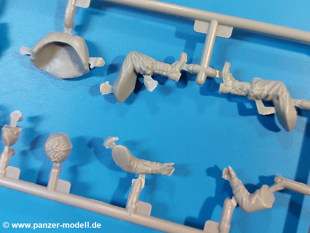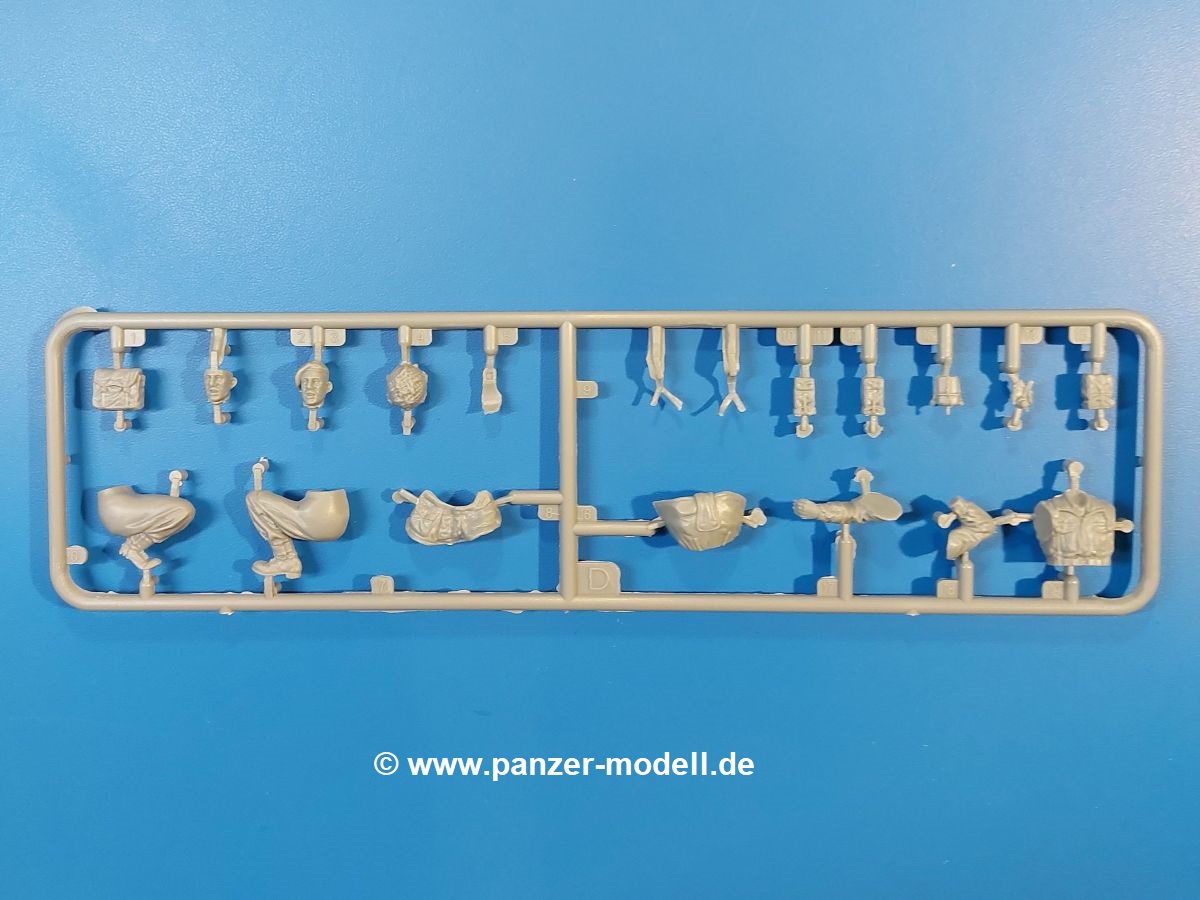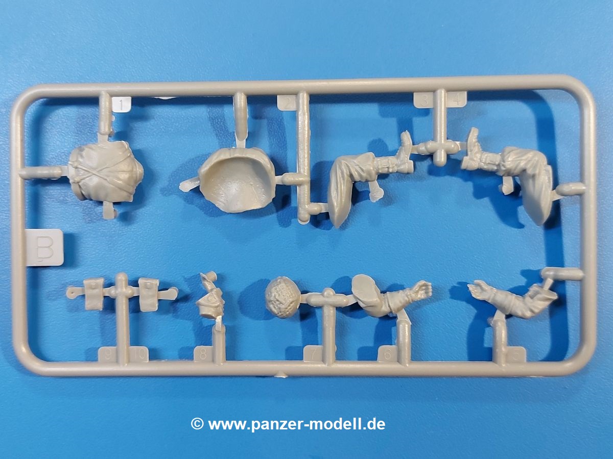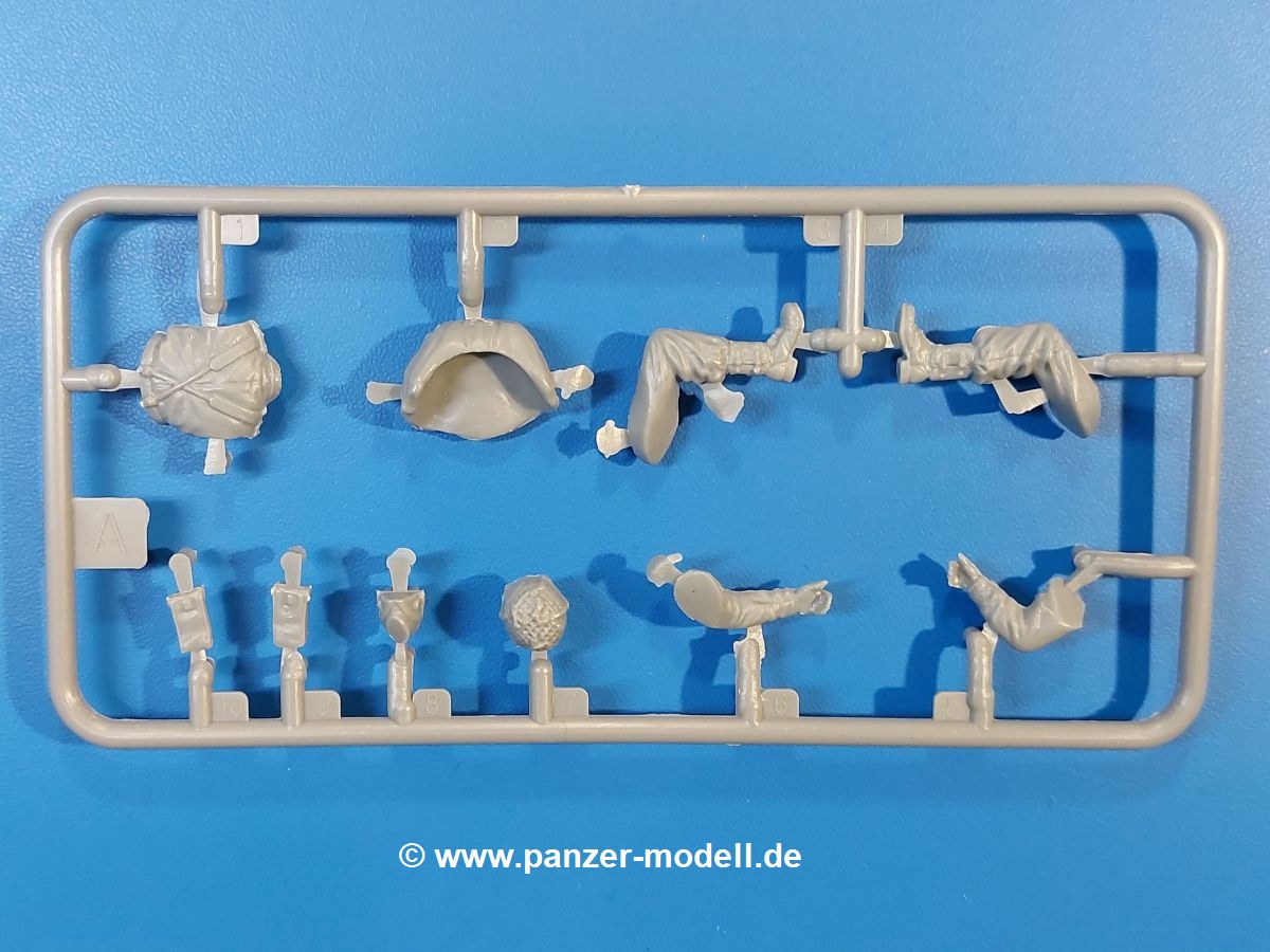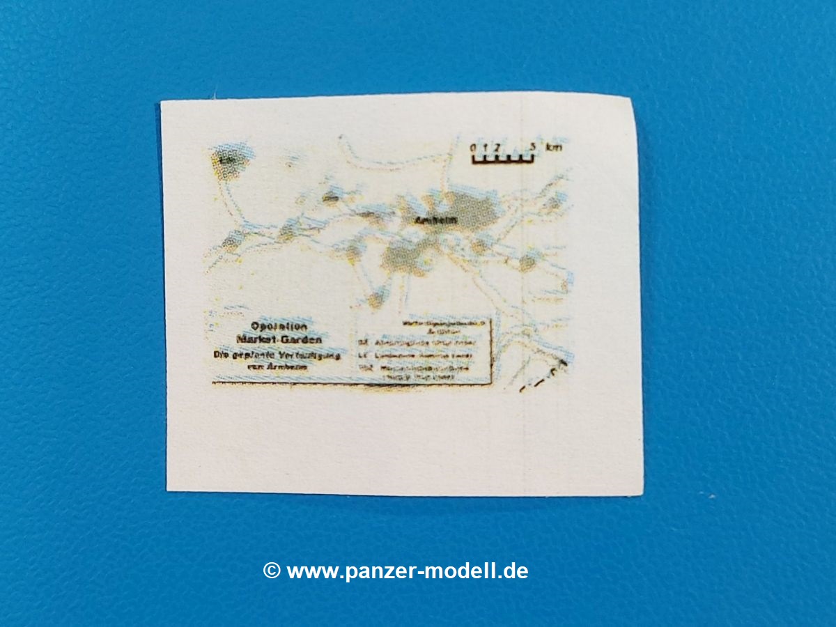 Die Jeeps können mit 5 Figuren besetzt werden 3 Aufklärer, 2 Fernmelder. Jede Figur ist in Arme, Beine, Hüfte, Rumpf und Kopf aufgeteilt. Dazu kommen Helm, Waffen, Magazintaschen und andere Ausrüstung je nach Soldat. Beim Funker kann man entweder den Kopf mit Barrett verwenden oder einen anderen, dem man noch den Stahlhelm aufsetzen muss. Ich bin mir nicht sicher, ob der Funker in seiner Auslegung auf den Rücksitz passt. Das muss der Bau dann zeigen. Der Truppführer der Aufklärer hält eine Karte in der Hand. Die Karte ist beschriftet mit „Operation Market Garden Die geplante Verteidigung von Arnheim“ Bronco Model ich habe Fragen…, obwohl die Beschriftung mit bloßen Augen kaum zu lesen ist! Alle Figuren haben schöne Gesichter. Faltenwurf und Detaillierung der Kleidung und Ausrüstung sind toll. Die Dienstgradabzeichen gibt es als Decals dazu. Es gibt Markierungen für 3 Fahrzeuge, aber ohne Angaben von Einheiten. Diese müsste man anhand der Markierungen selbst erforschen, aber Uniformen und „die Karte“ implizieren, dass es sich um Fahrzeuge während der Operation Market Garden im September 1944 handelt.